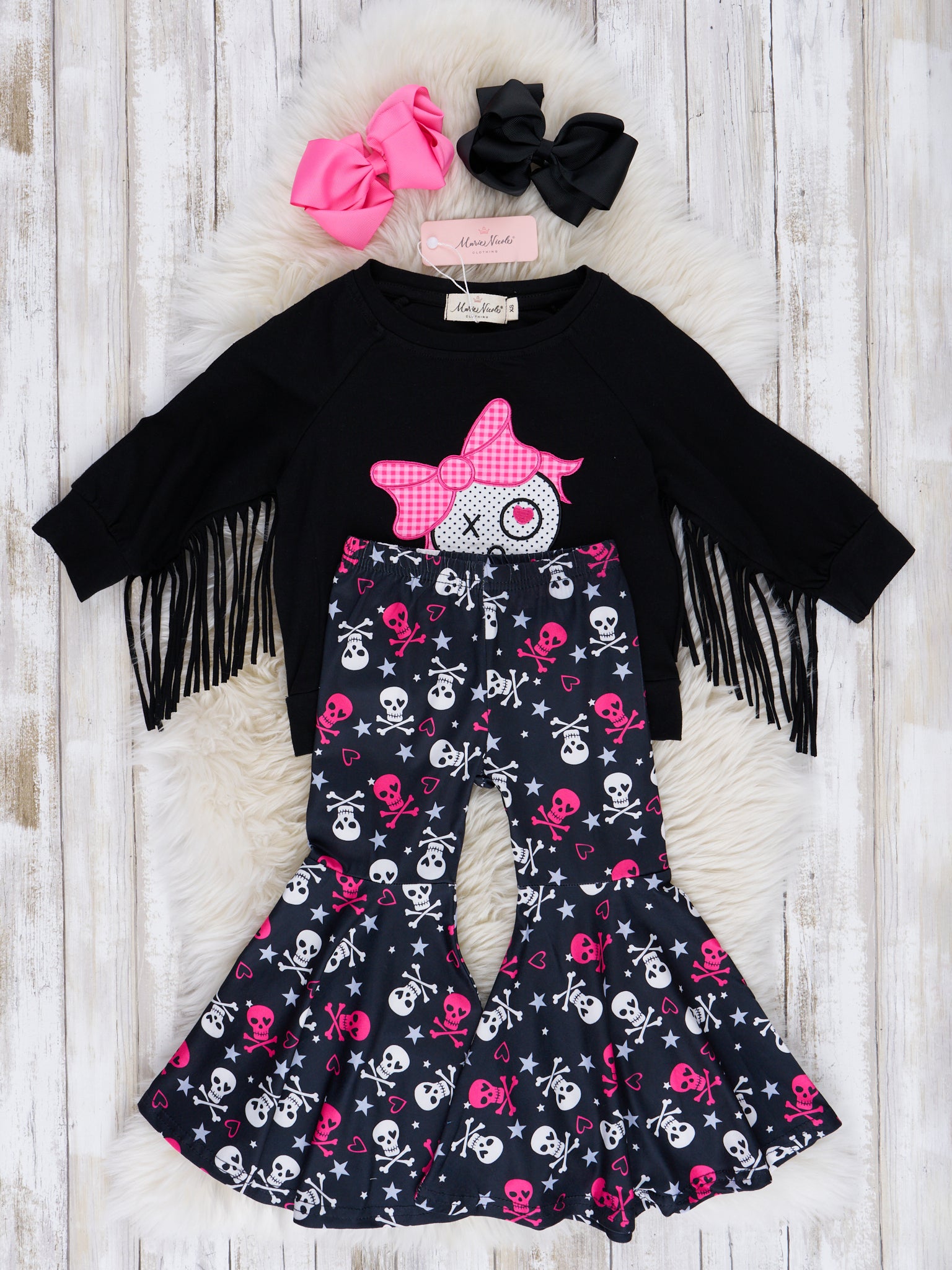 Pink & Black Fringe Skull Bell Bottom Outfit