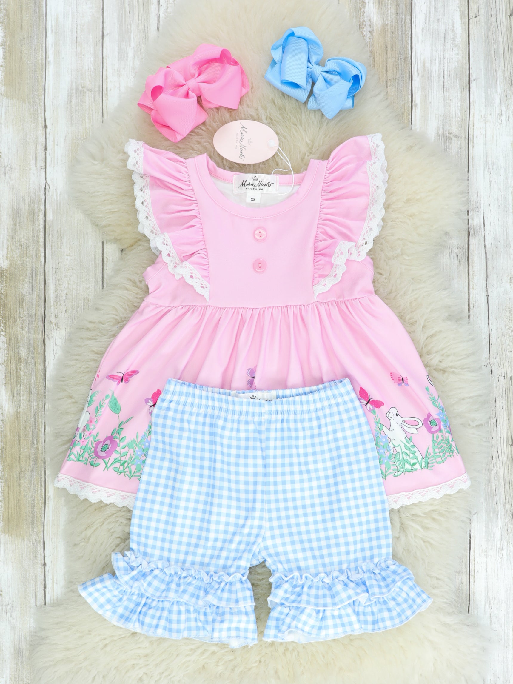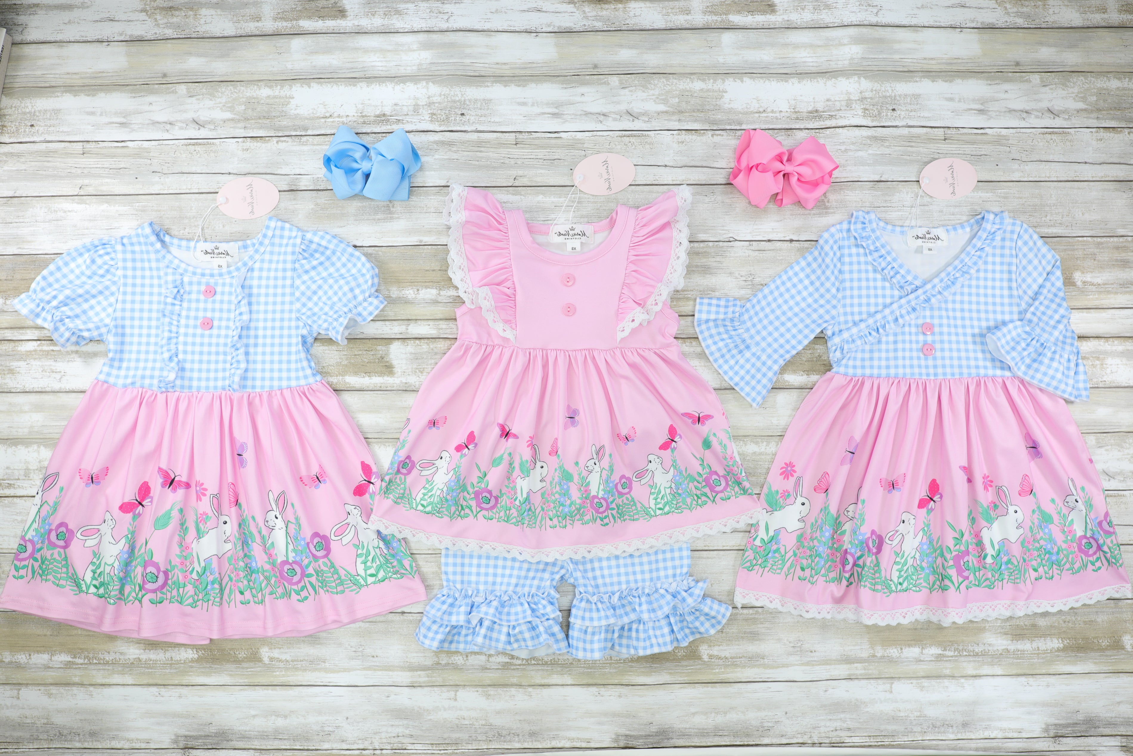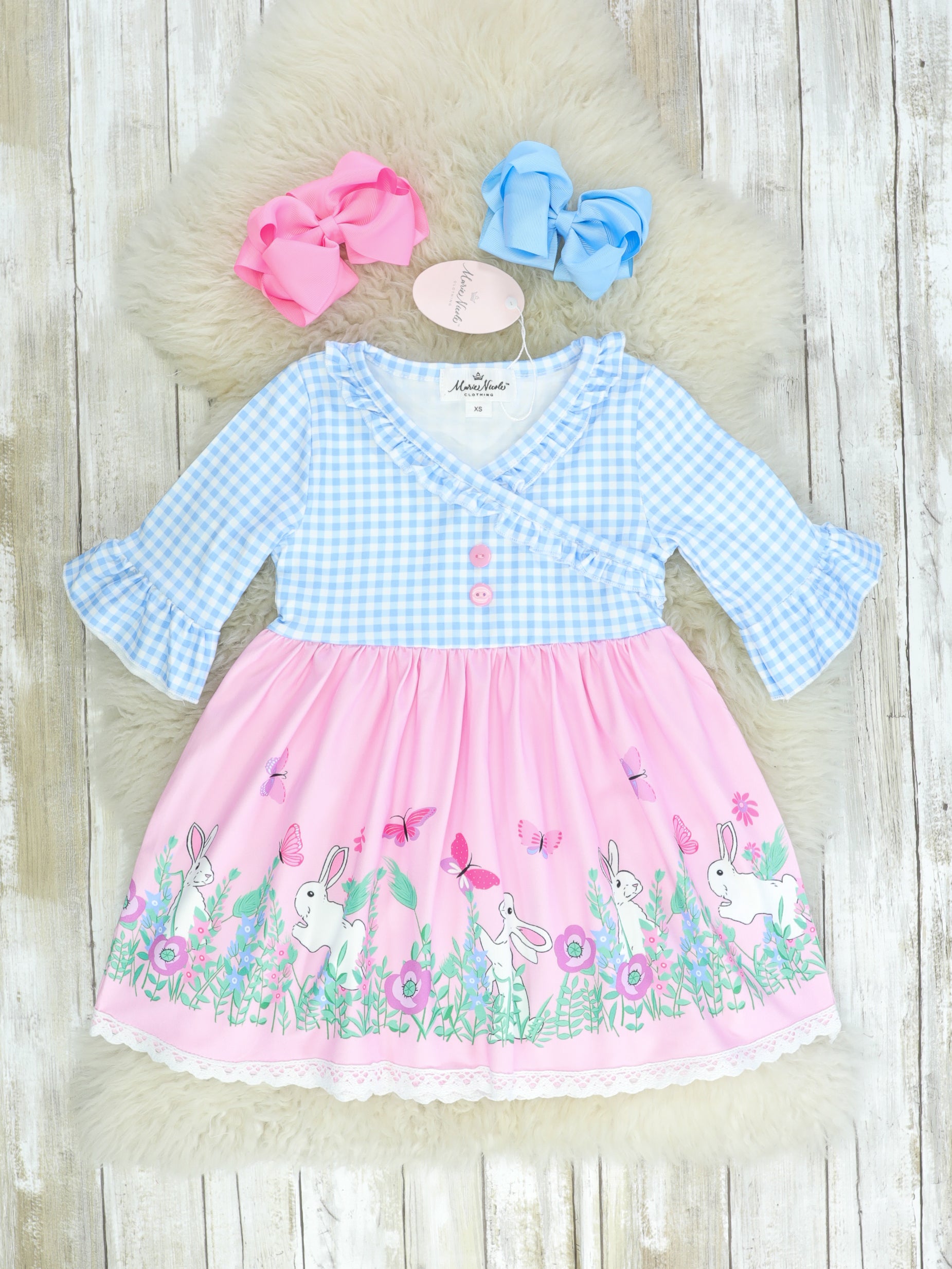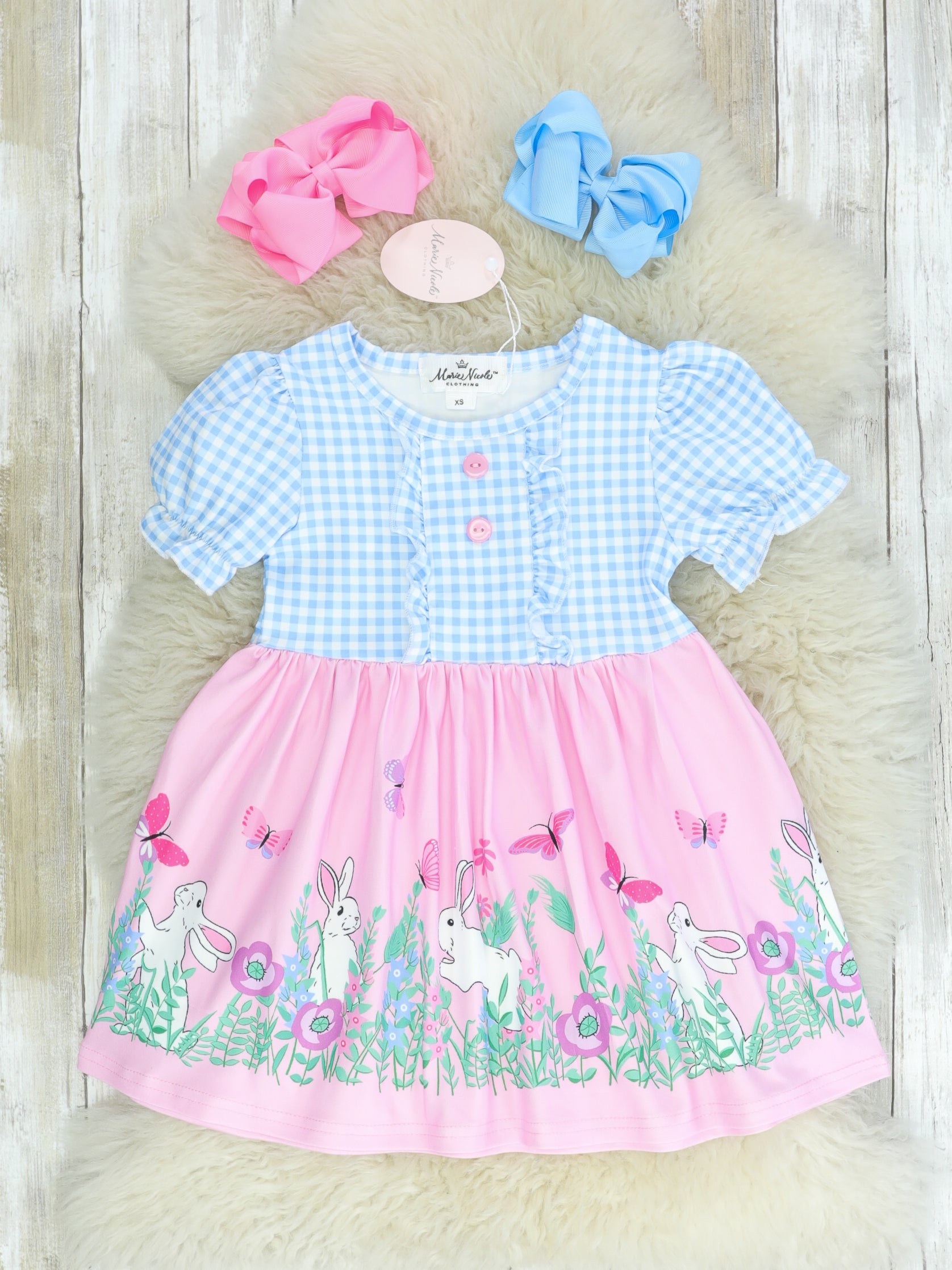 Pink & Blue Spring Scene Puffy Sleeve Dress