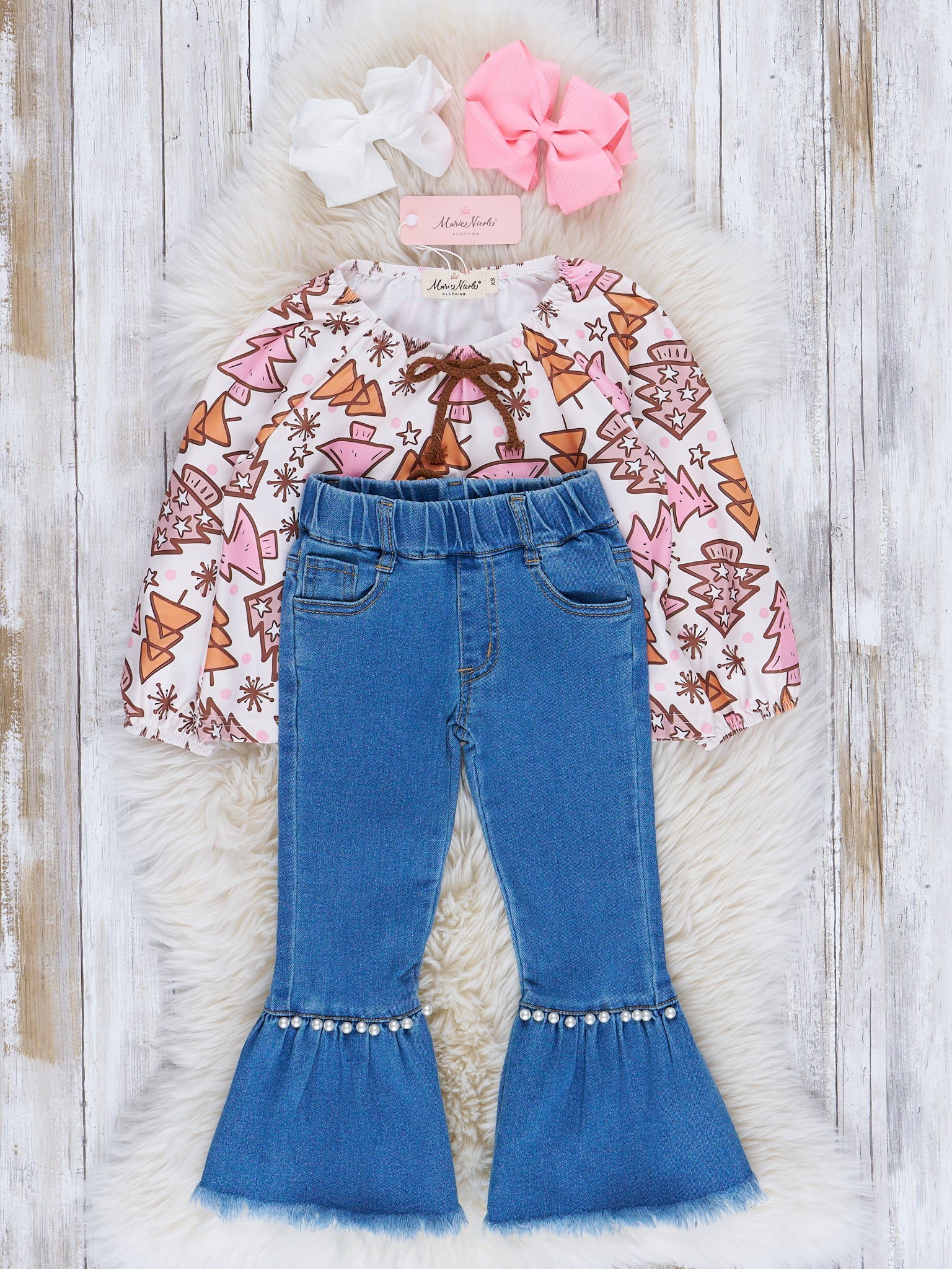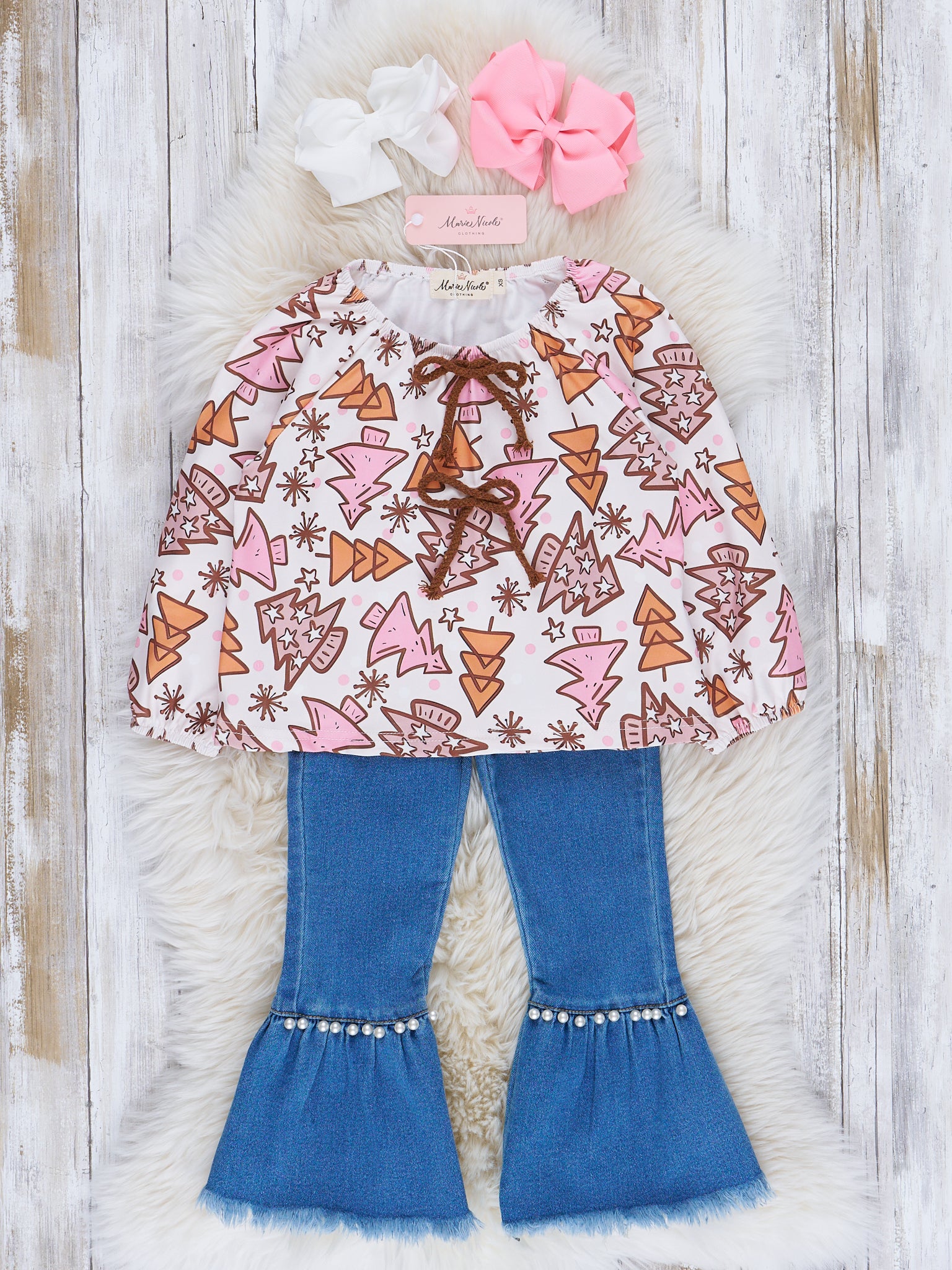 Pink & Brown Christmas Tree Doodles Bell Bottom Outfit