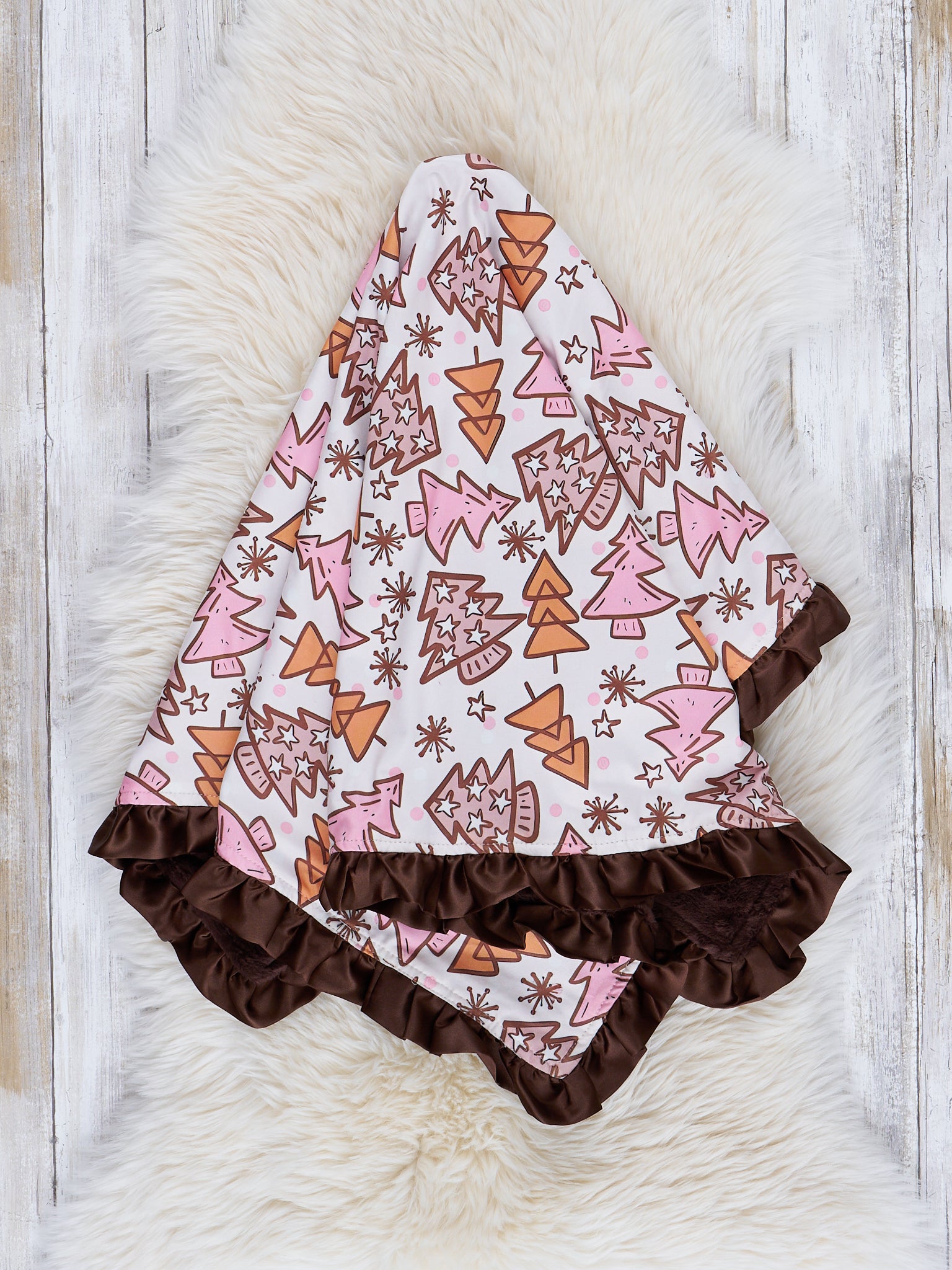 Pink & Brown Christmas Tree Doodles Ruffle Minky Blanket