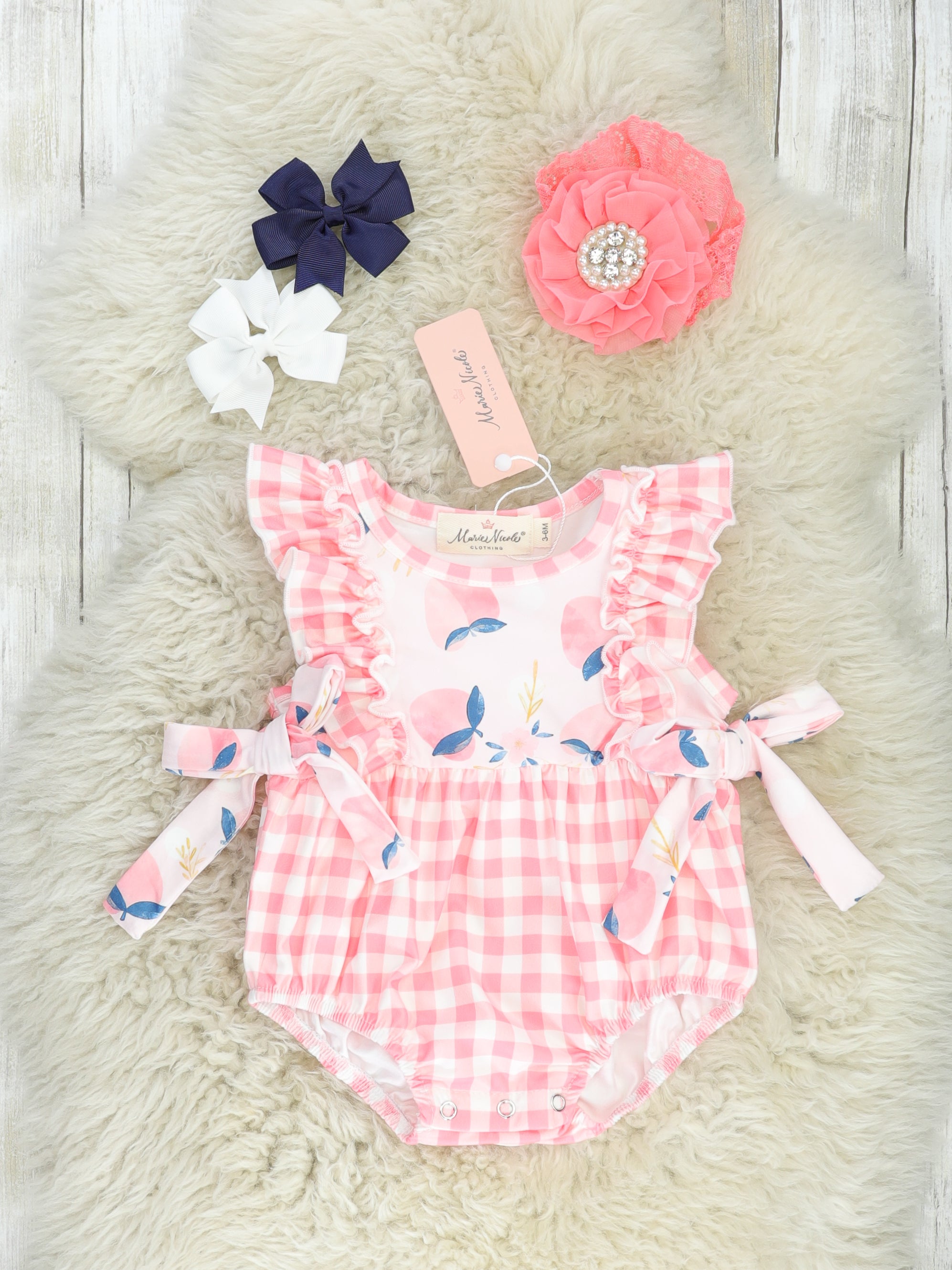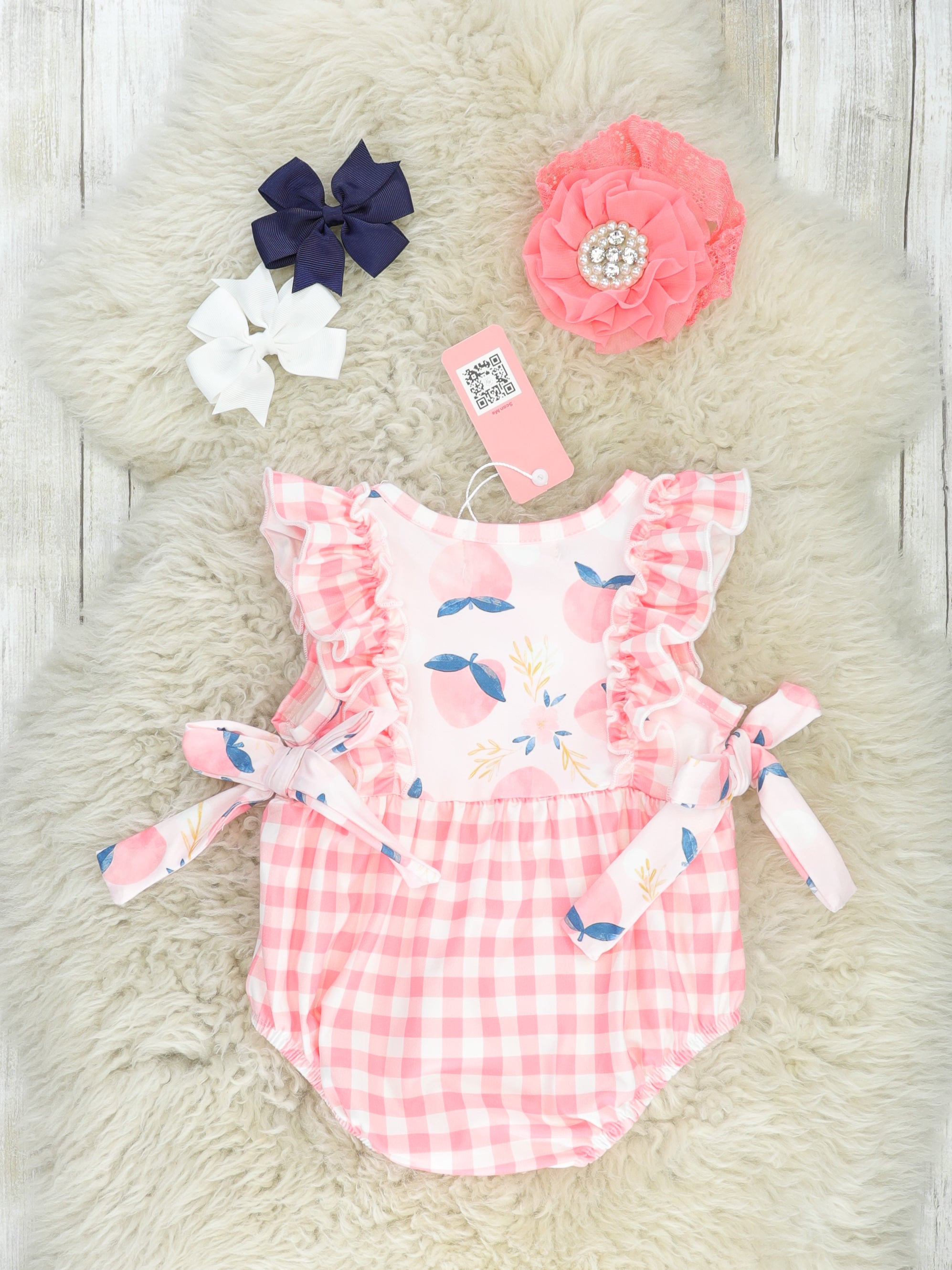 This sweet sister set is sure to be a hit! Stop and smell the peaches in this pink gingham bubble adorned with frilly ruffles. It'll be with you through thick and thin, just like a real sister!