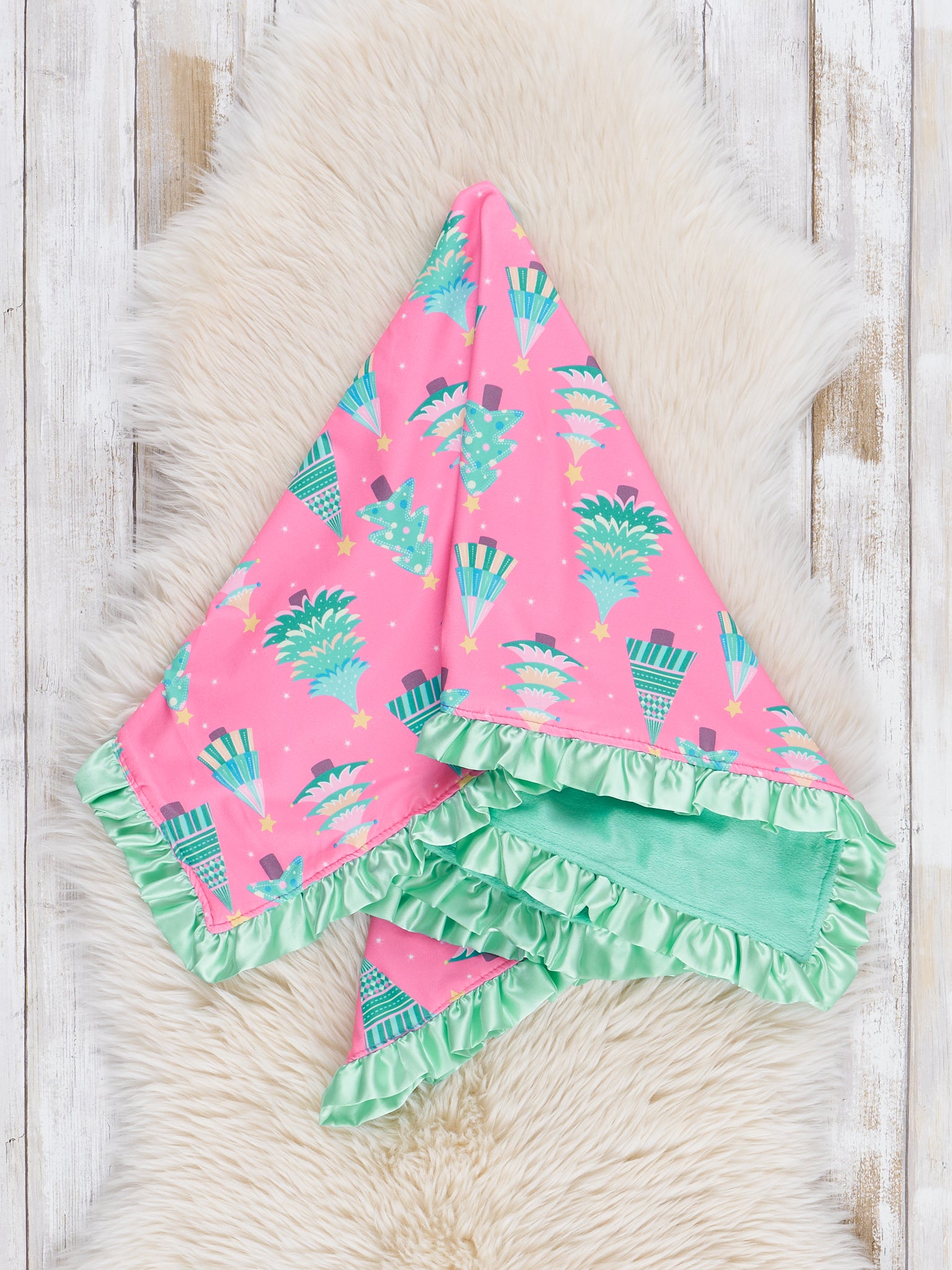 Pink & Green Oh Christmas Tree Ruffle Minky Blanket