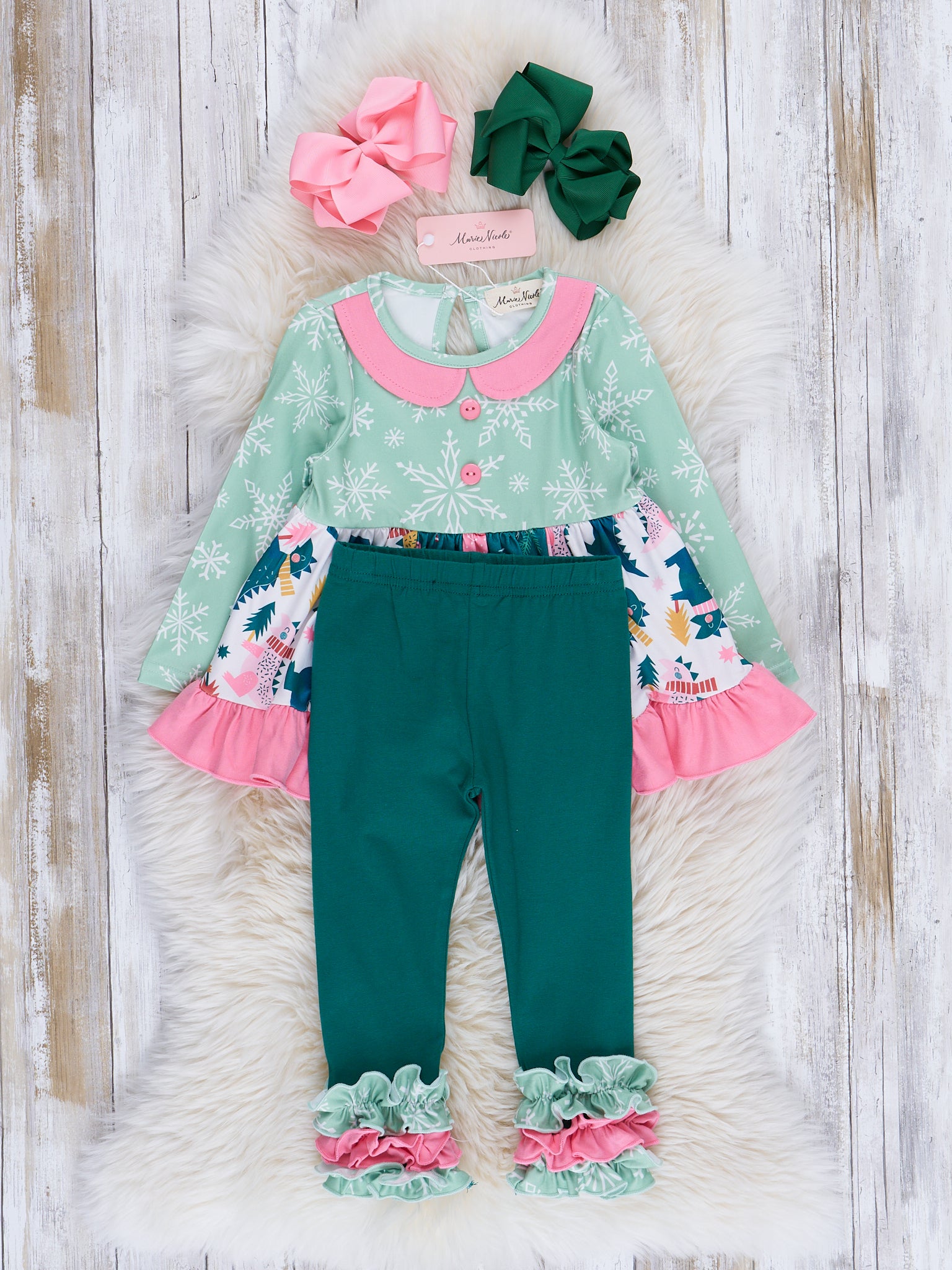 Pink & Green Snowflakes & Dinos Ruffle Outfit