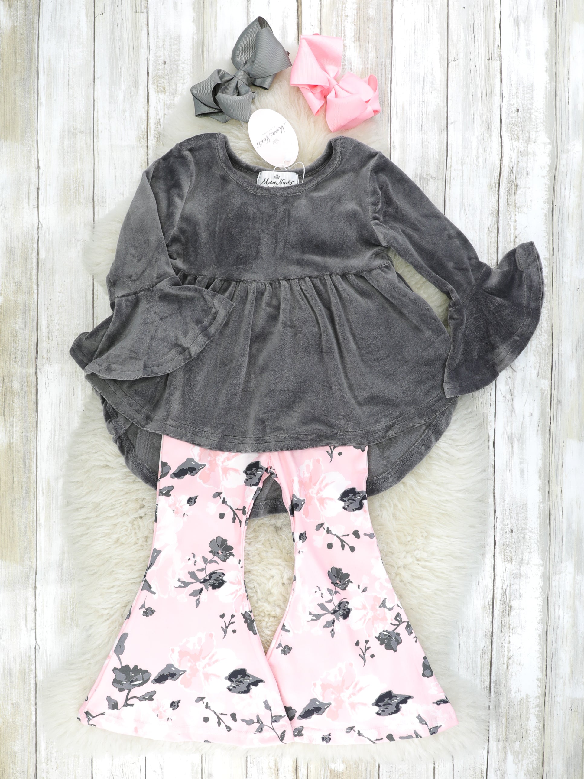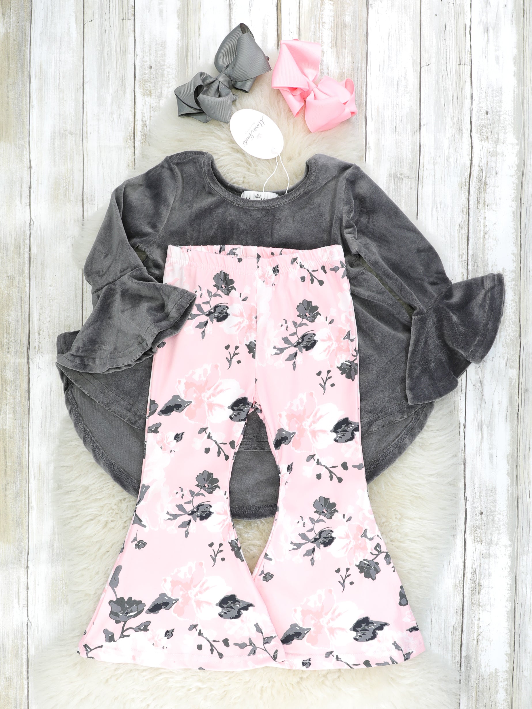 Pink & Grey Floral Velvet Bell Bottom Outfit