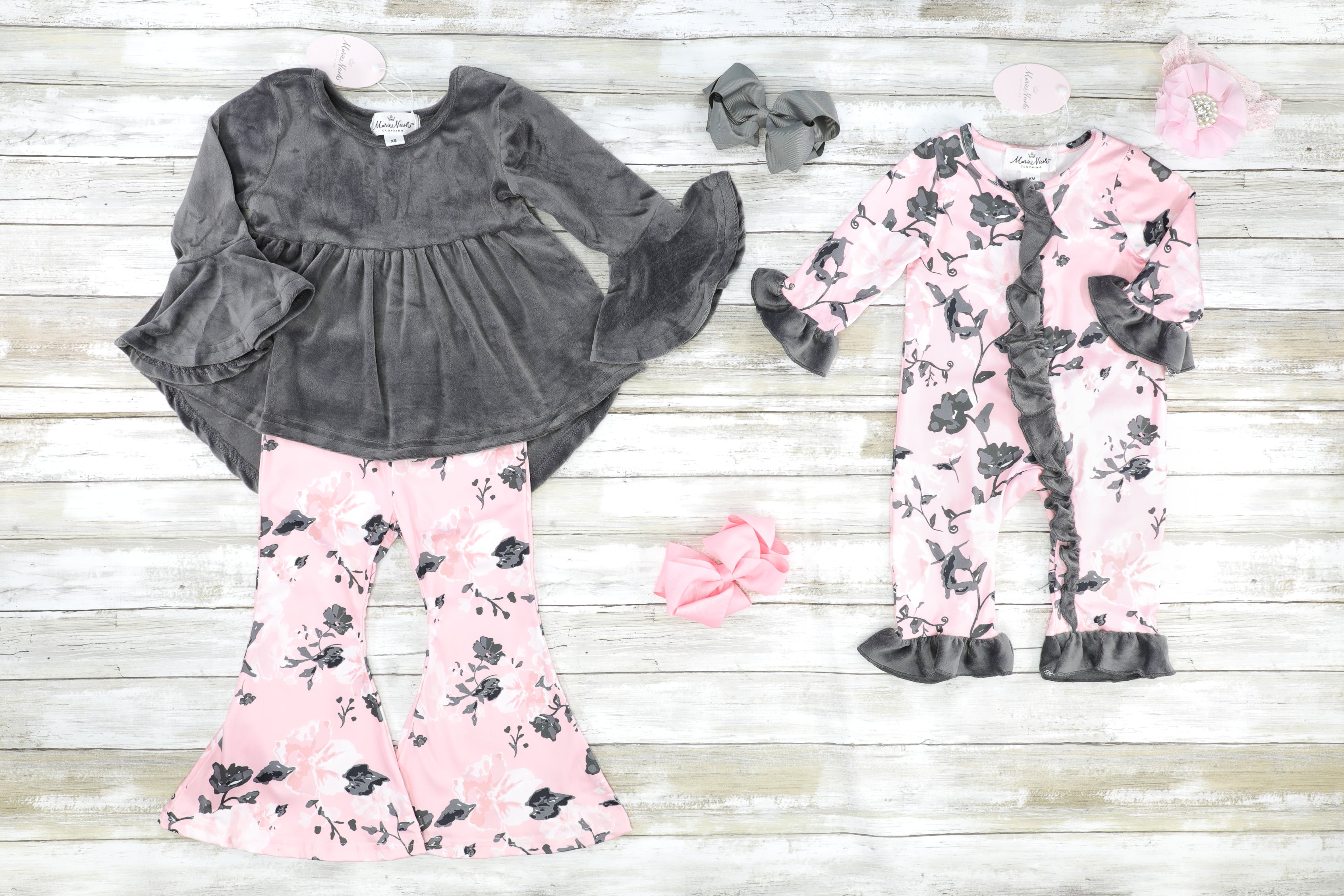Pink & Grey Floral Velvet Sister Set