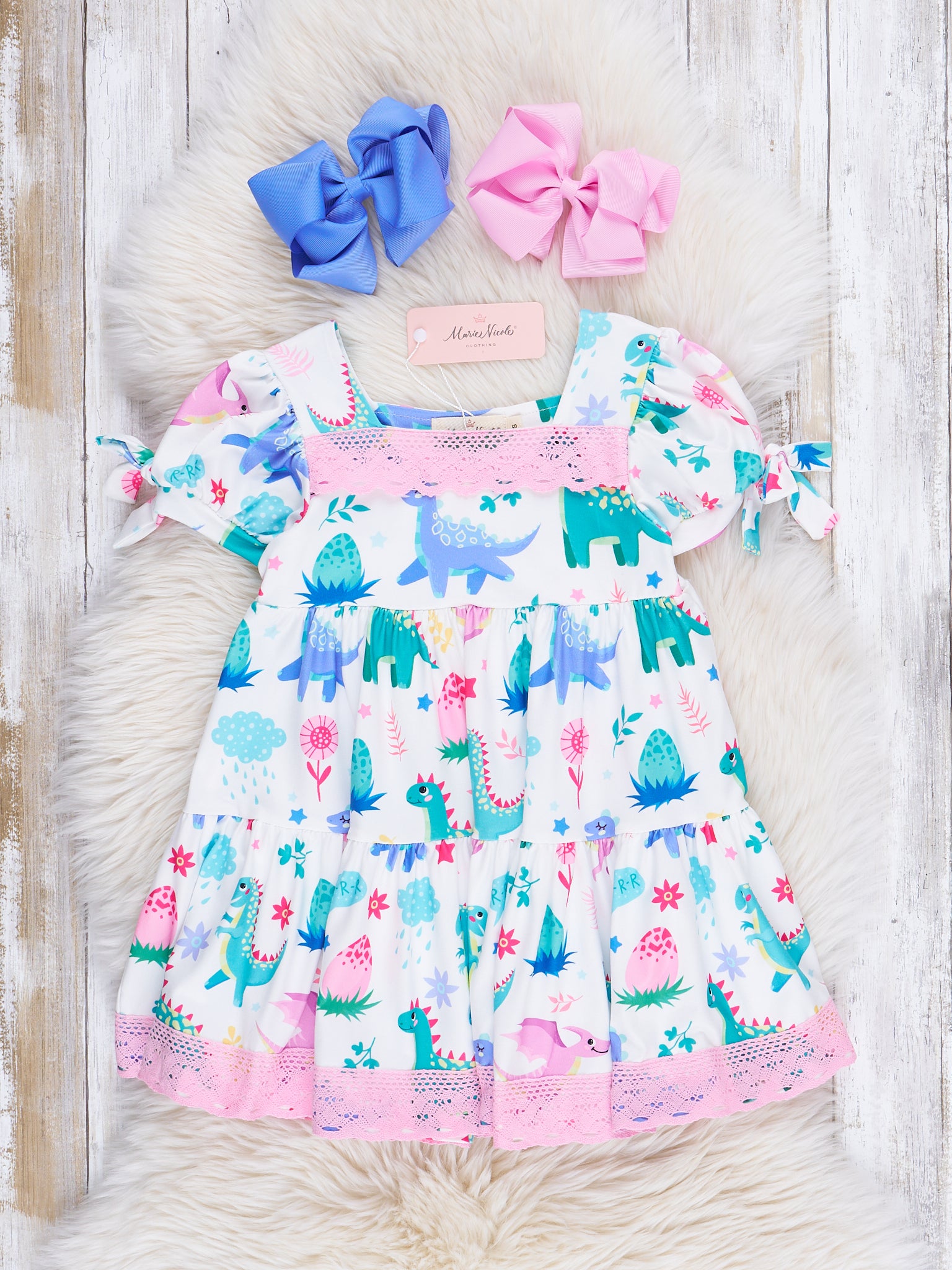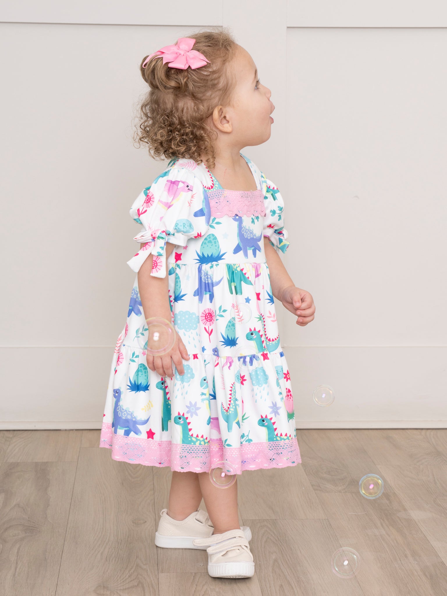 Pink Lace Watercolor Dinosaur Ruffle Dress