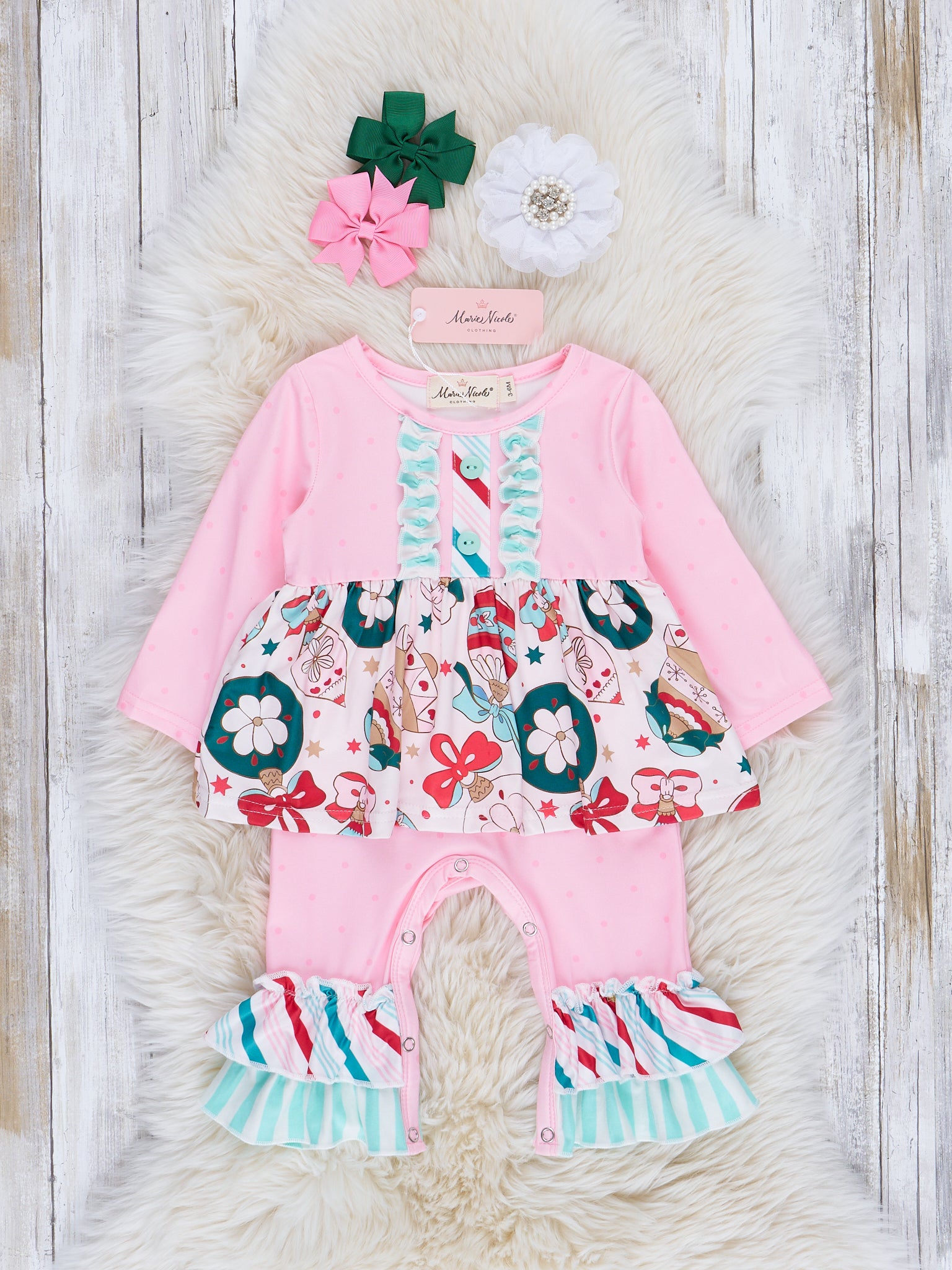 Pink & Mint Holiday Ornaments Ruffle Romper