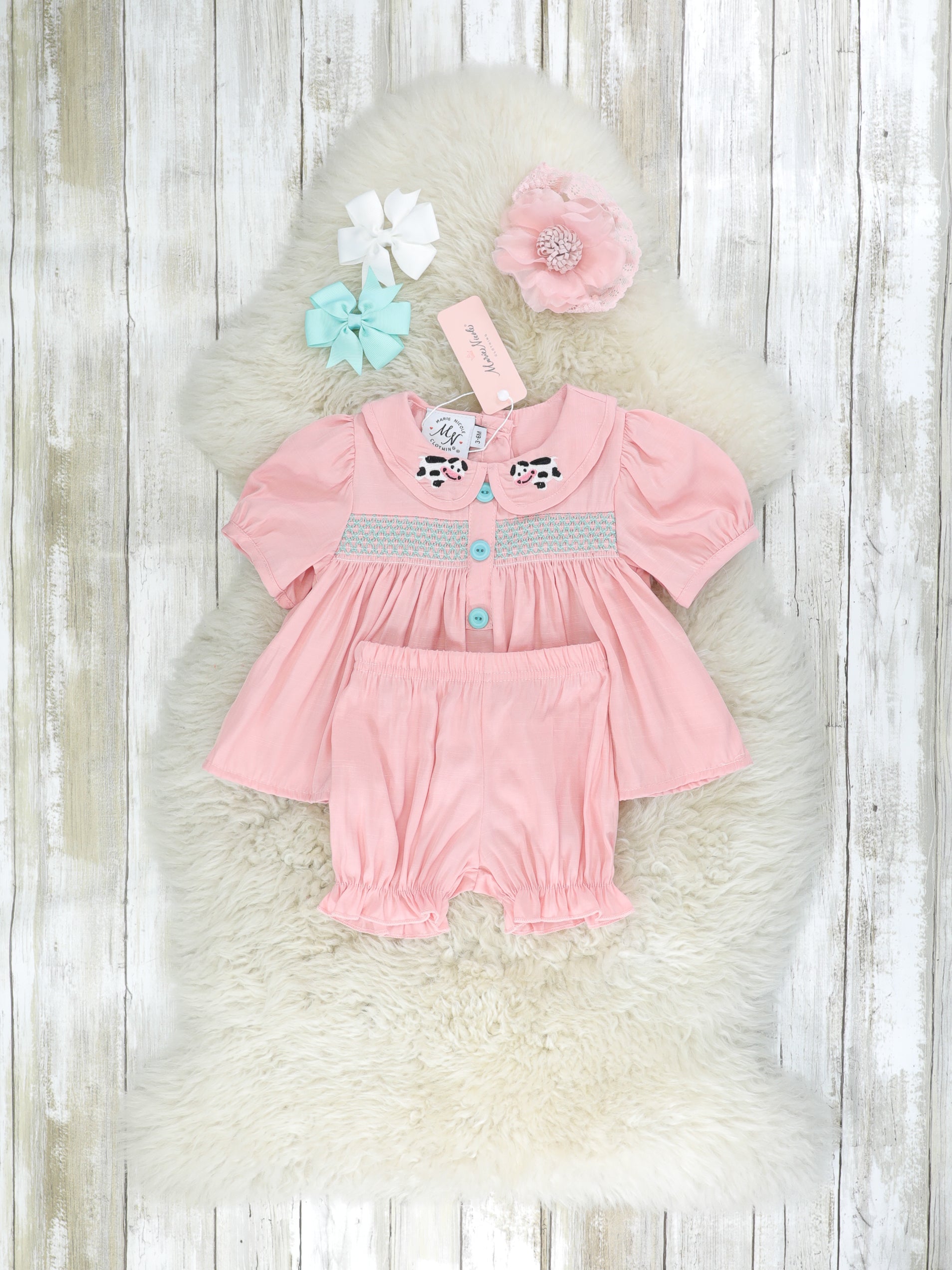 Pink Smocked Vintage Cow Top & Bloomers Set