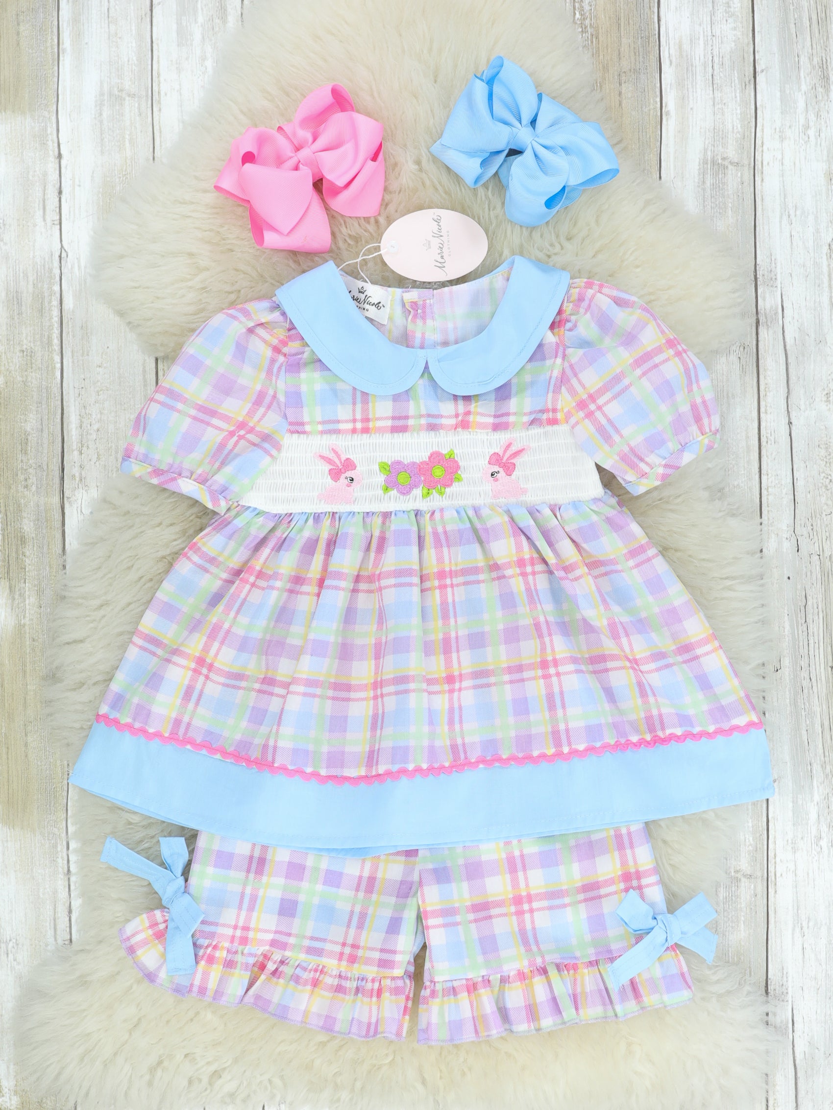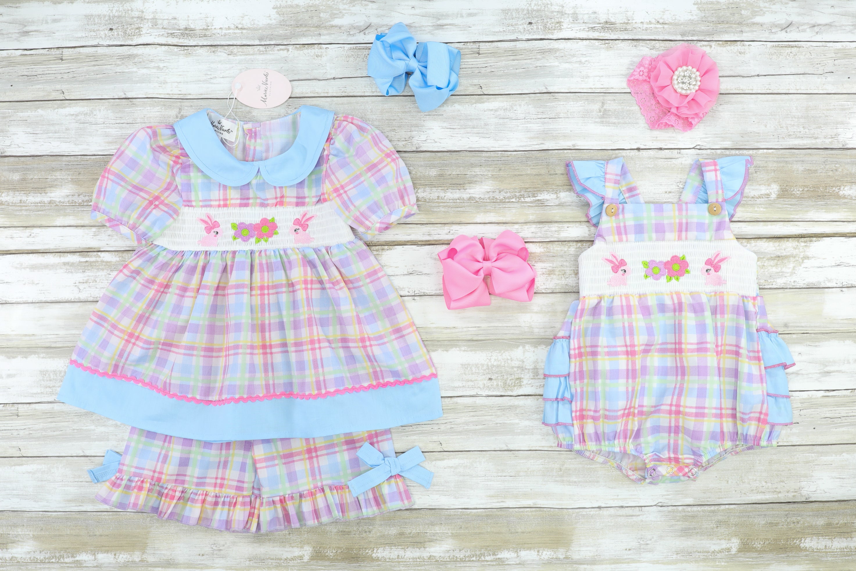Home › Plaid Pastel Smocked Bunnies Sister Set