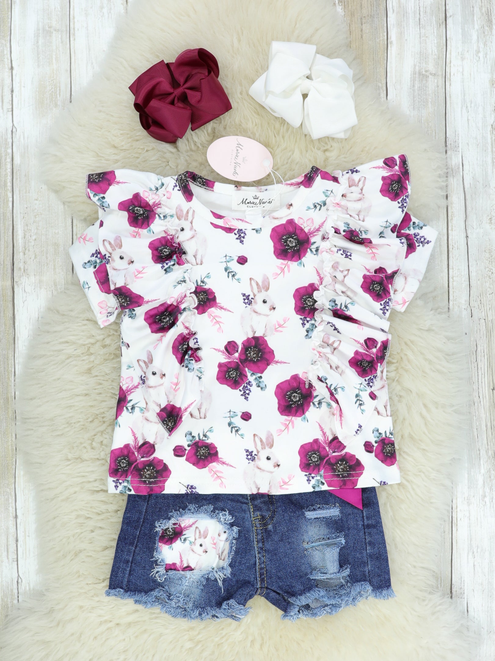 Plum Floral Bunny Ruffle Top & Distressed Denim Shorts