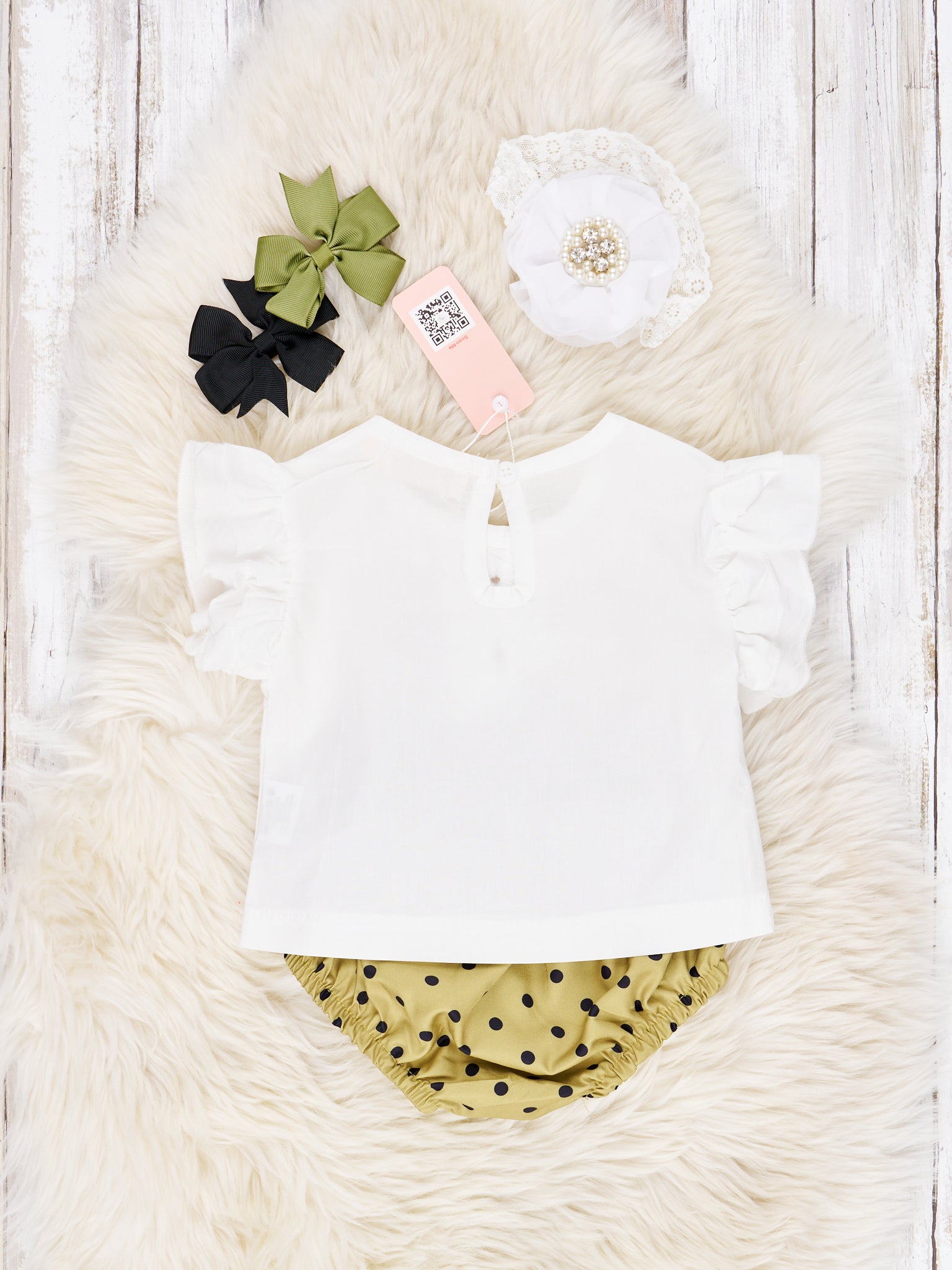 White Ruffle Top & Green Polka Dot Bloomers Outfit