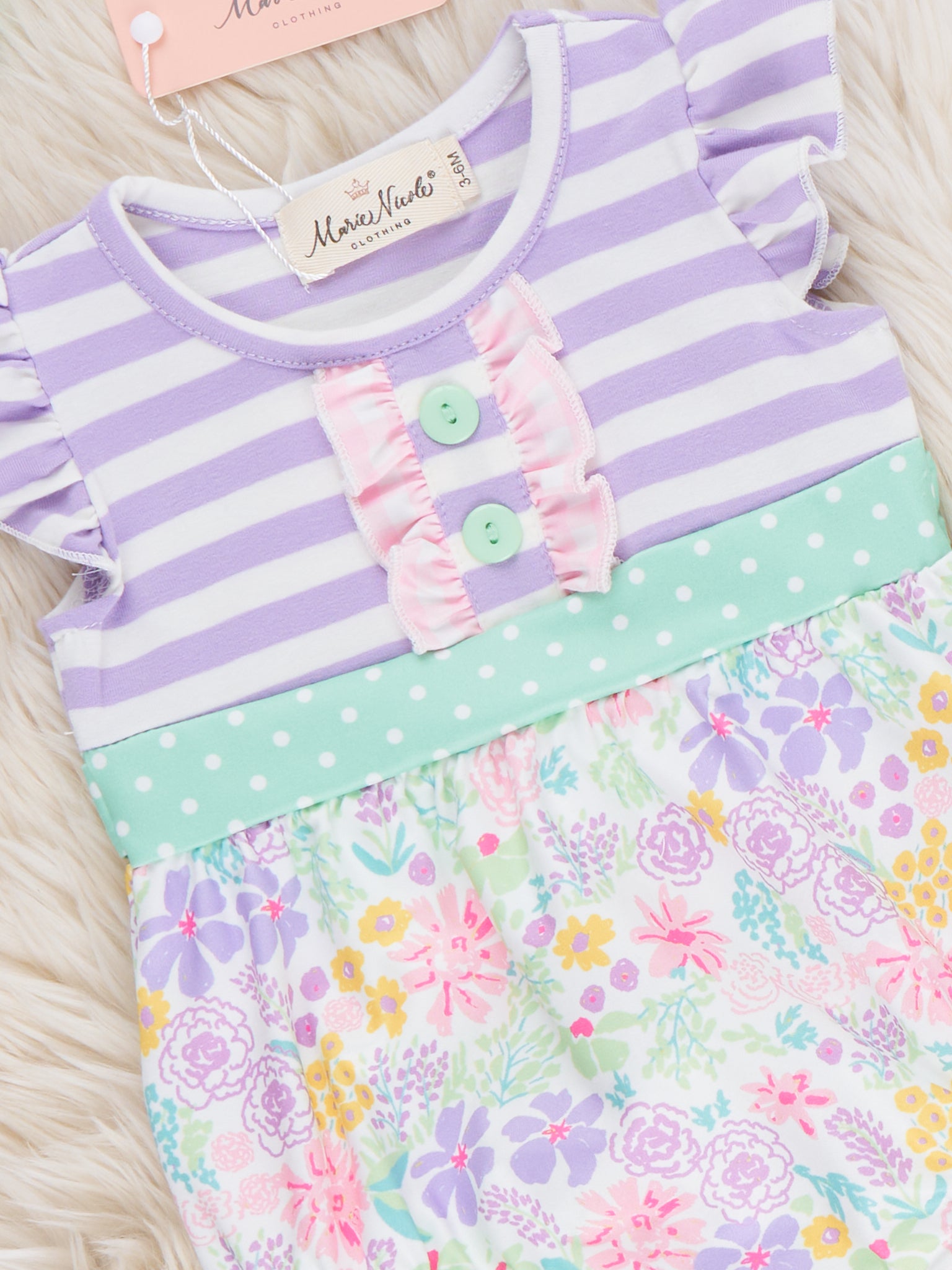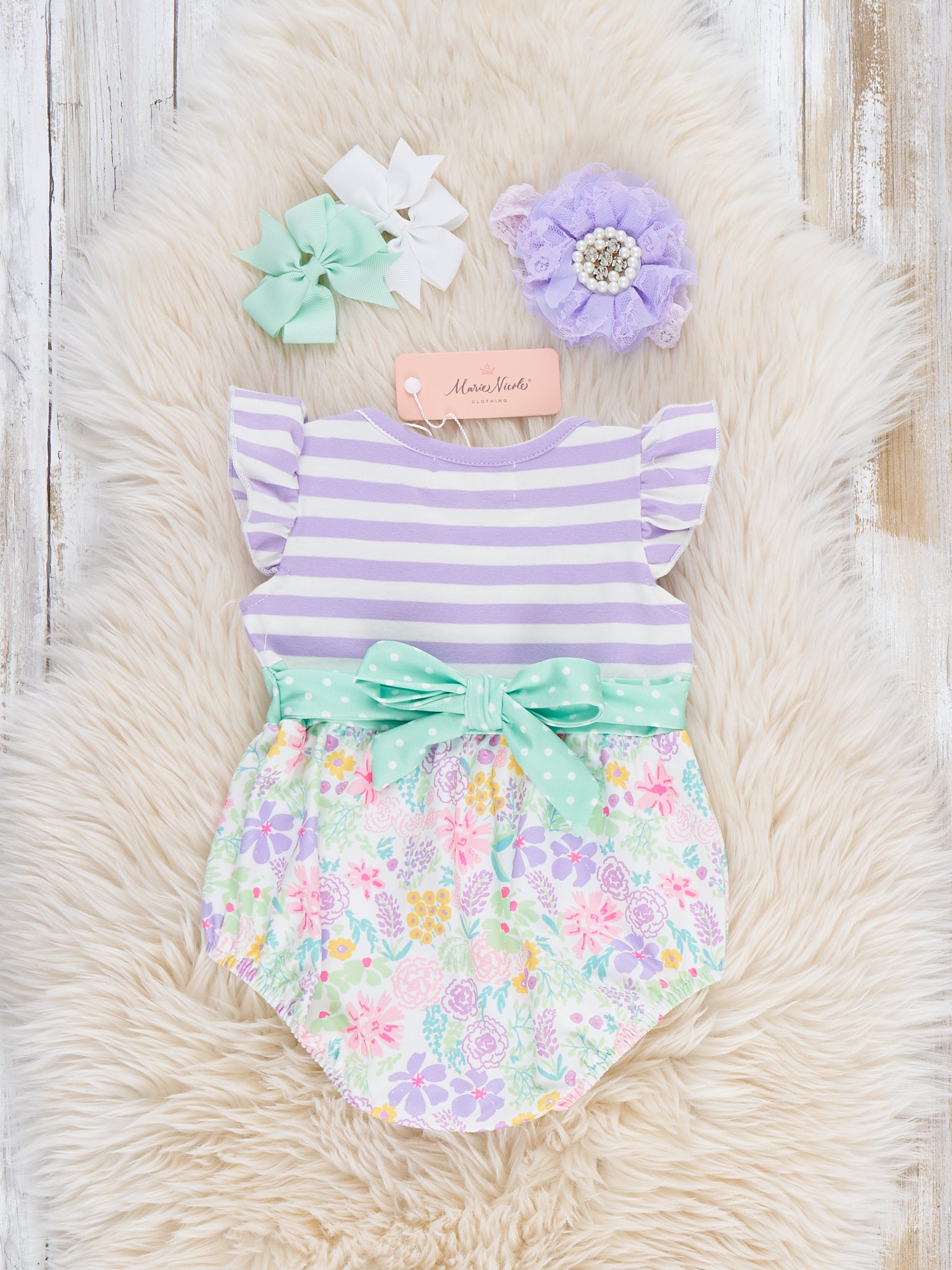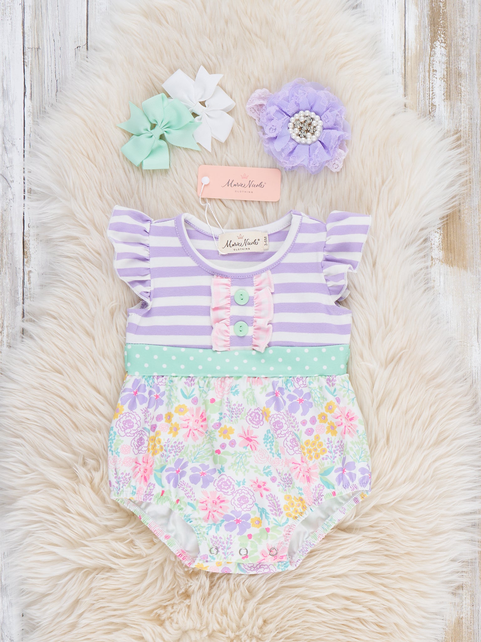 The Springtime Petals & Stripes Ruffle Bubble by Marie Nicole Clothing blends flutter sleeves, a softly gathered floral bubble, and a sweet contrast waistband for extra charm. Stretchy leg openings and snap closures make changes quick and comfy, creating an adorable one-piece outfit perfect for playdates, garden strolls, and spring photo moments.