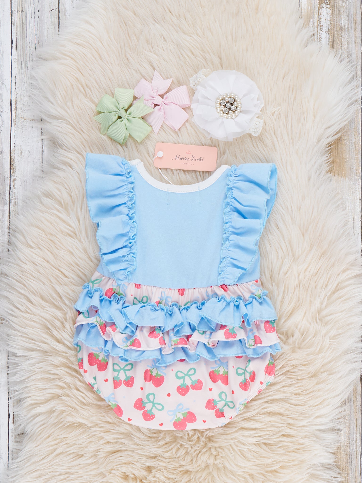 The Strawberry Bow Embroidered Ruffle Bubble by Marie Nicole Clothing serves up berry-sweet charm with flutter sleeves, a bow-topped bodice, and a twirly ruffle bubble silhouette. Soft fabric, elastic leg openings, and convenient snaps keep baby comfy and make changes easy, creating a picture-perfect one-piece for sunny outings, playdates, and photo moments.