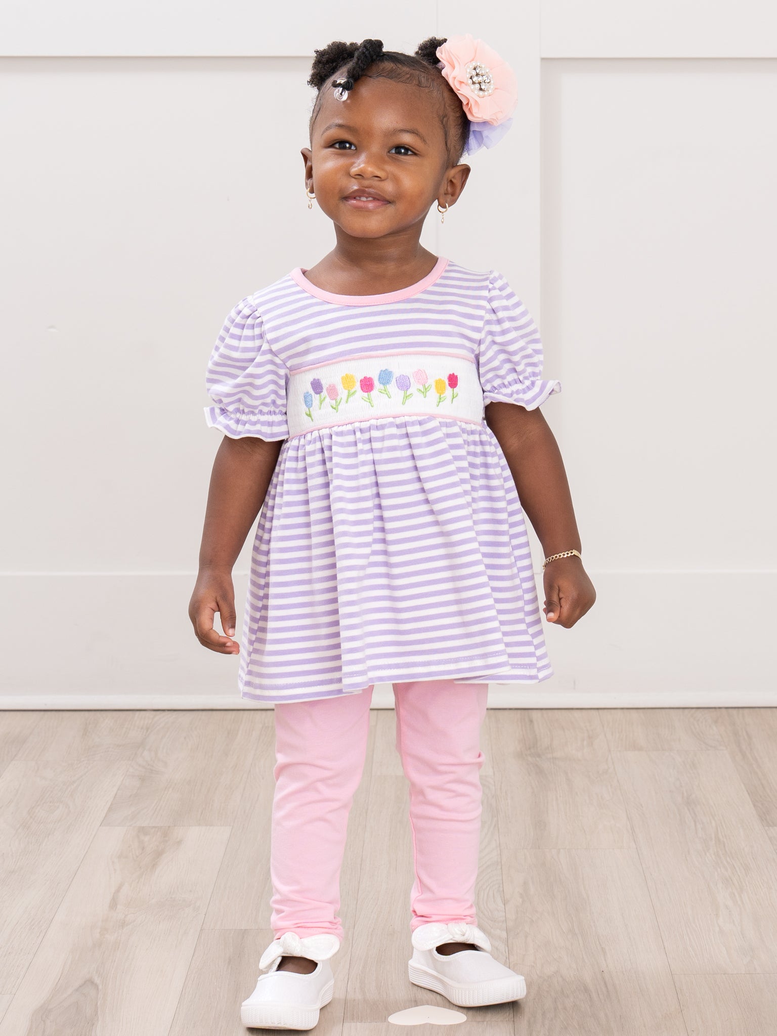 Tiny Spring Blossoms Smocked Ruffle Outfit by Marie Nicole Clothing features a playful striped top with delightful smocked flower details and soft ruffle sleeves, paired with comfortable knit leggings. Ideal for spring celebrations or everyday play, this set adds boutique charm and cheerful whimsy to your child’s wardrobe.