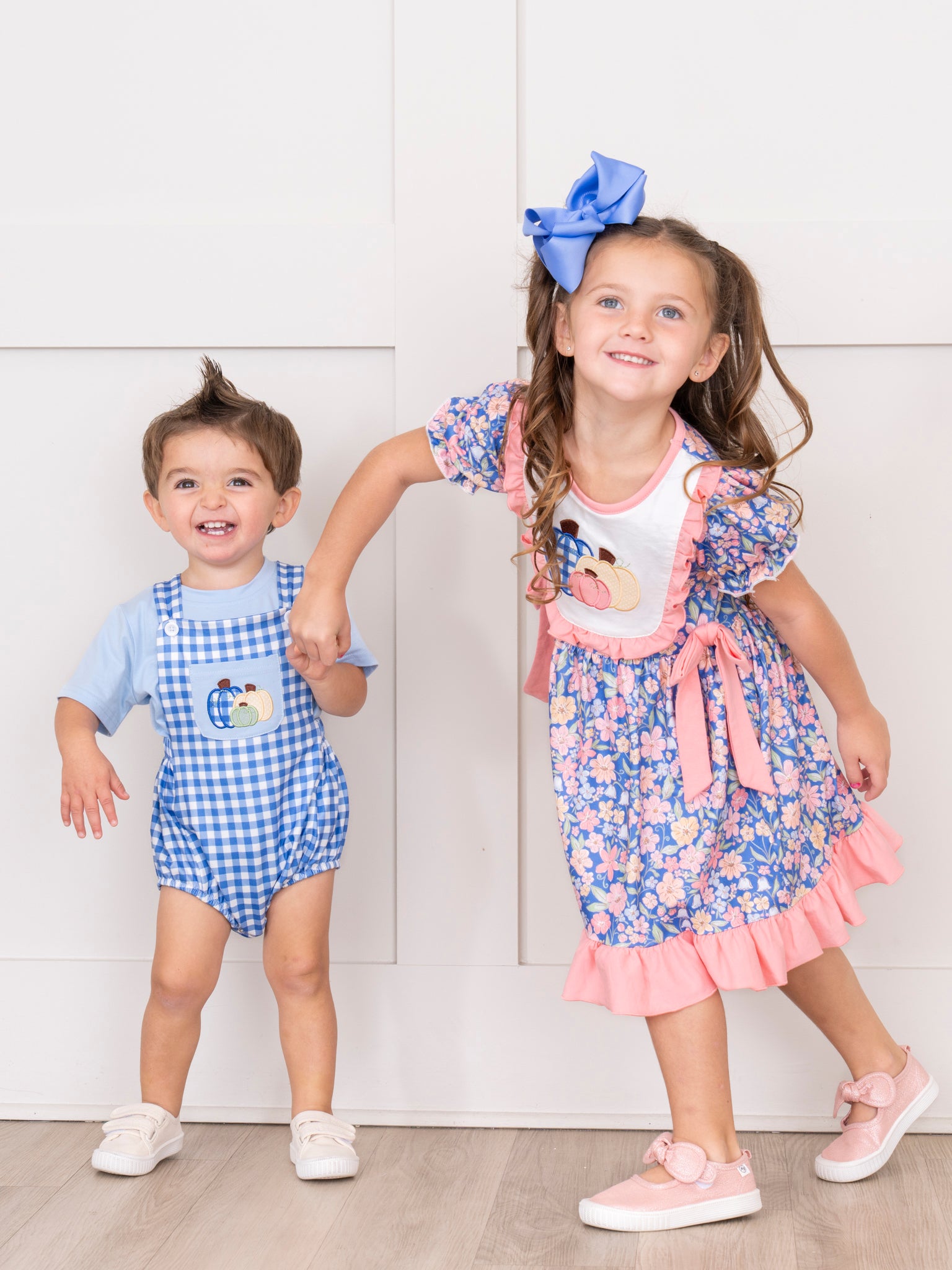 A harvest full of pumpkins and flowers! The Pumpkin Botanicals Embroidered Bow Ruffle Dress is a celebration of floral fall beauty. With bow and ruffle embellishments, soft fabric, and pumpkin embroidery, this pretty piece by Marie Nicole Clothing is sure to charm. Your little girl will love wearing this during autumn gatherings and nice occasions!