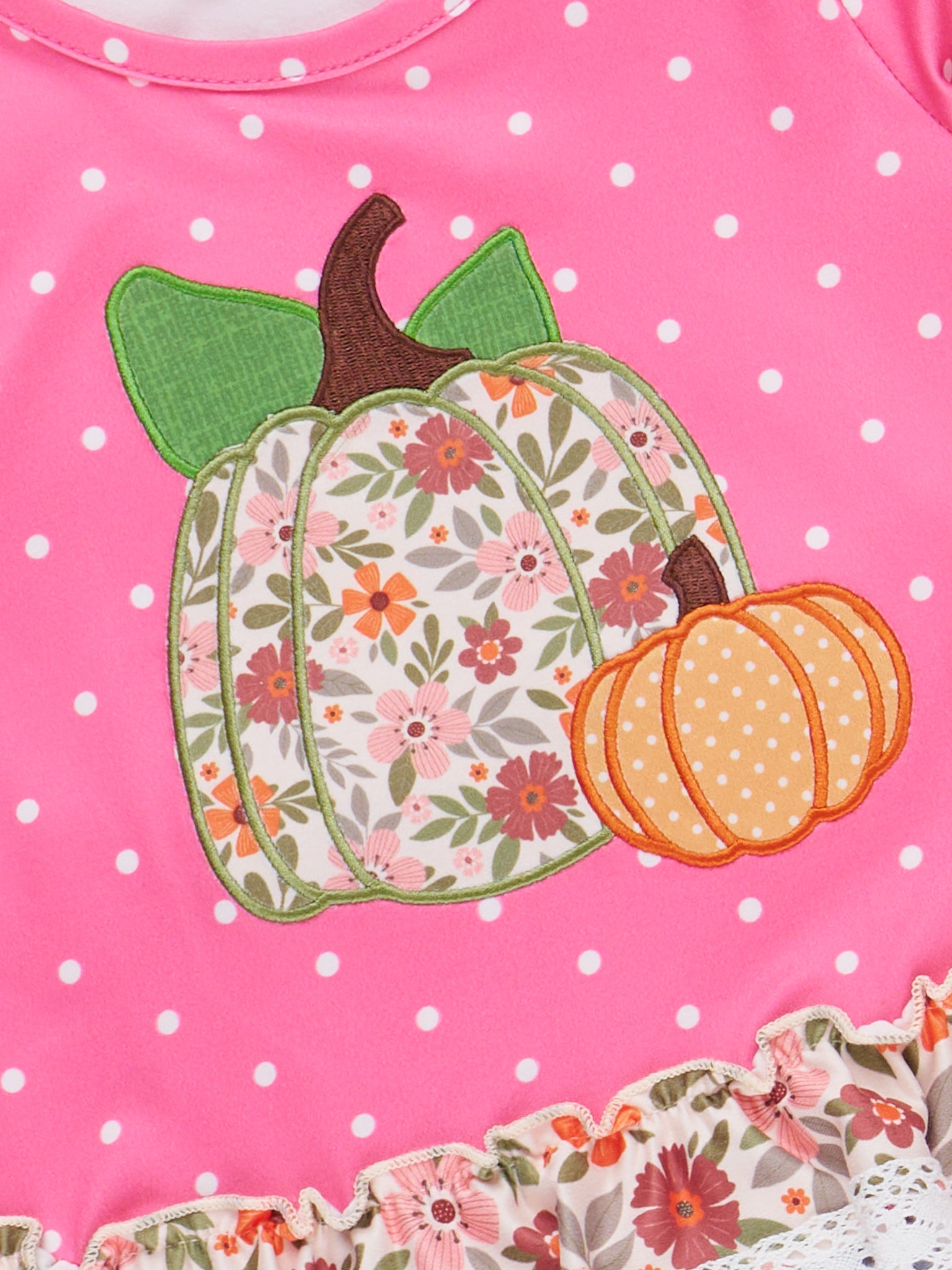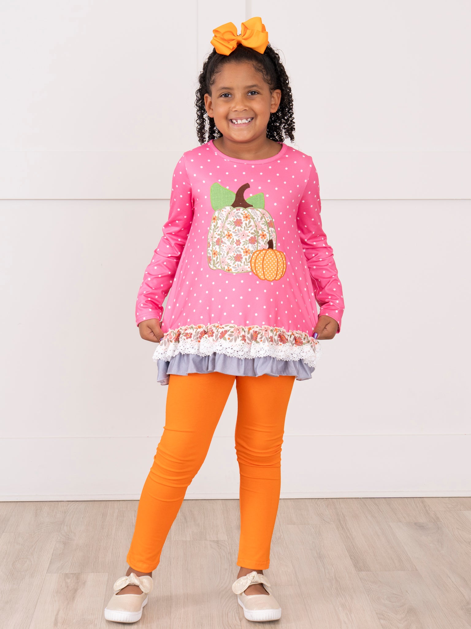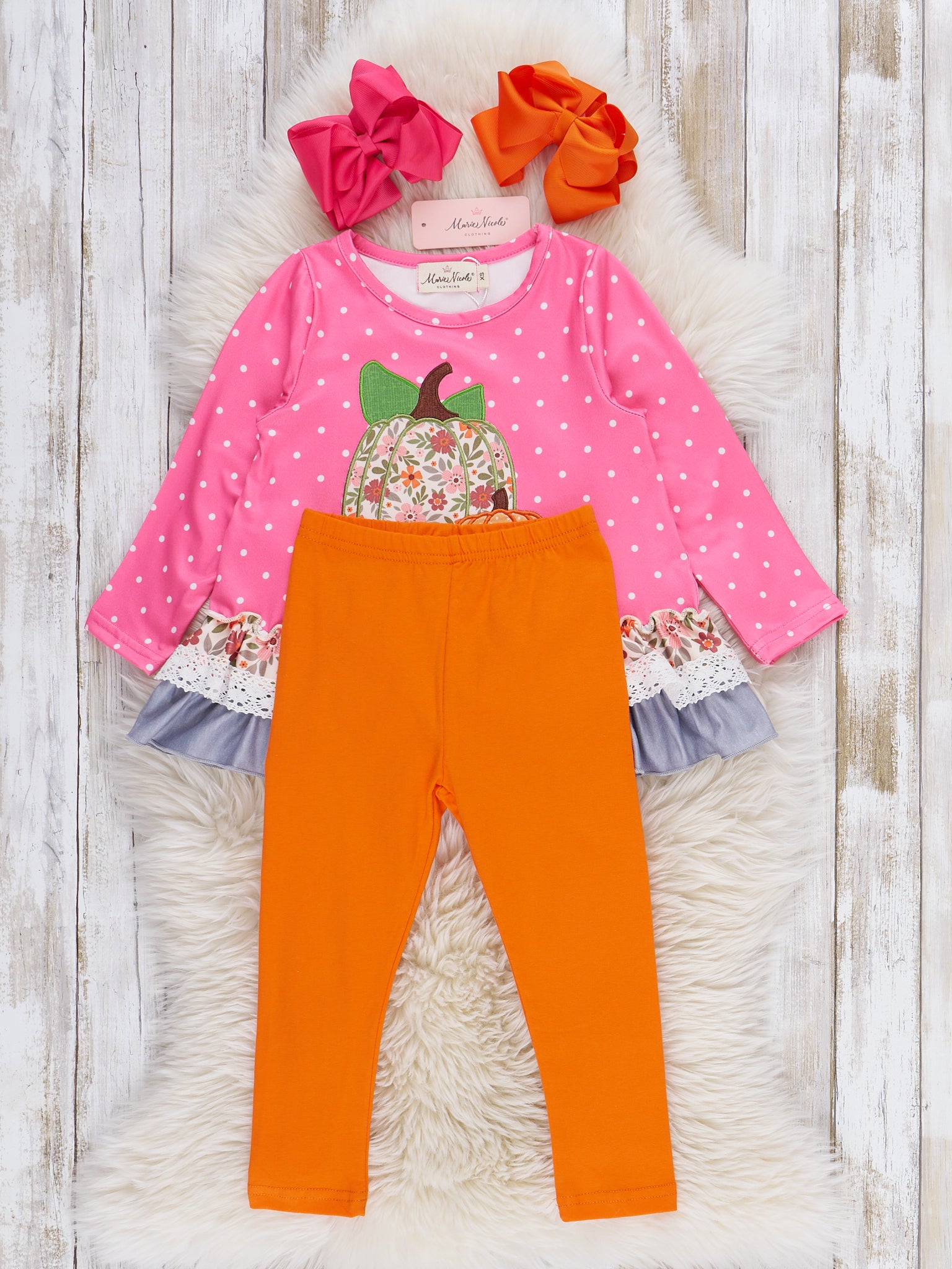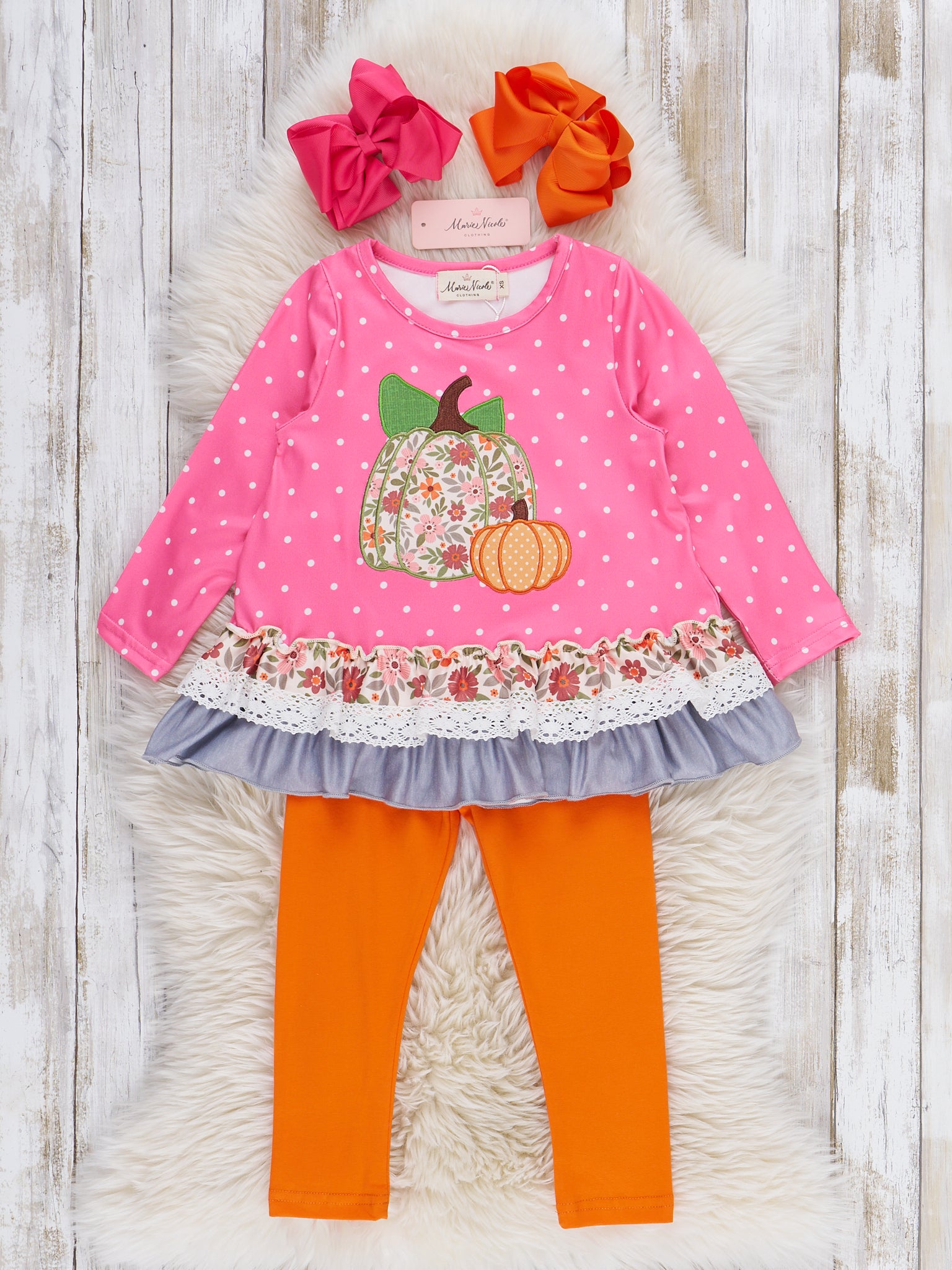 The Pumpkin Lane Ruffle Outfit by Marie Nicole Clothing features a playful top with a floral pumpkin appliqué and layered ruffle hem, paired with comfortable leggings. Designed for seasonal fun, this outfit is ideal for autumn outings, harvest celebrations, and fall photos.