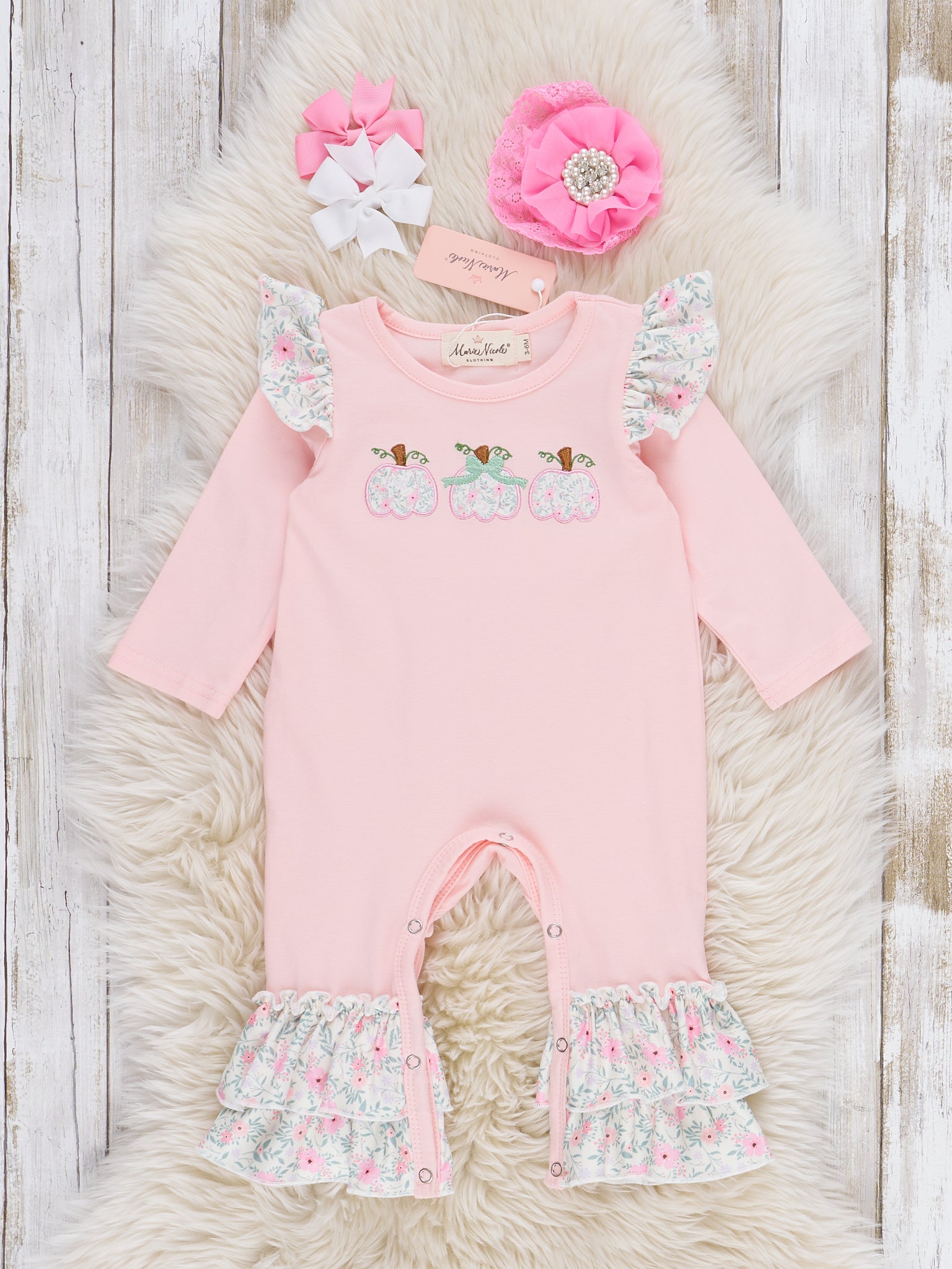 A gardener's favorite! The Pumpkins & Petals Ruffle Embroidered Romper is absolutely delightful with its ruffles and flowers. Featuring a set of embroidered floral pumpkins, this Marie Nicole Clothing one-piece is designed with autumn in mind. Along with the comfiest fabric, this romper is petal-perfect for days in the garden or the pumpkin patch, as well as any fall and Thanksgiving occasions!
