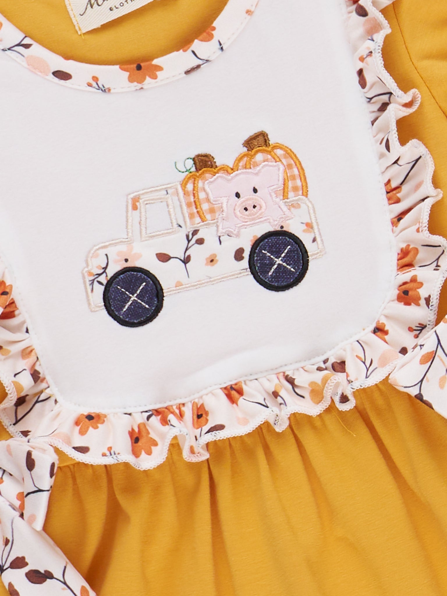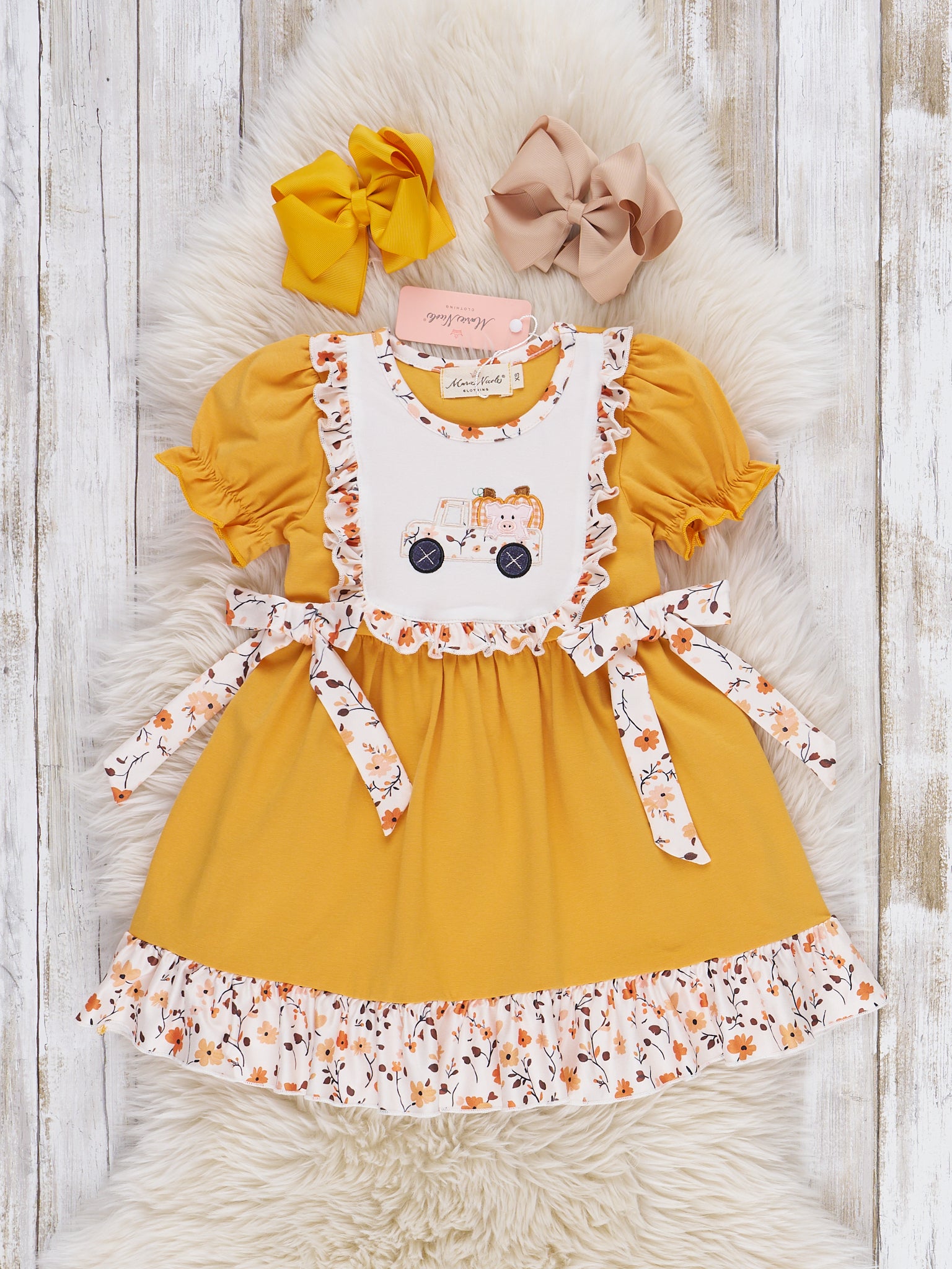 Shine bright with the Sunshine Pumpkin Embroidered Bow Ruffle Dress by Marie Nicole Clothing! The piece is embroidered with a truck, pumpkins, and adorable piggy over a bib collar, paired with a yellow hues. Crafted with soft fabric, this dress will bring your little girl fall cheer to every day!