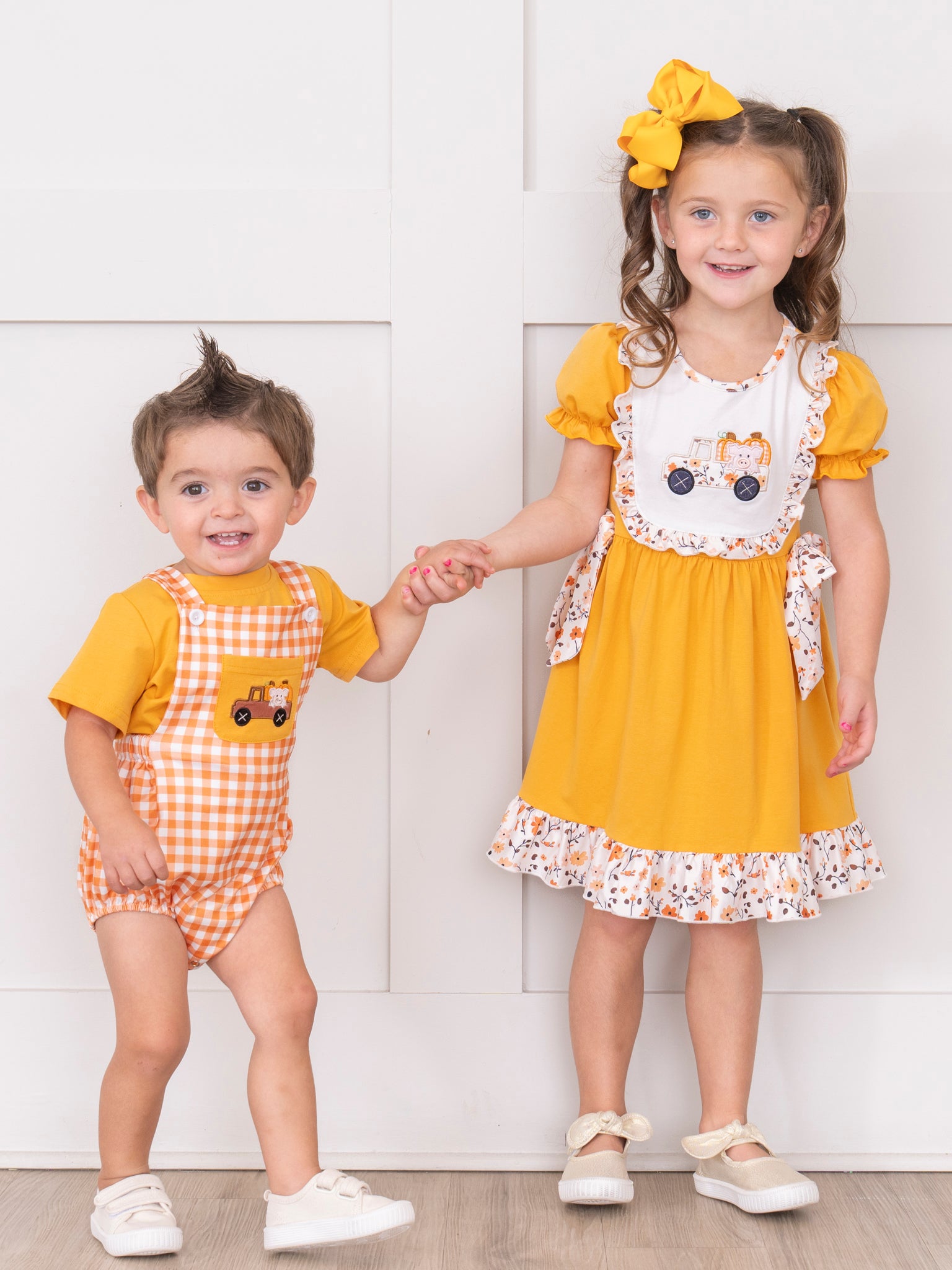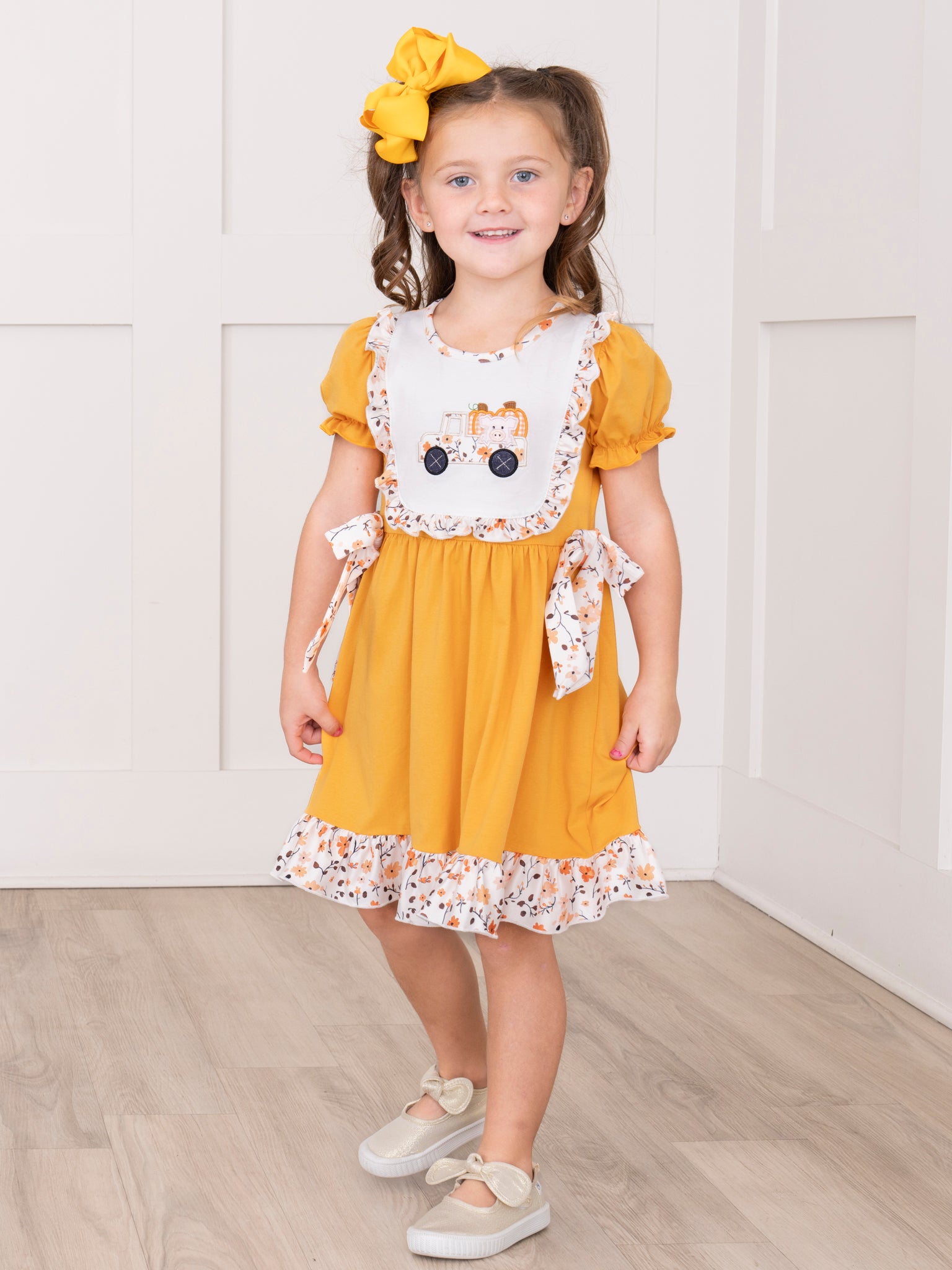 Sunshine Pumpkin Drive Embroidered Bow Ruffle Dress