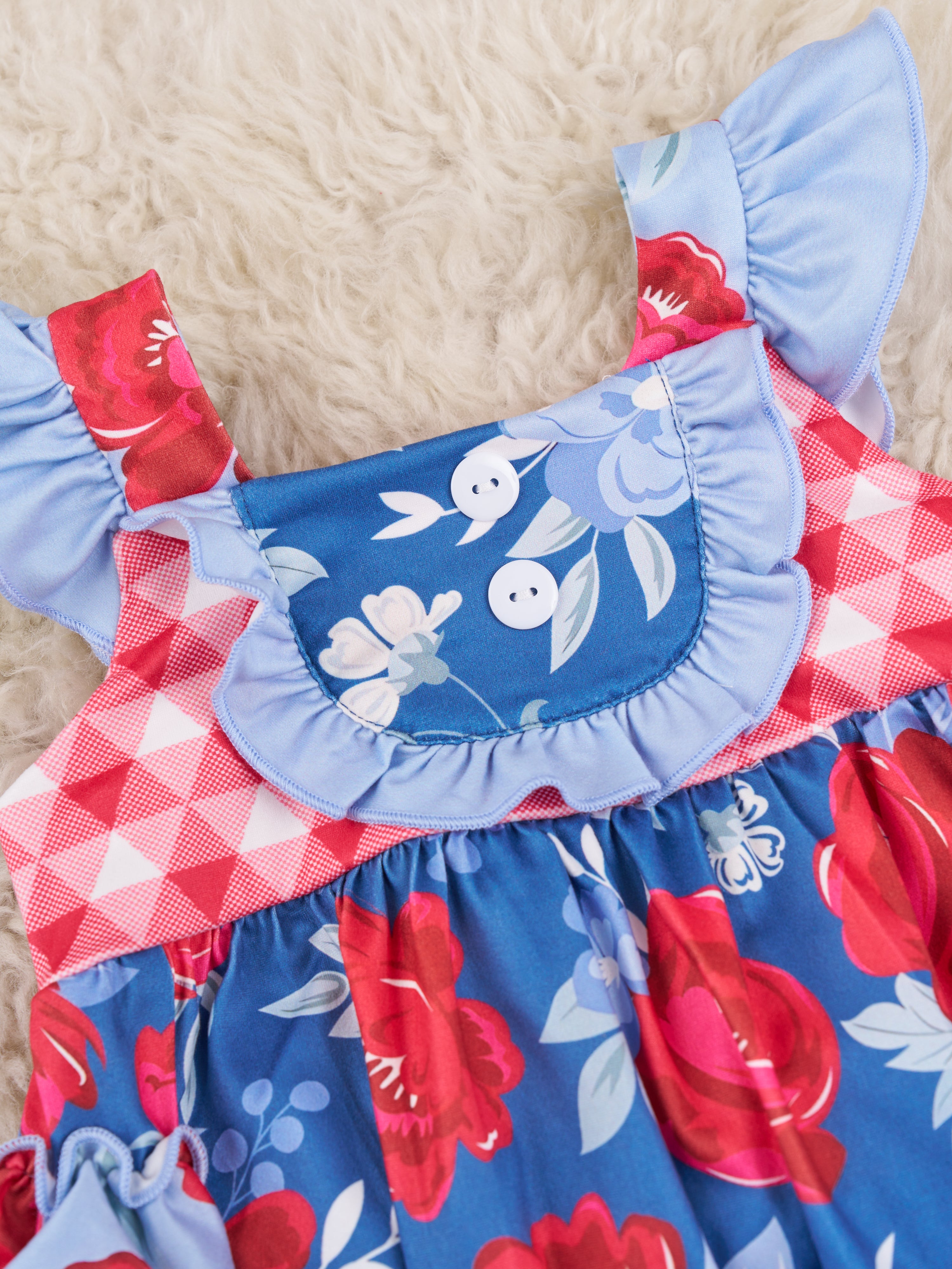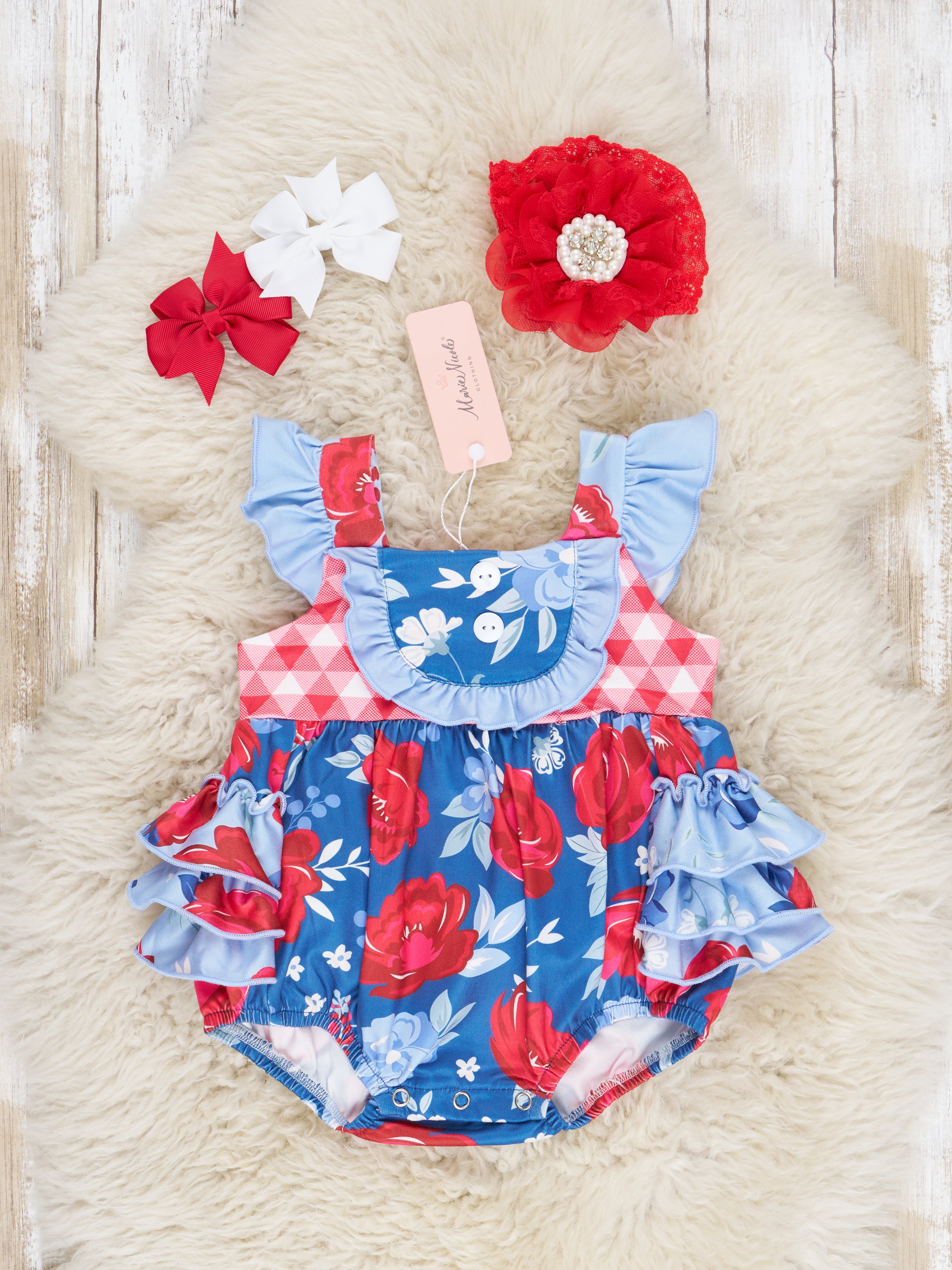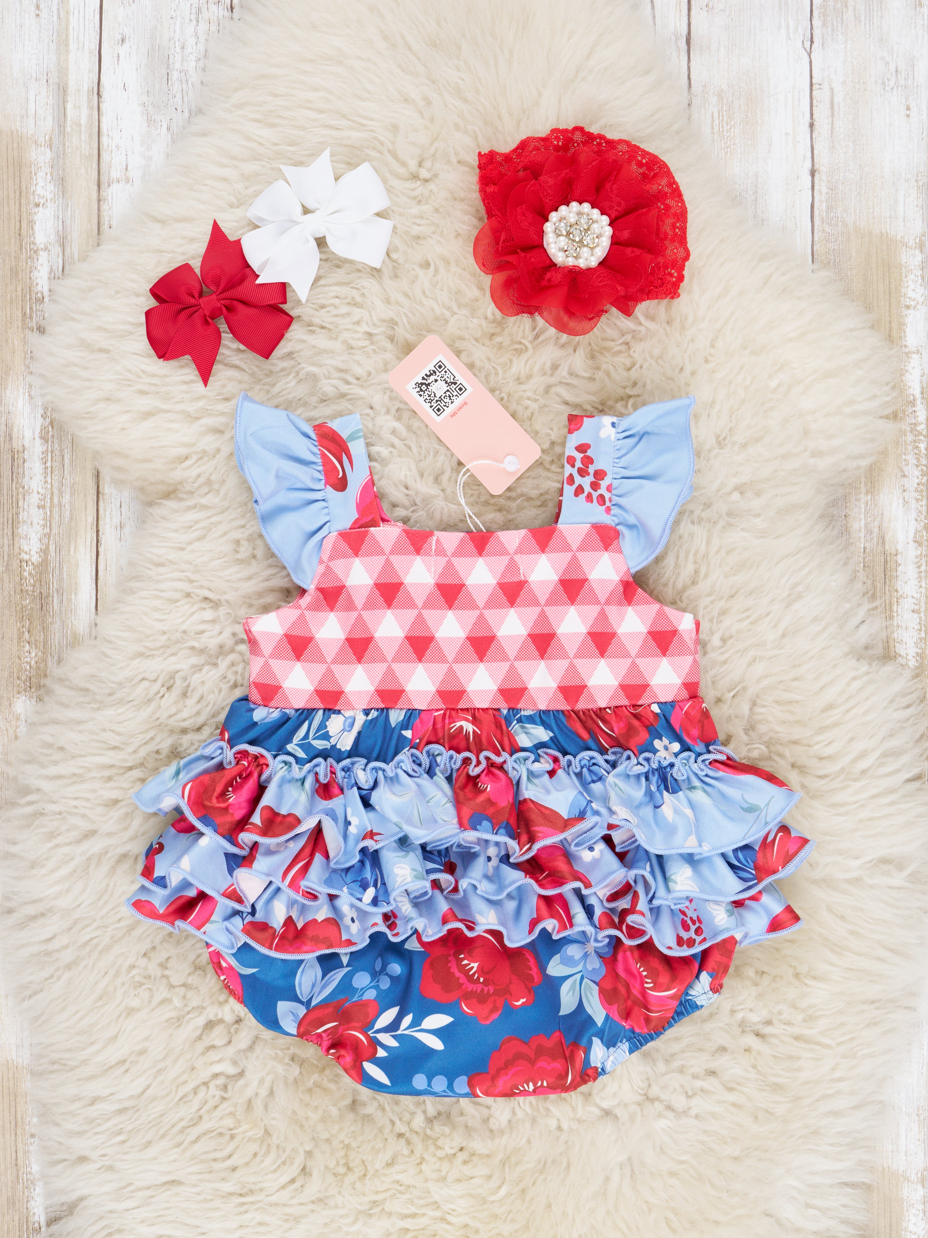 Introducing the perfect pick for your little cuties: the Red & Blue Rose Ruffle Bubble! This sassy sister set features a bold red, white, and blue floral pattern of roses and sweet ruffles.