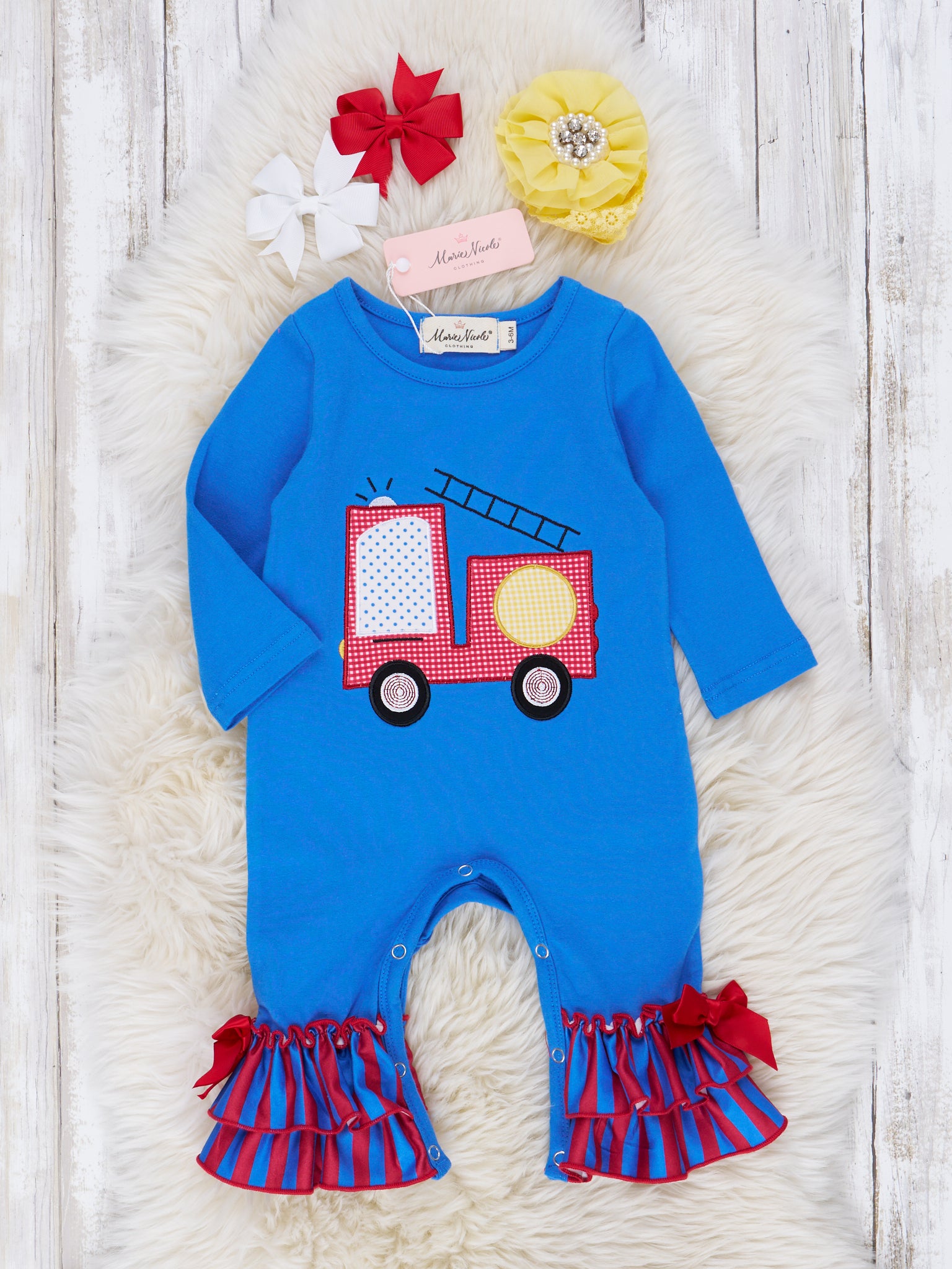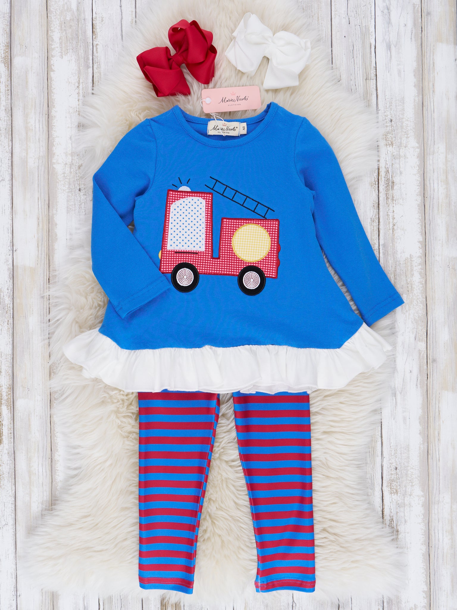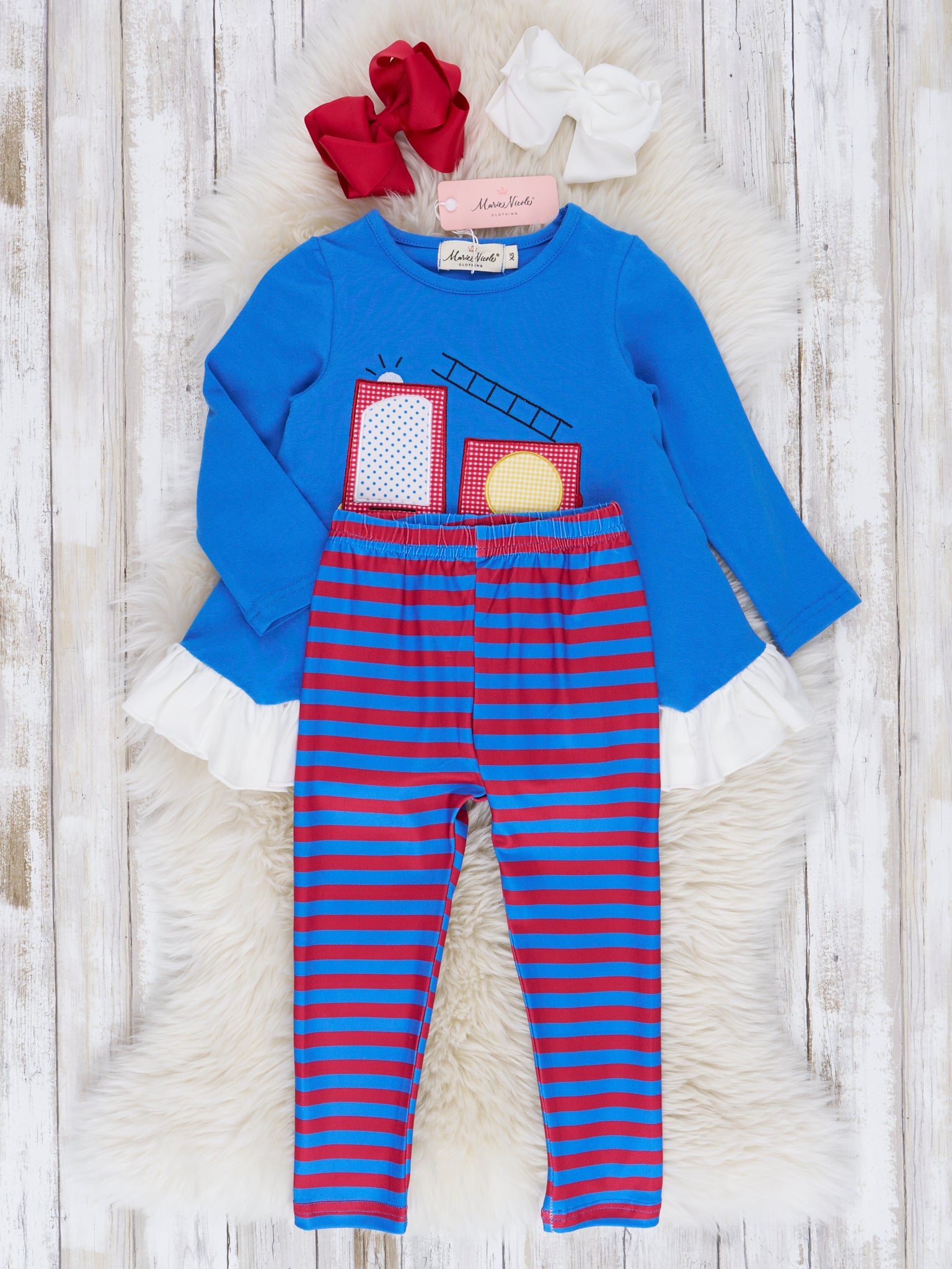 Red & Blue Stripe Firetruck Ruffle Outfit