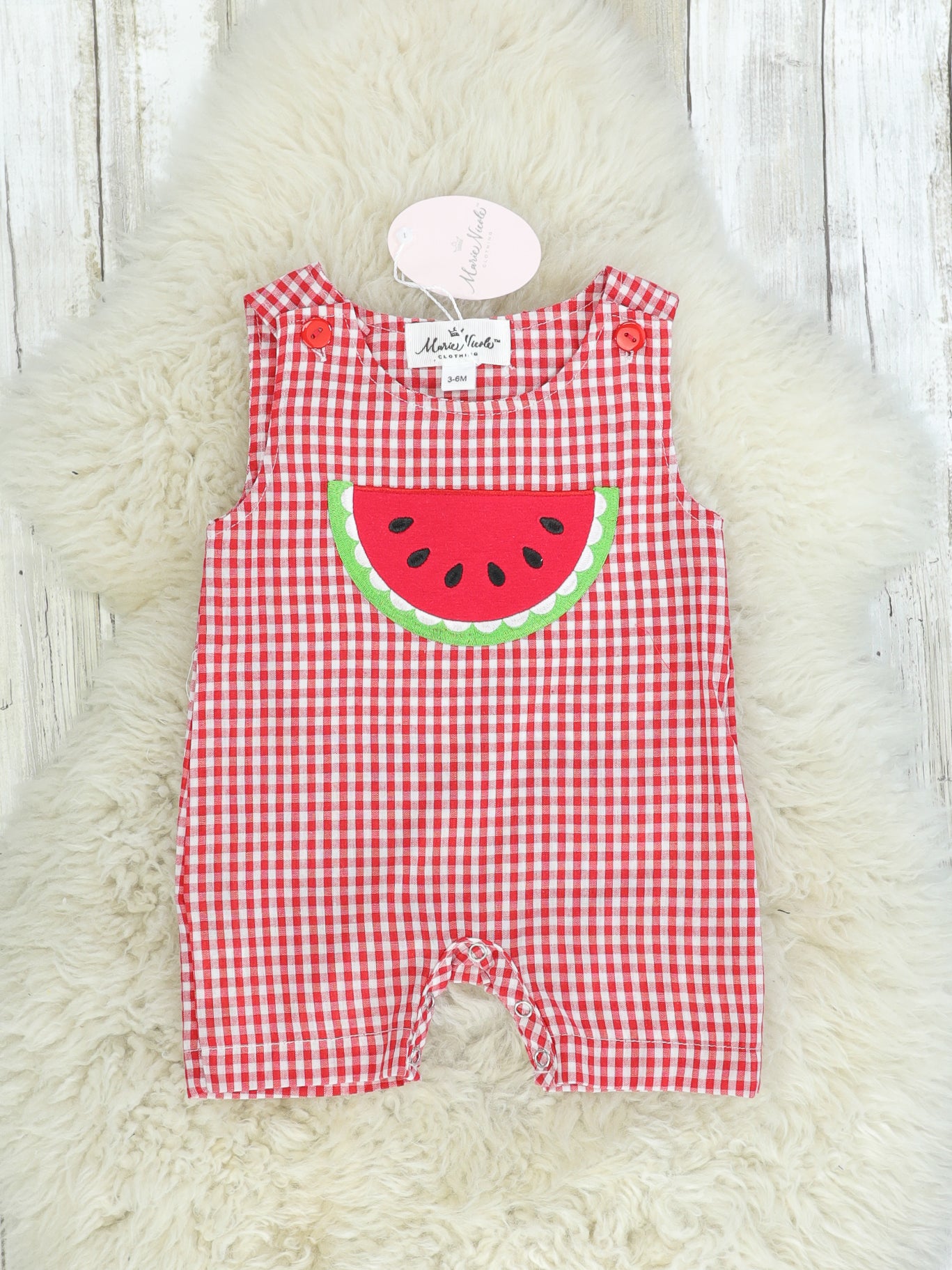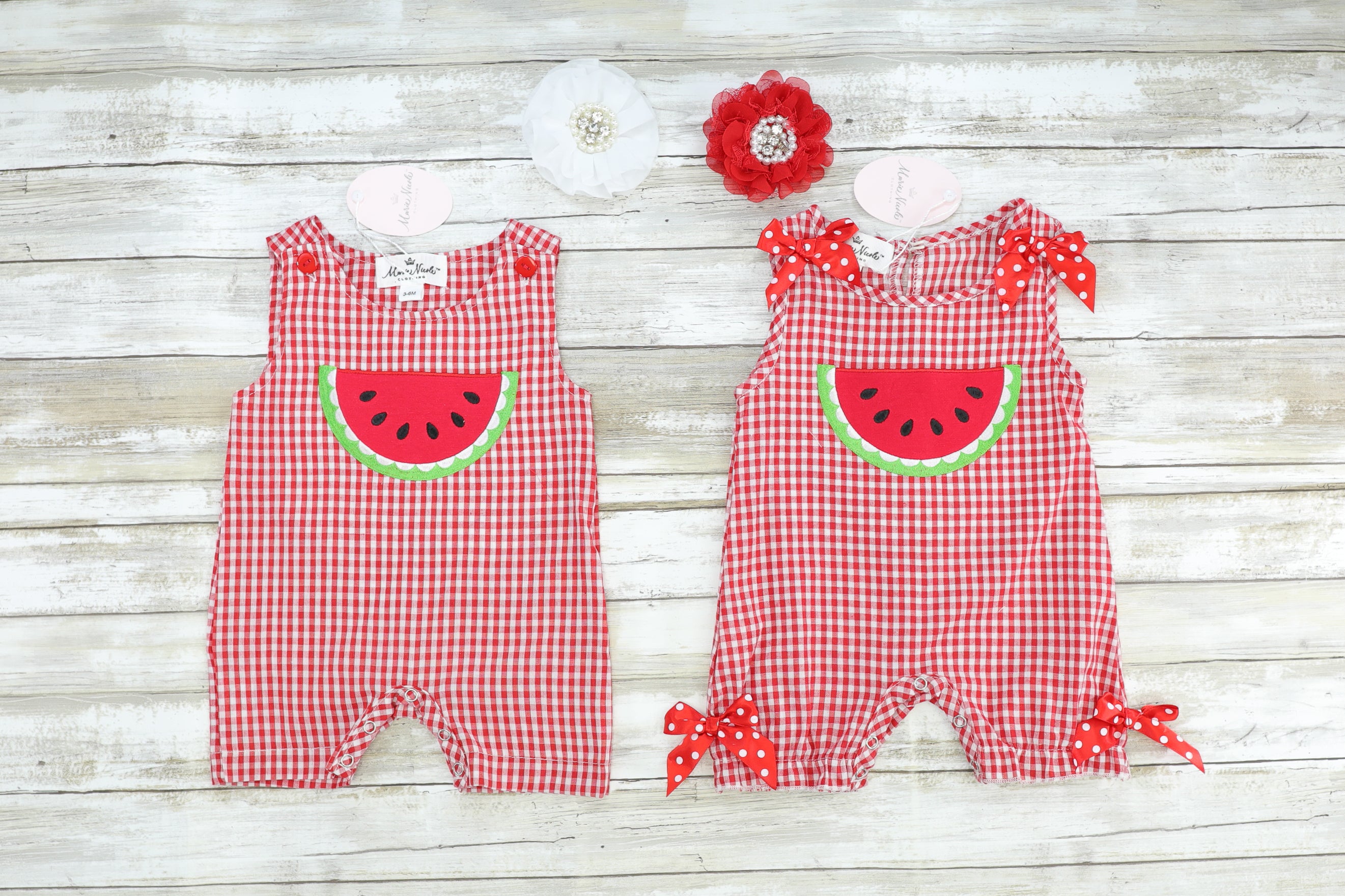 We love eating watermelon all day! This red-checked sibling set features a watermelon applique.