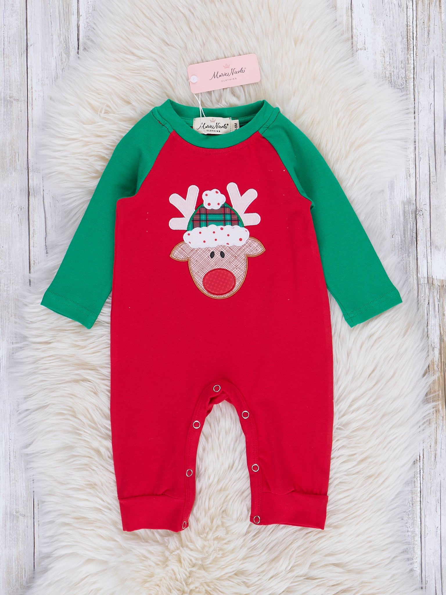Red & Green Embroidered Reindeer Raglan Romper