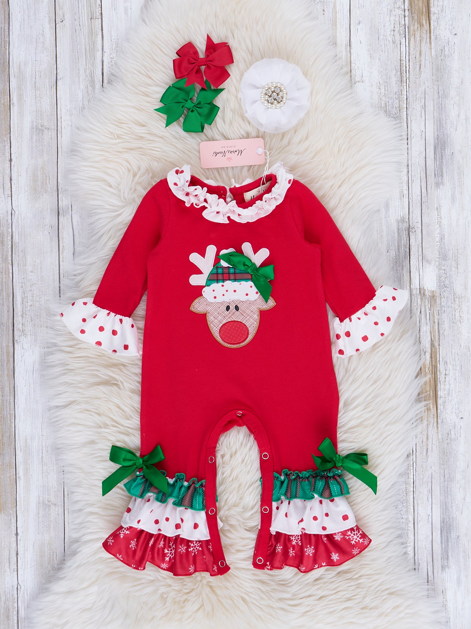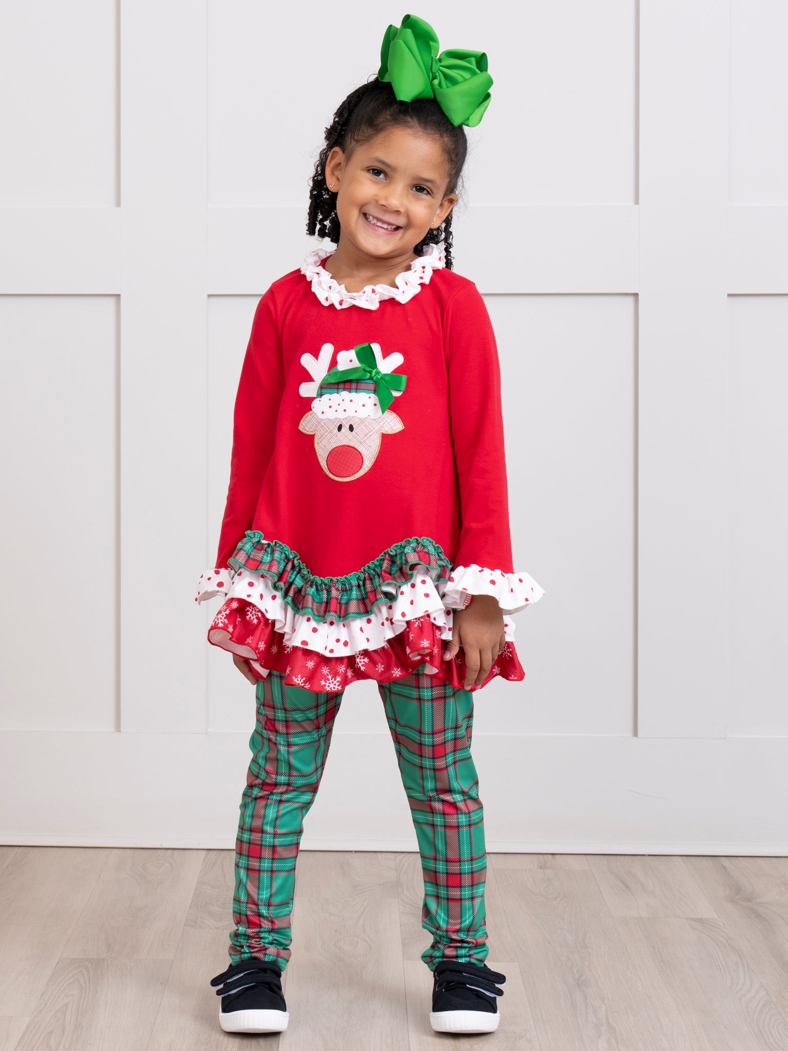 Red & Green Embroidered Reindeer Ruffle Outfit