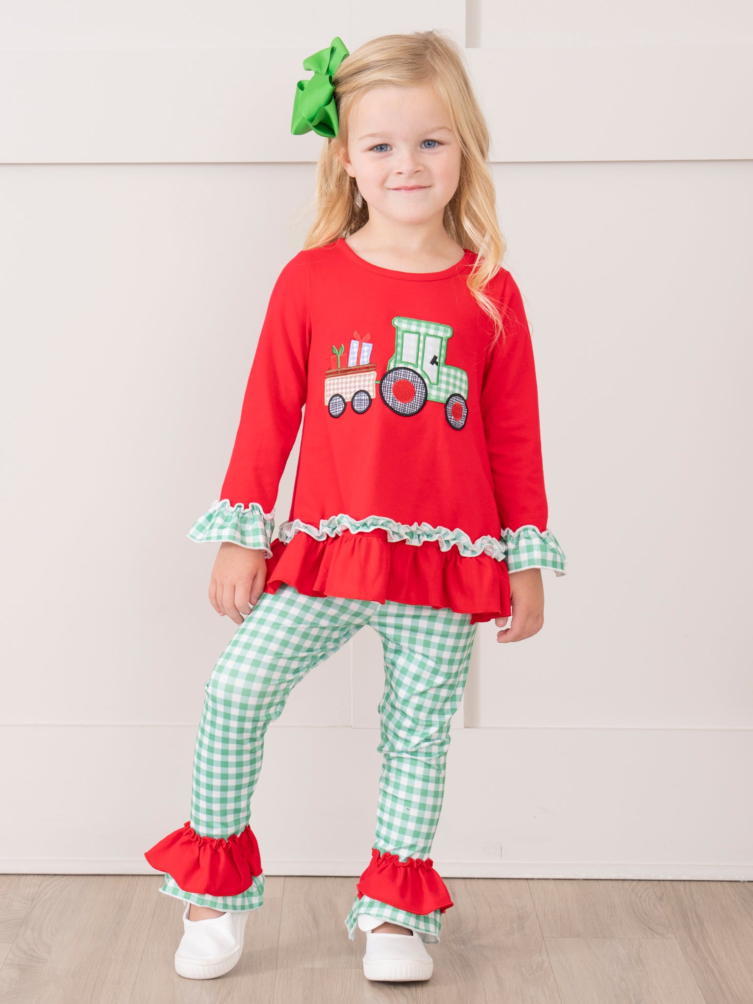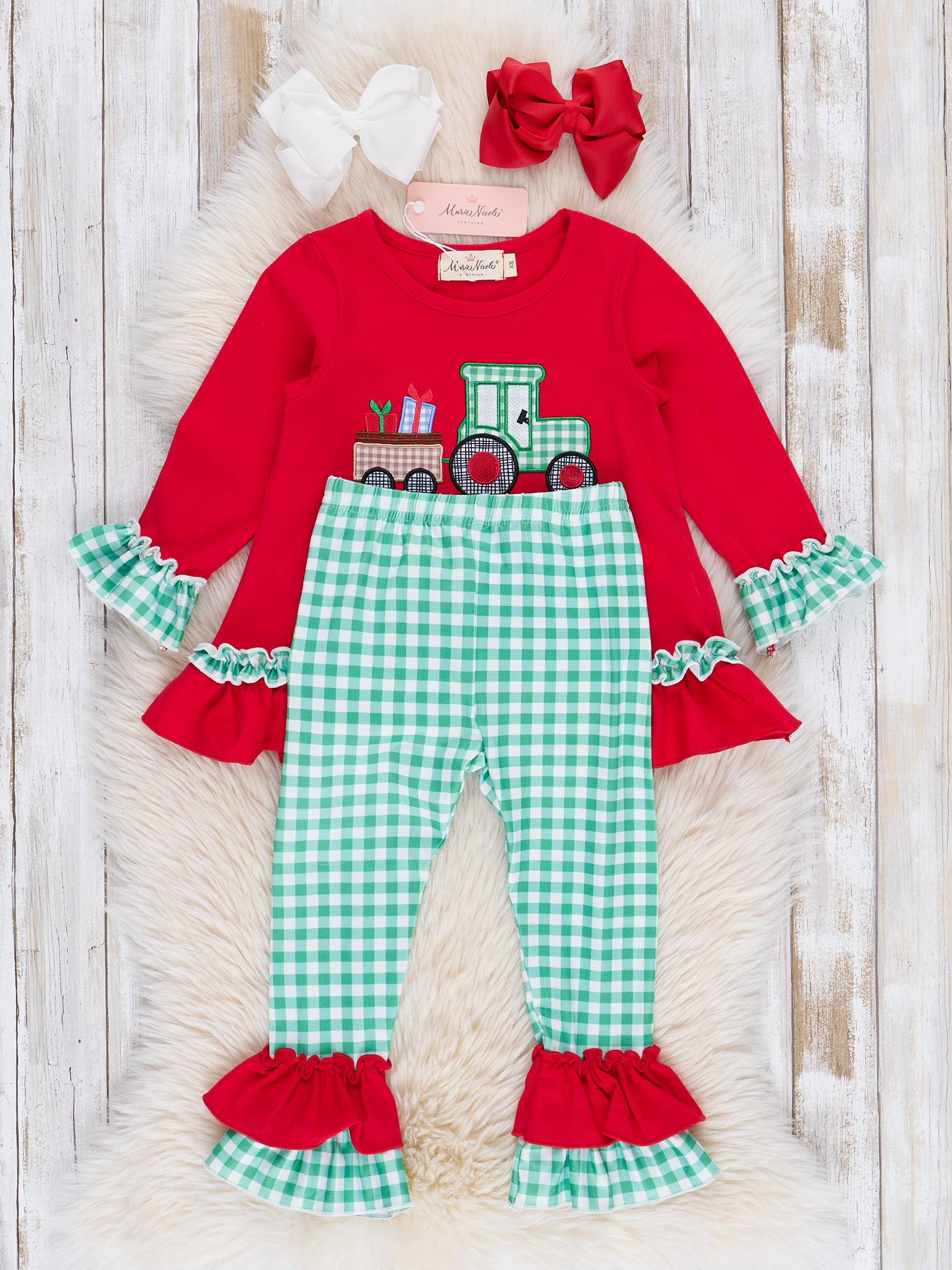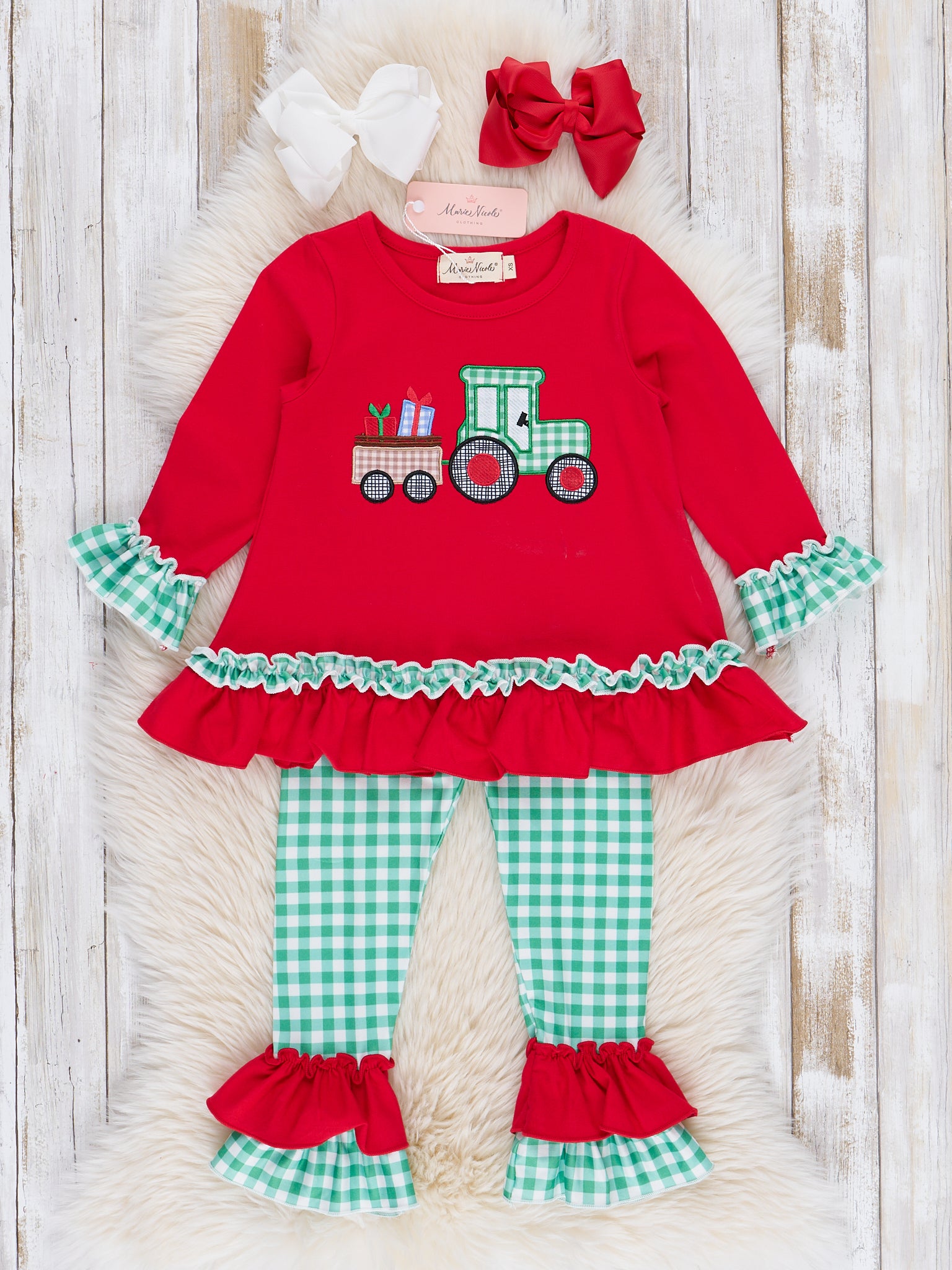 Red & Green Gingham Embroidered Holiday Tractor Ruffle Outfit