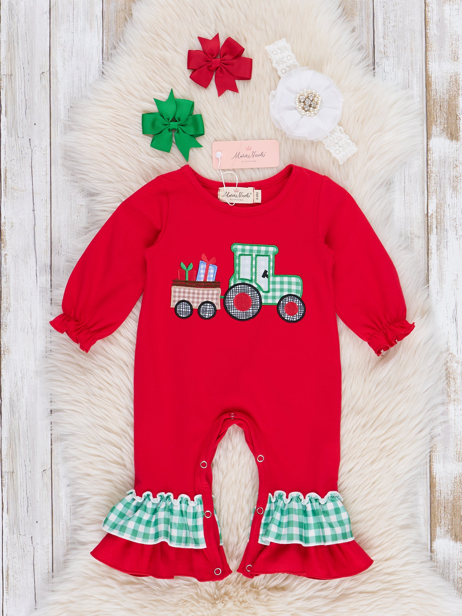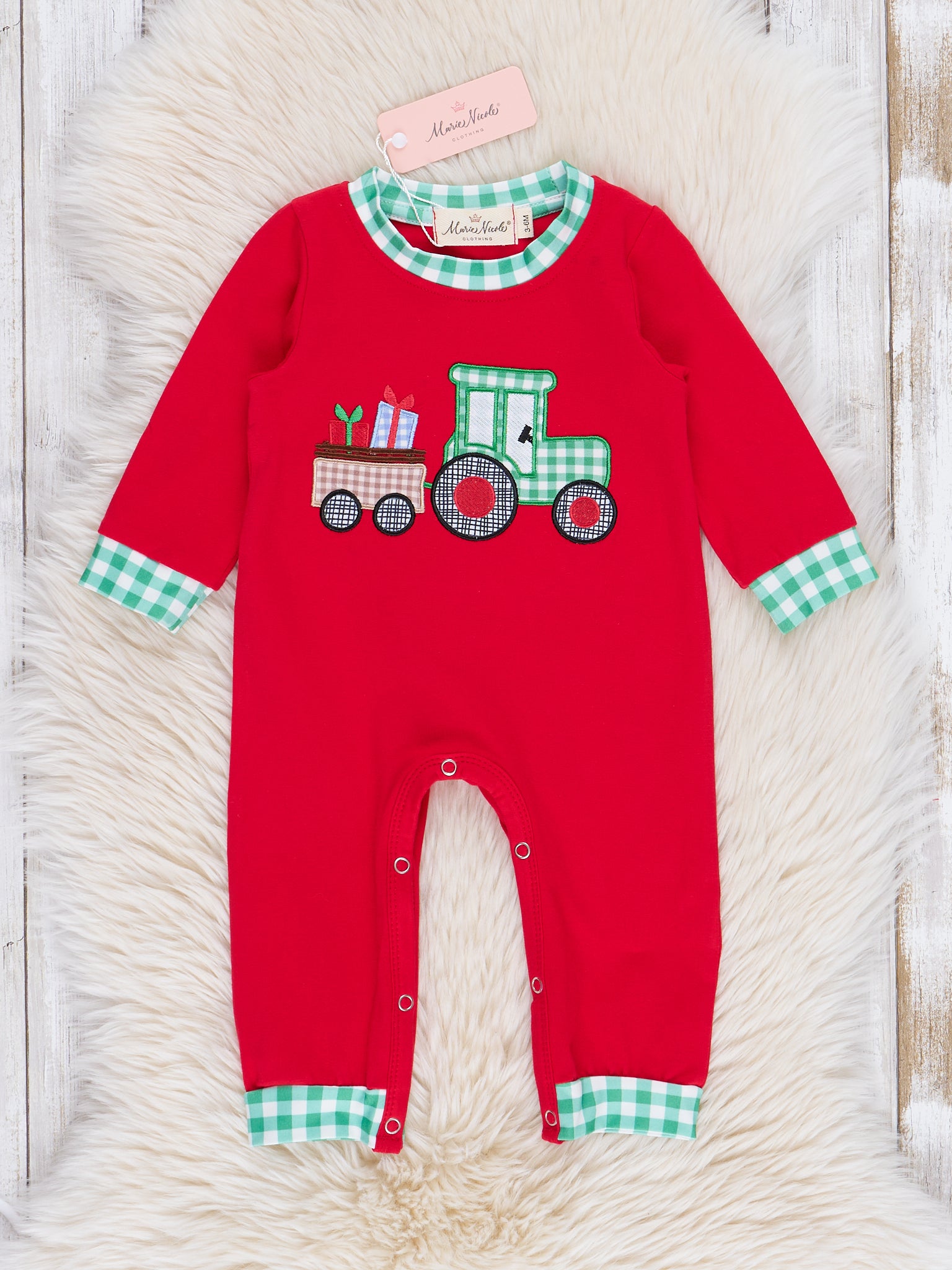 Red & Green Gingham Embroidered Holiday Tractor Romper