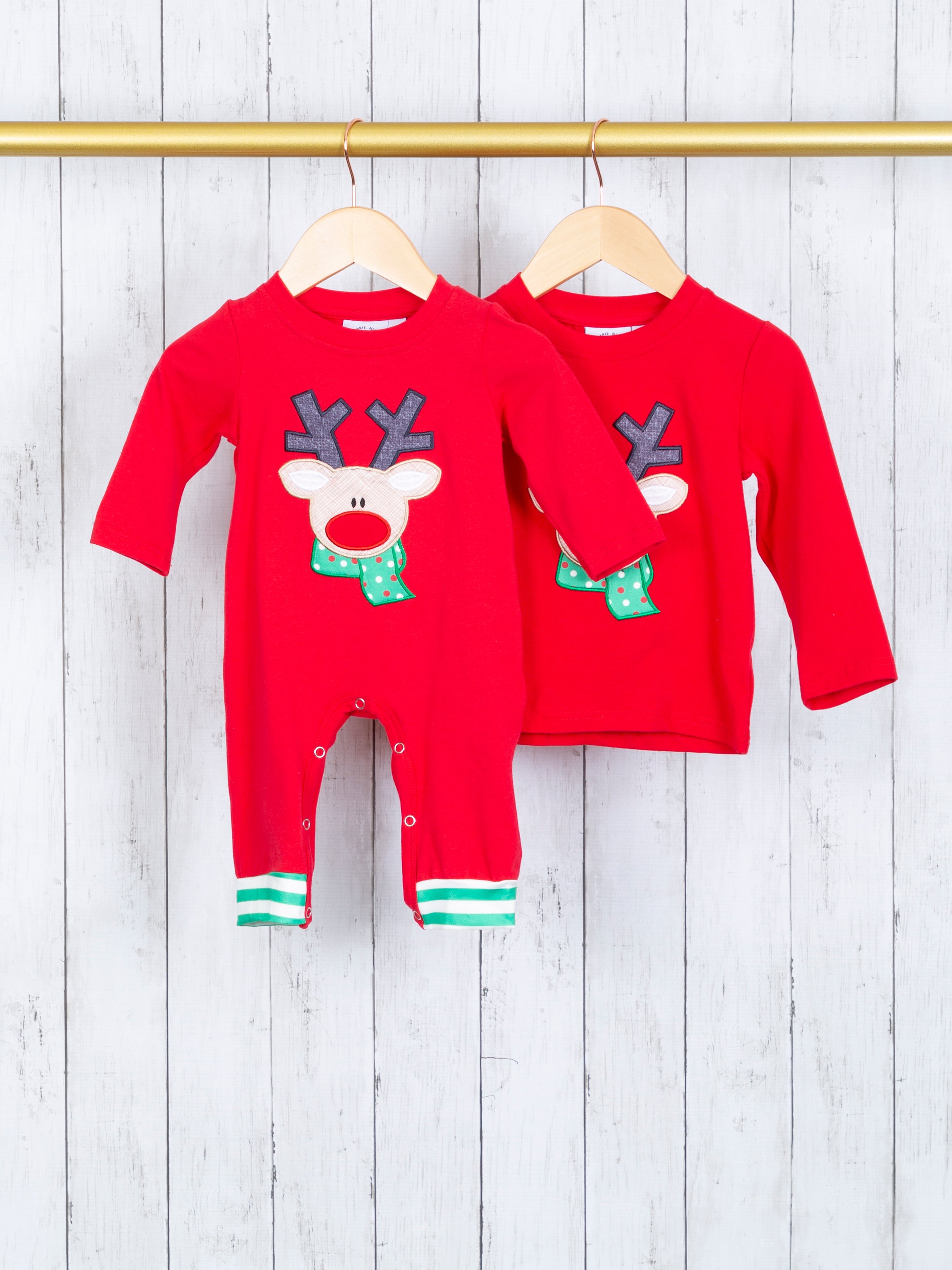 This dashing sibling set has something for all your little reindeer! This red romper features the most festive reindeer appliqué & striped trim.