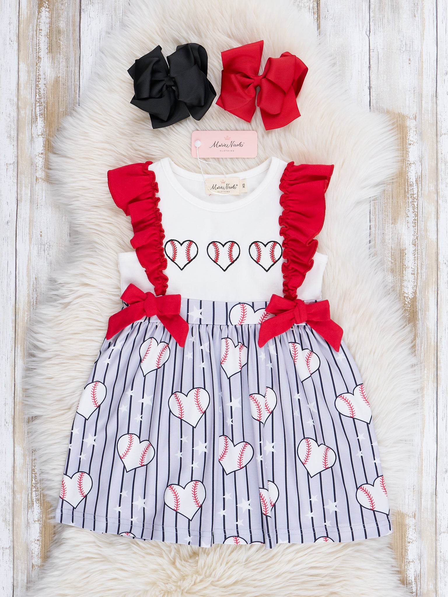 Red & Grey Stripes Smocked Baseball Ruffle Dress