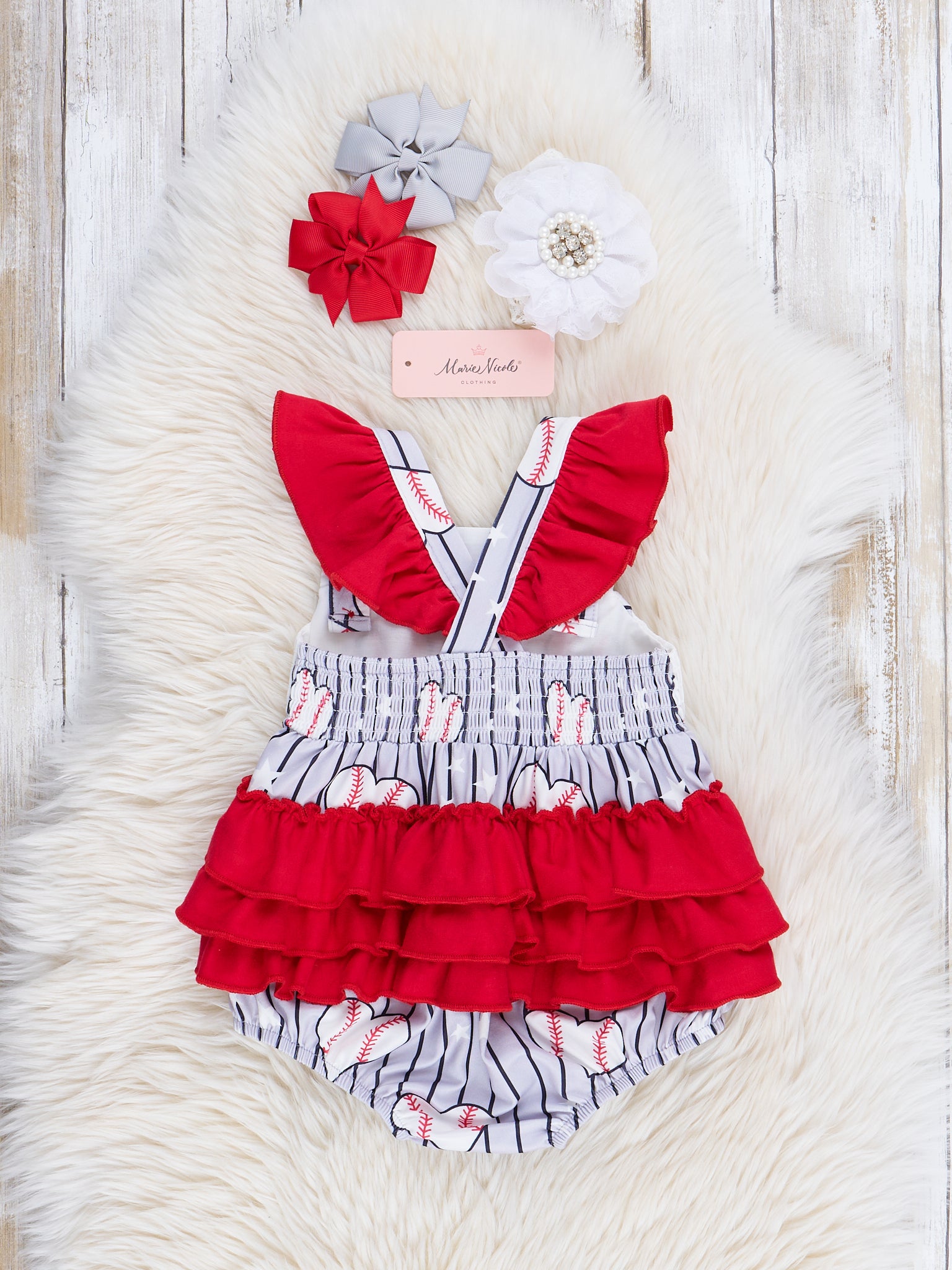 Red & Grey Stripes Smocked Baseball Ruffle Bubble