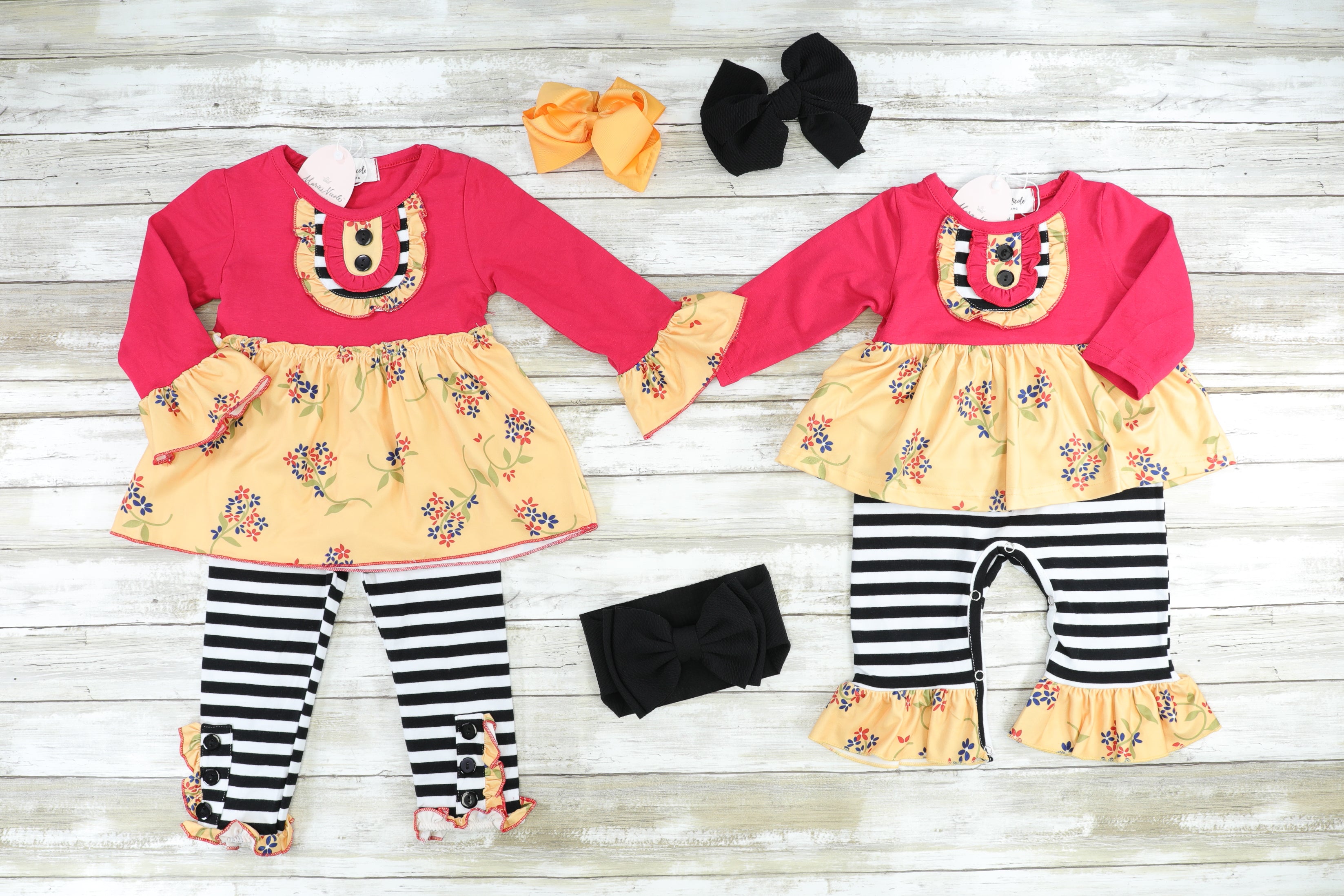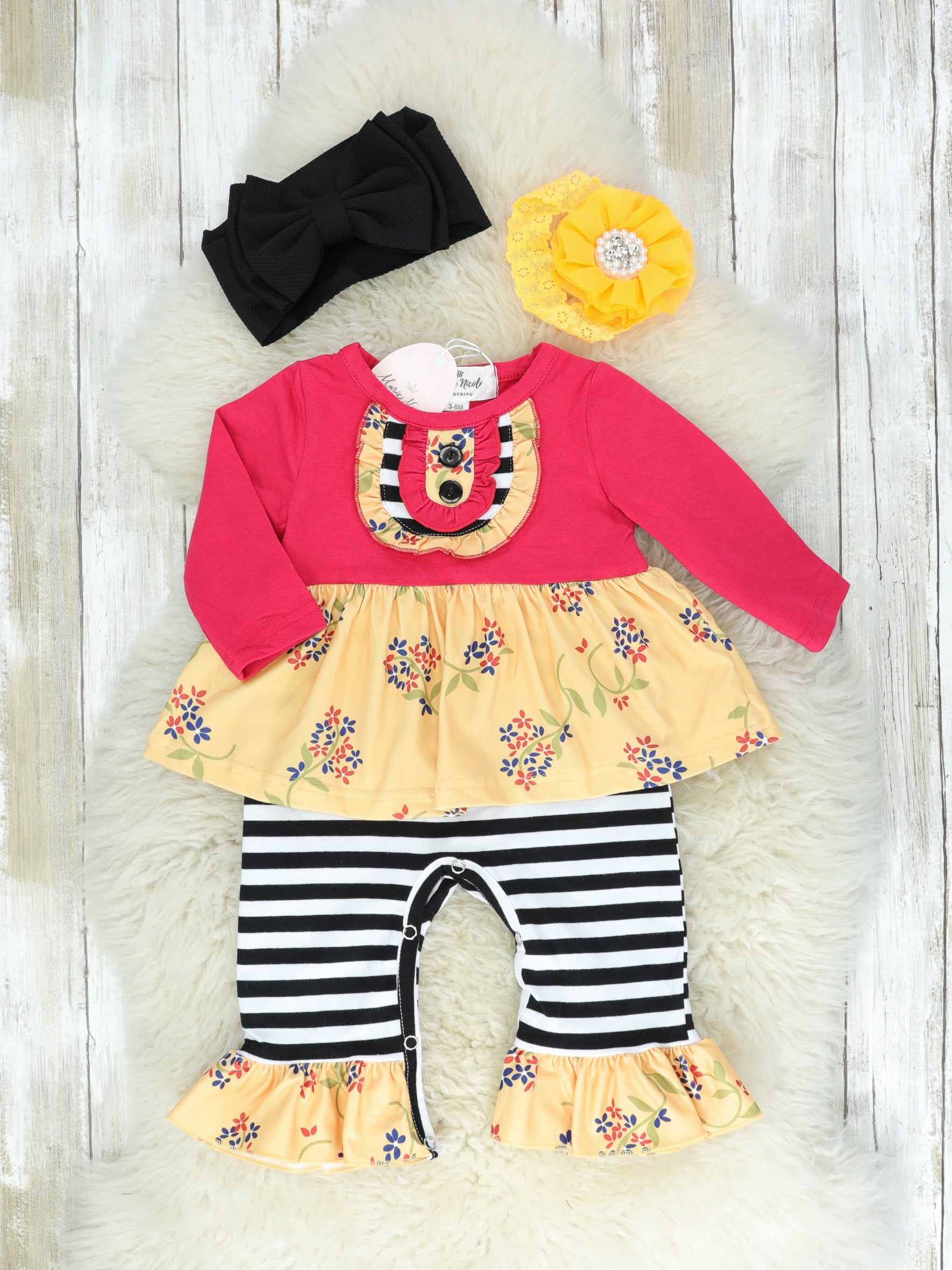 Red & Mustard Floral Tunic & Black & White Striped Pants