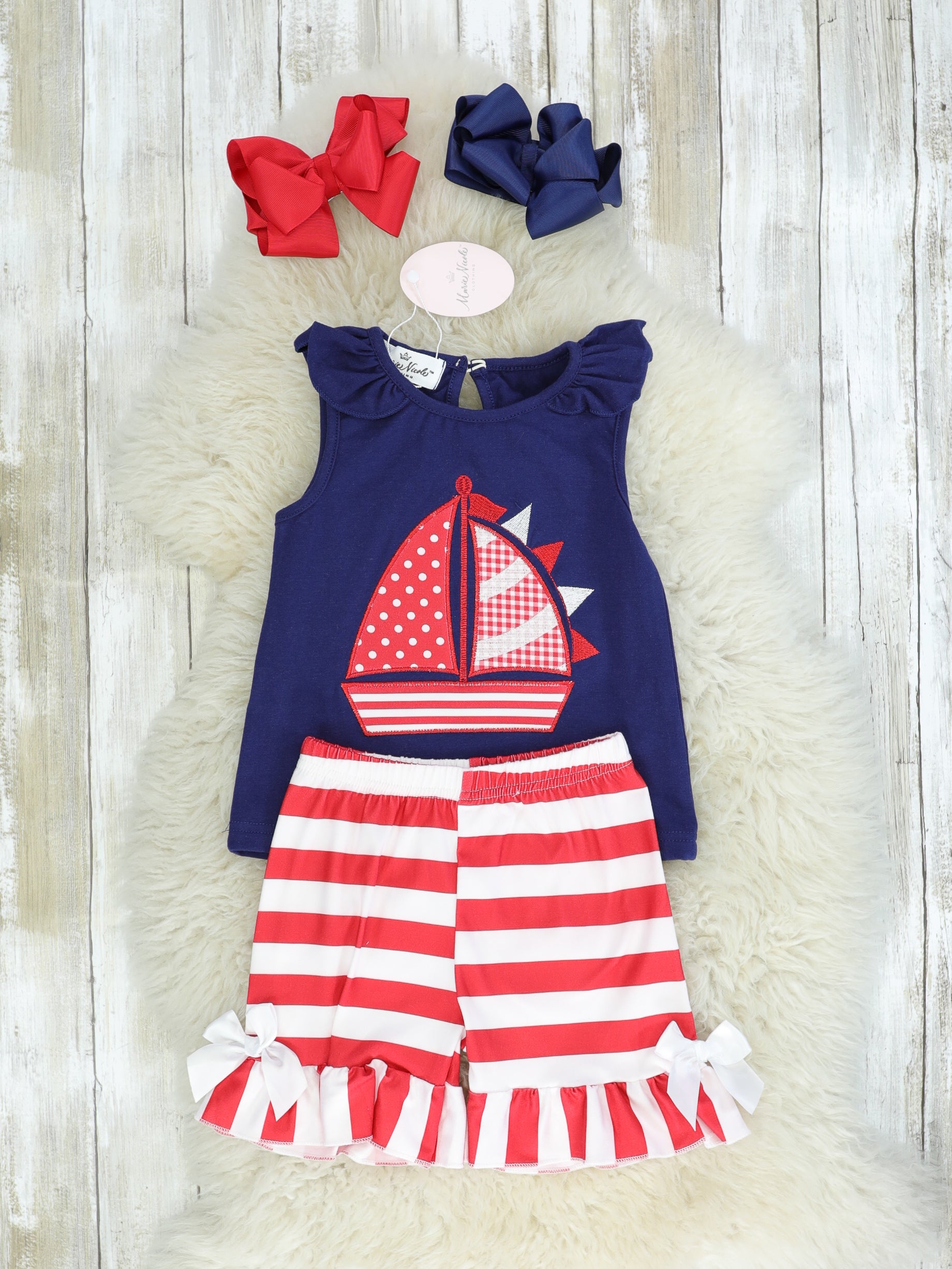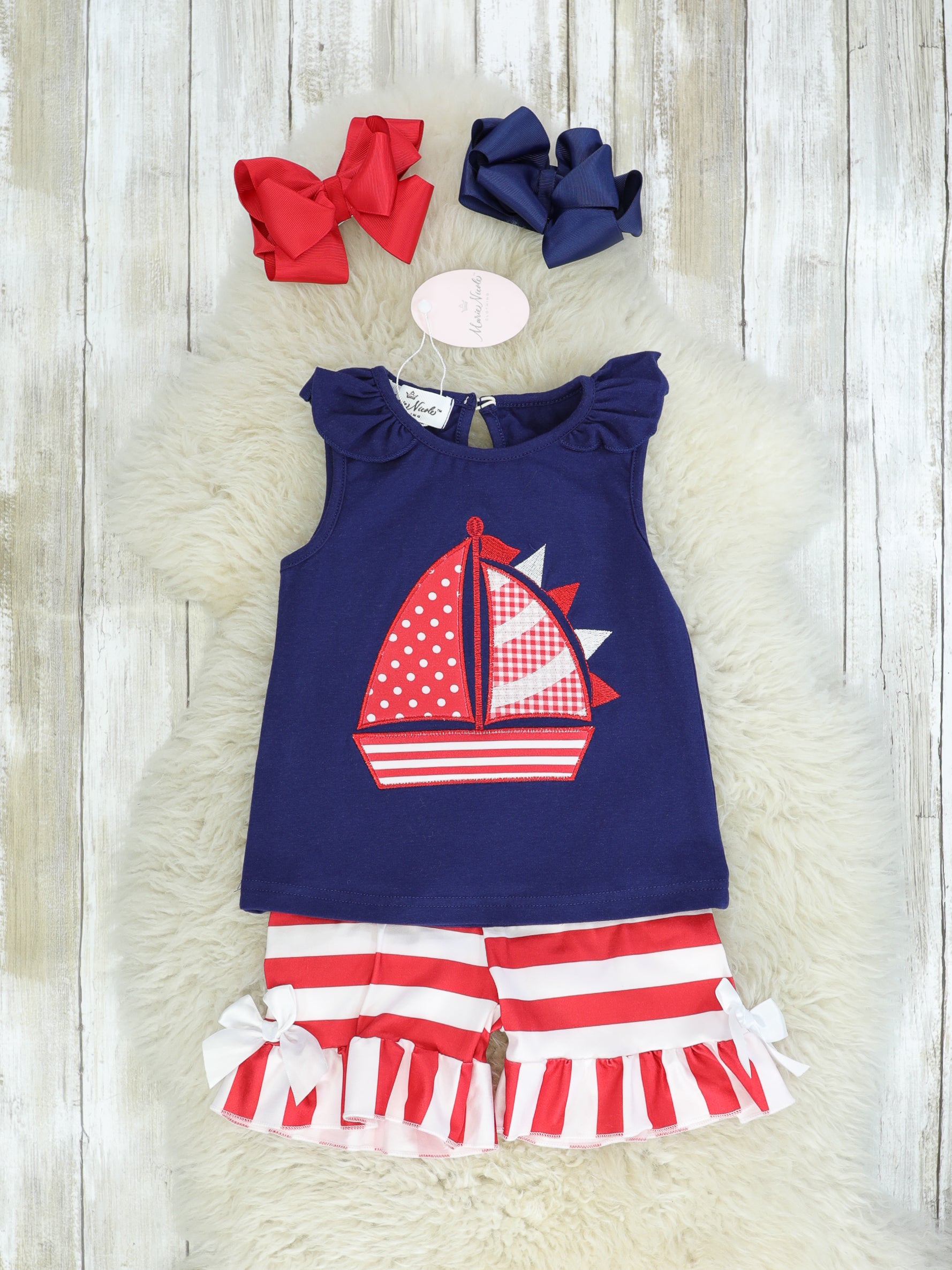 Set Sail in this too cute sibling set! This set is perfect for a family trip near the sea! We love the sailboat appliqué & red & white striped shorts!
