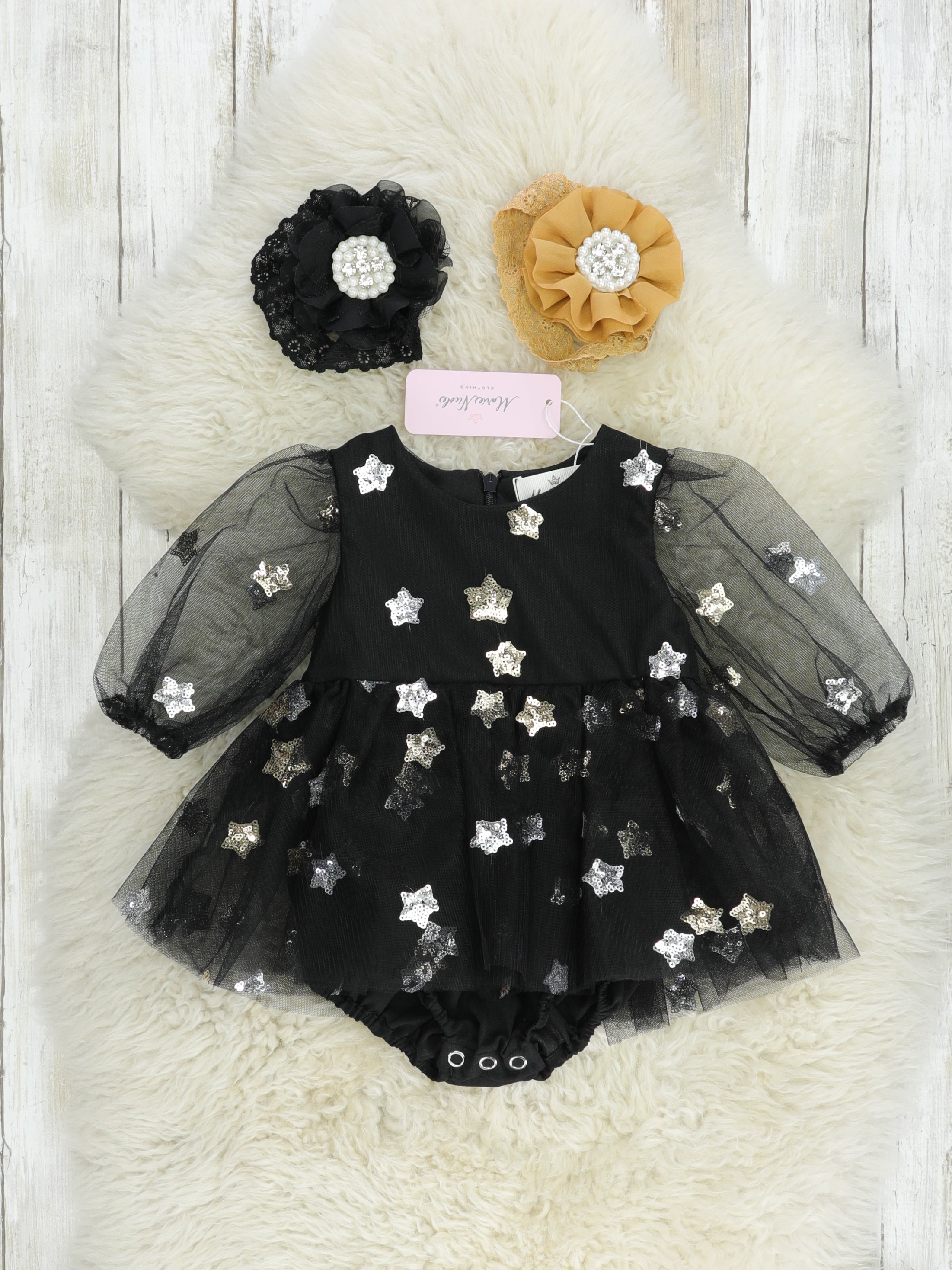 The most adorable sister set for your bright & shining stars! This black bubble features tulle details, adorable sequin stars, & a zipper back.