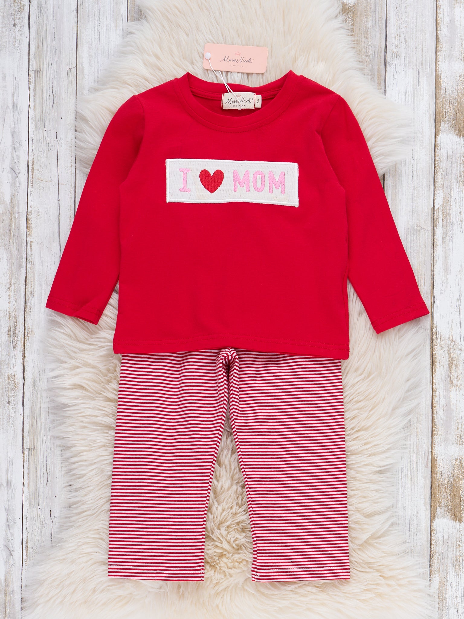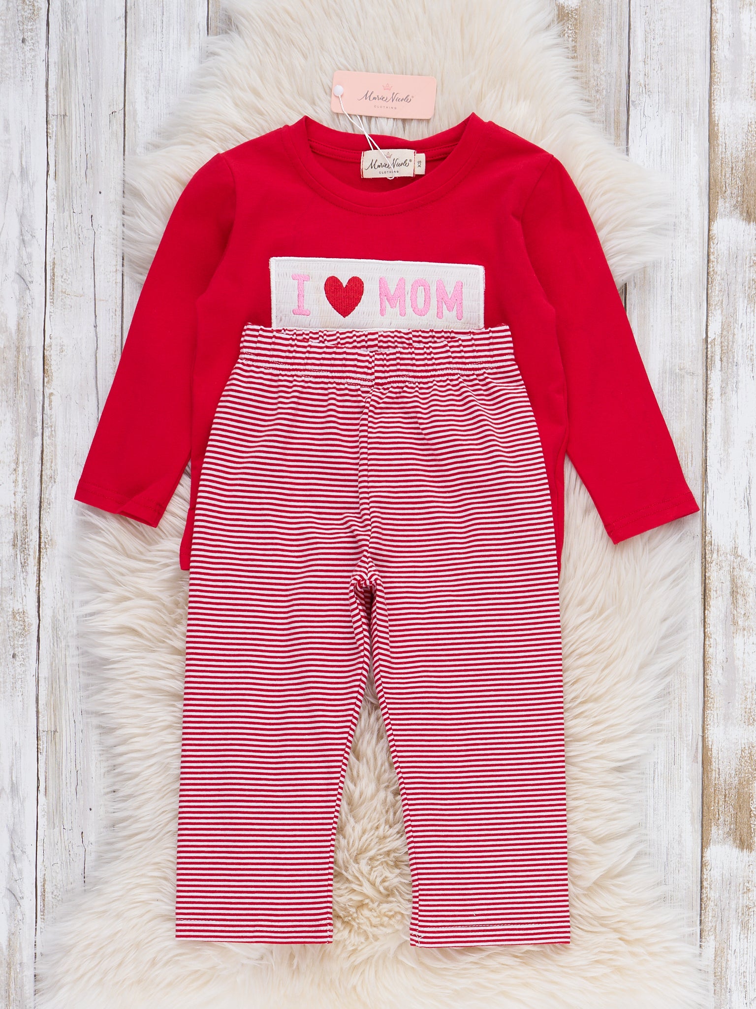 Little Love for Mom Smocked Outfit by Marie Nicole Clothing is a sweet and heartfelt set designed for little ones who want to show extra love for their mom. The outfit features a cozy long-sleeve top with an embroidered message and comfortable striped bottoms, making it a charming choice for Mother's Day celebrations or expressing love every day.