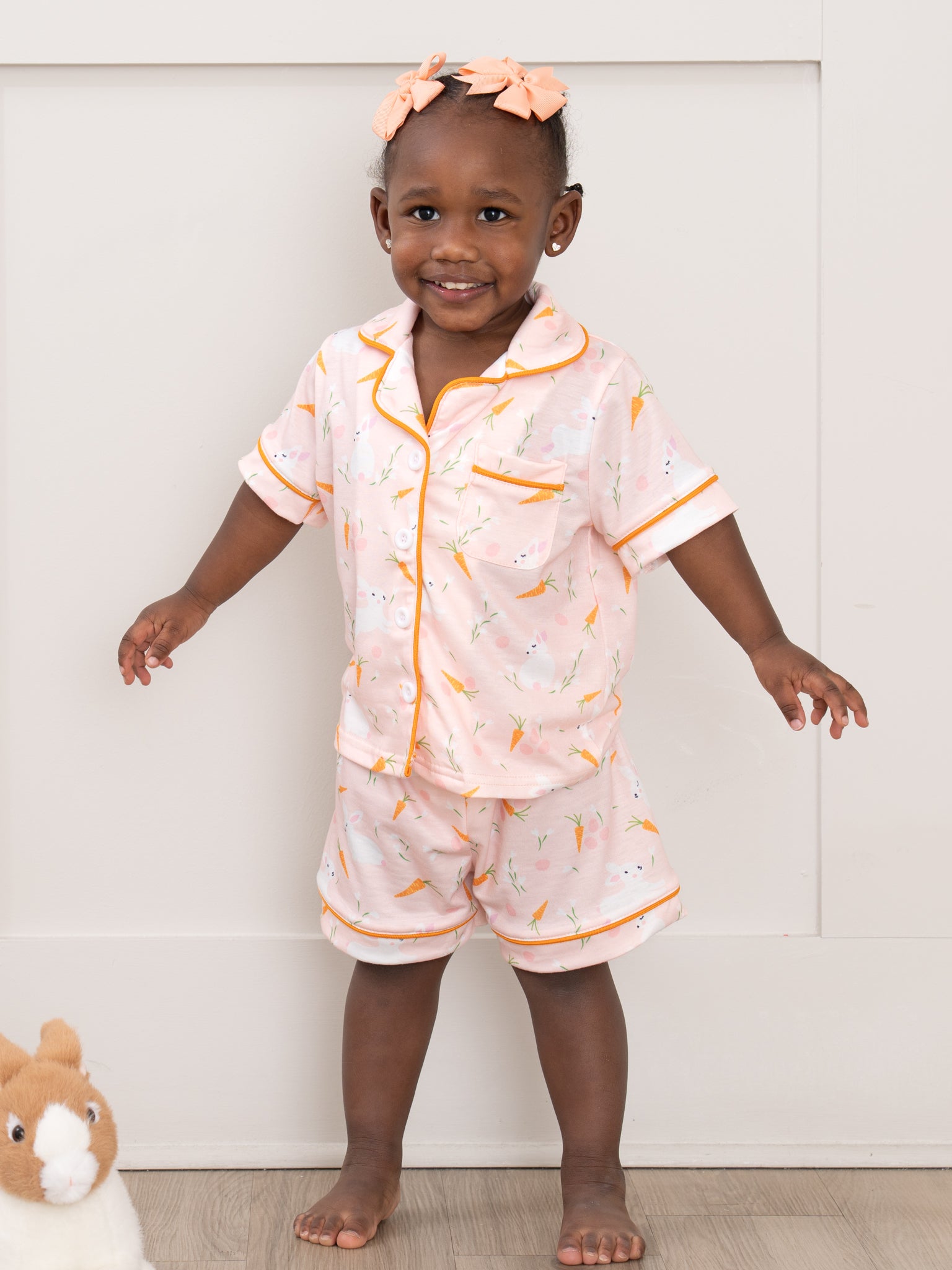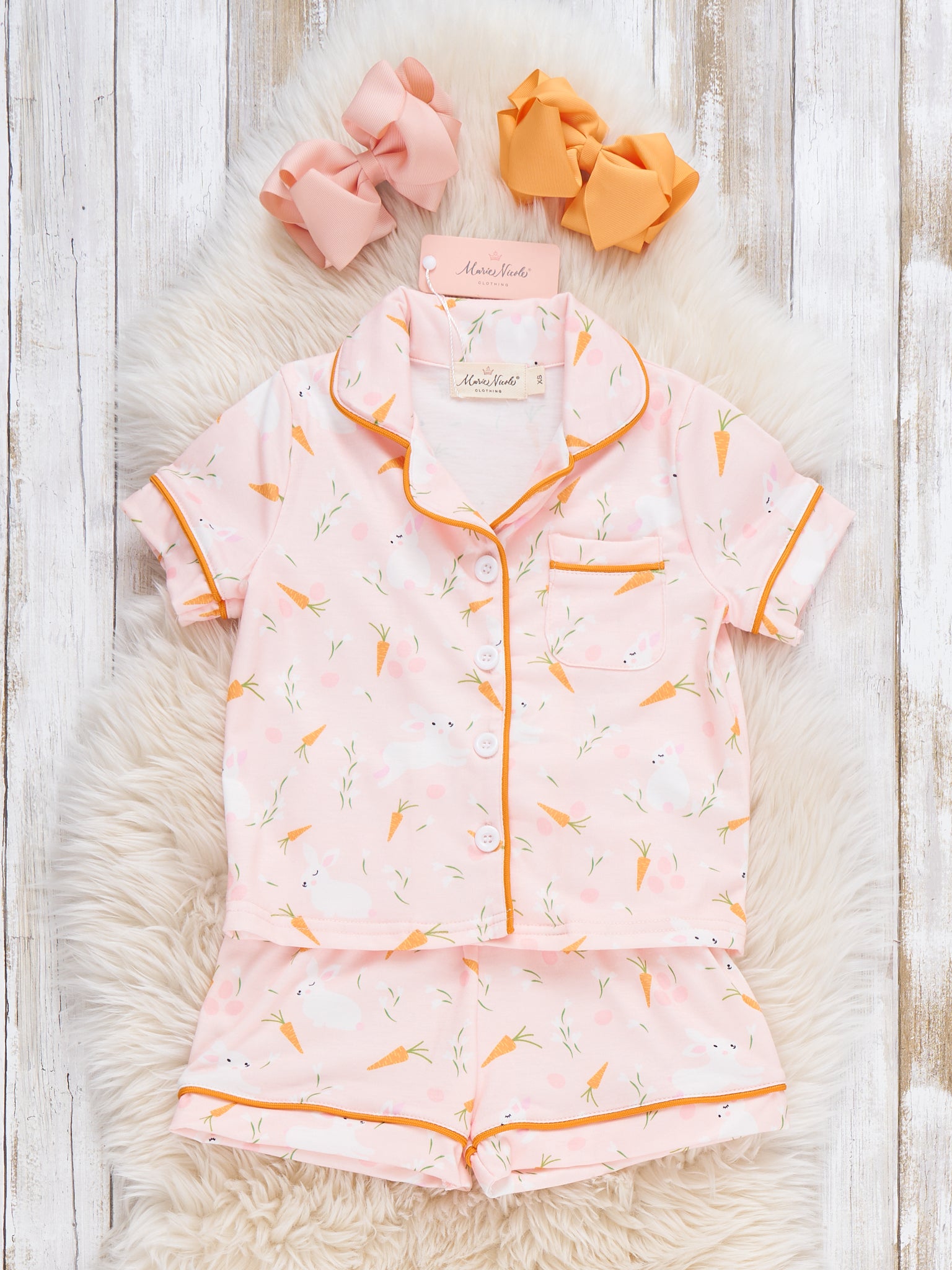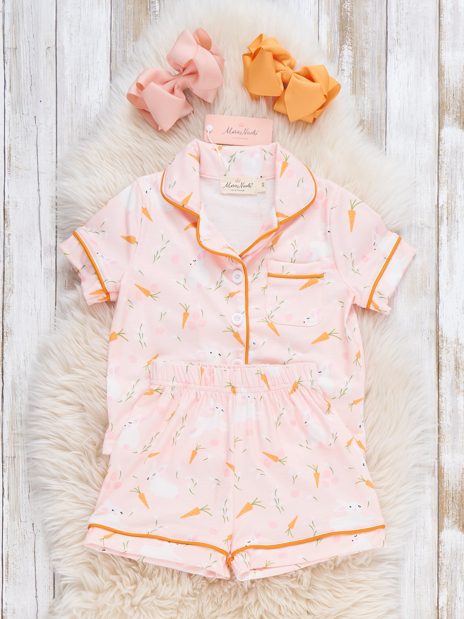 The Bedtime Bunny Carrot Pajamas by Marie Nicole Clothing is so adorable! This two-piece set features a playful bunny and carrot print on a soft peach background with solid piping details, a classic short-sleeve, notched-collar top, and elastic-waist shorts, offering a cheerful and cozy pajama set for kids.
