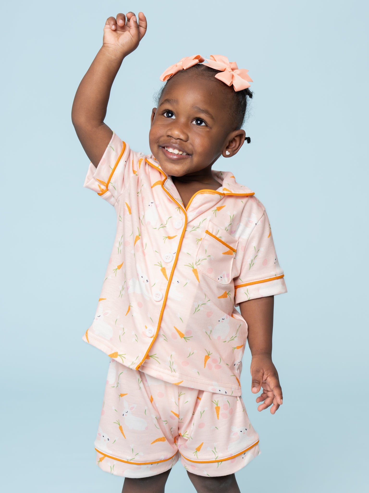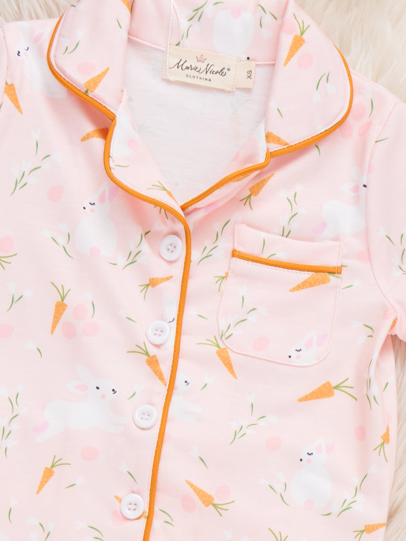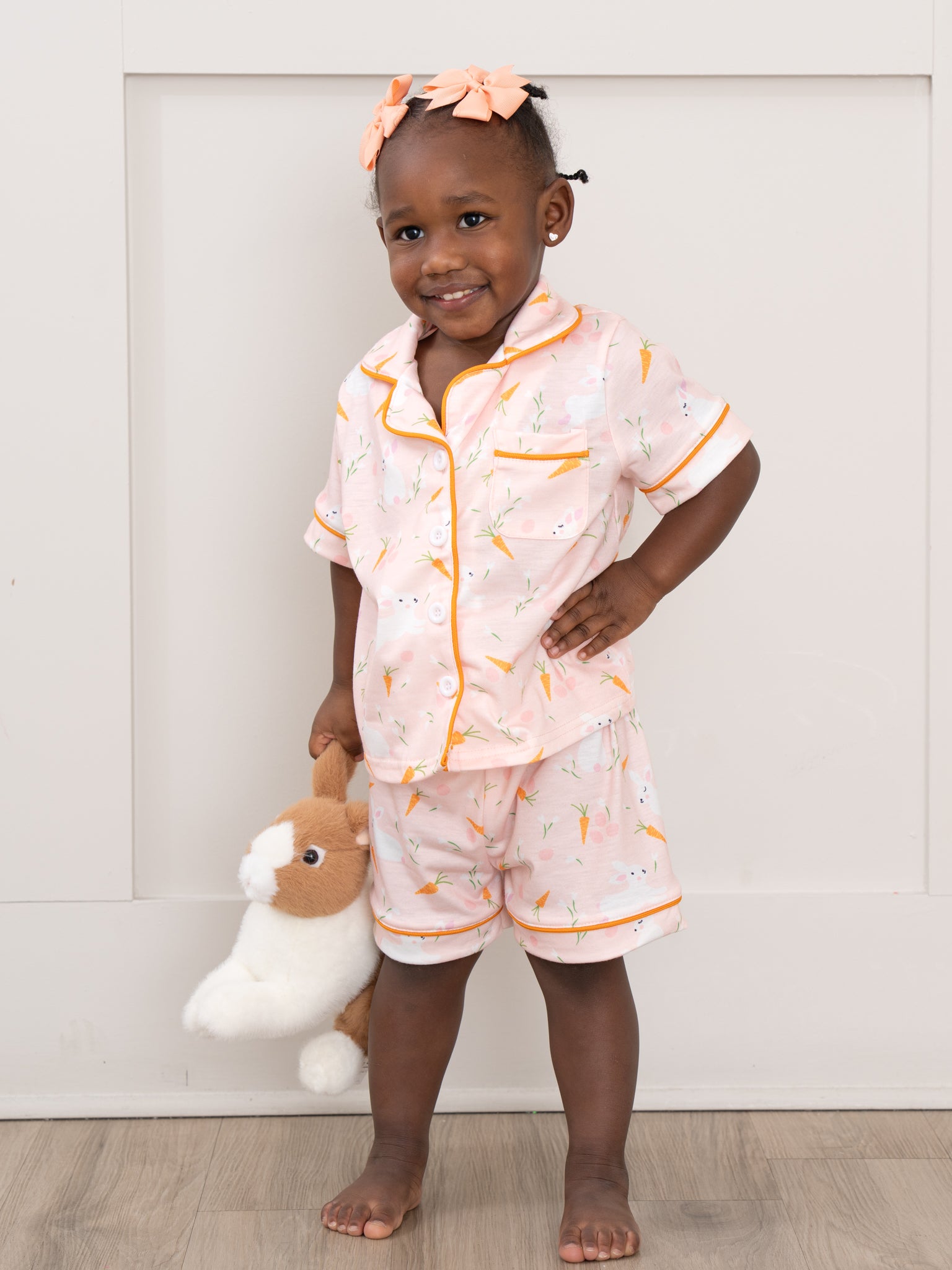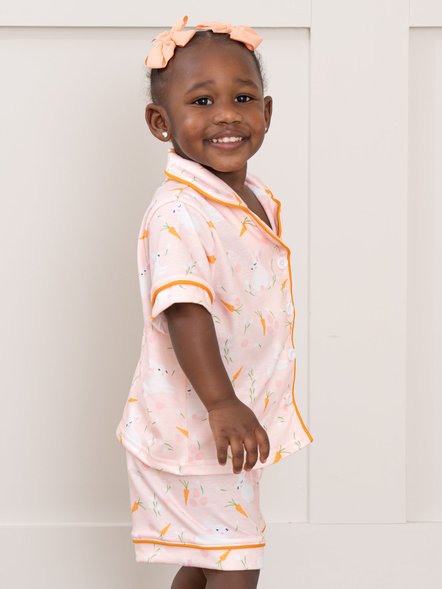 The Bedtime Bunny Carrot Pajamas by Marie Nicole Clothing is so adorable! This two-piece set features a playful bunny and carrot print on a soft peach background with solid piping details, a classic short-sleeve, notched-collar top, and elastic-waist shorts, offering a cheerful and cozy pajama set for kids.