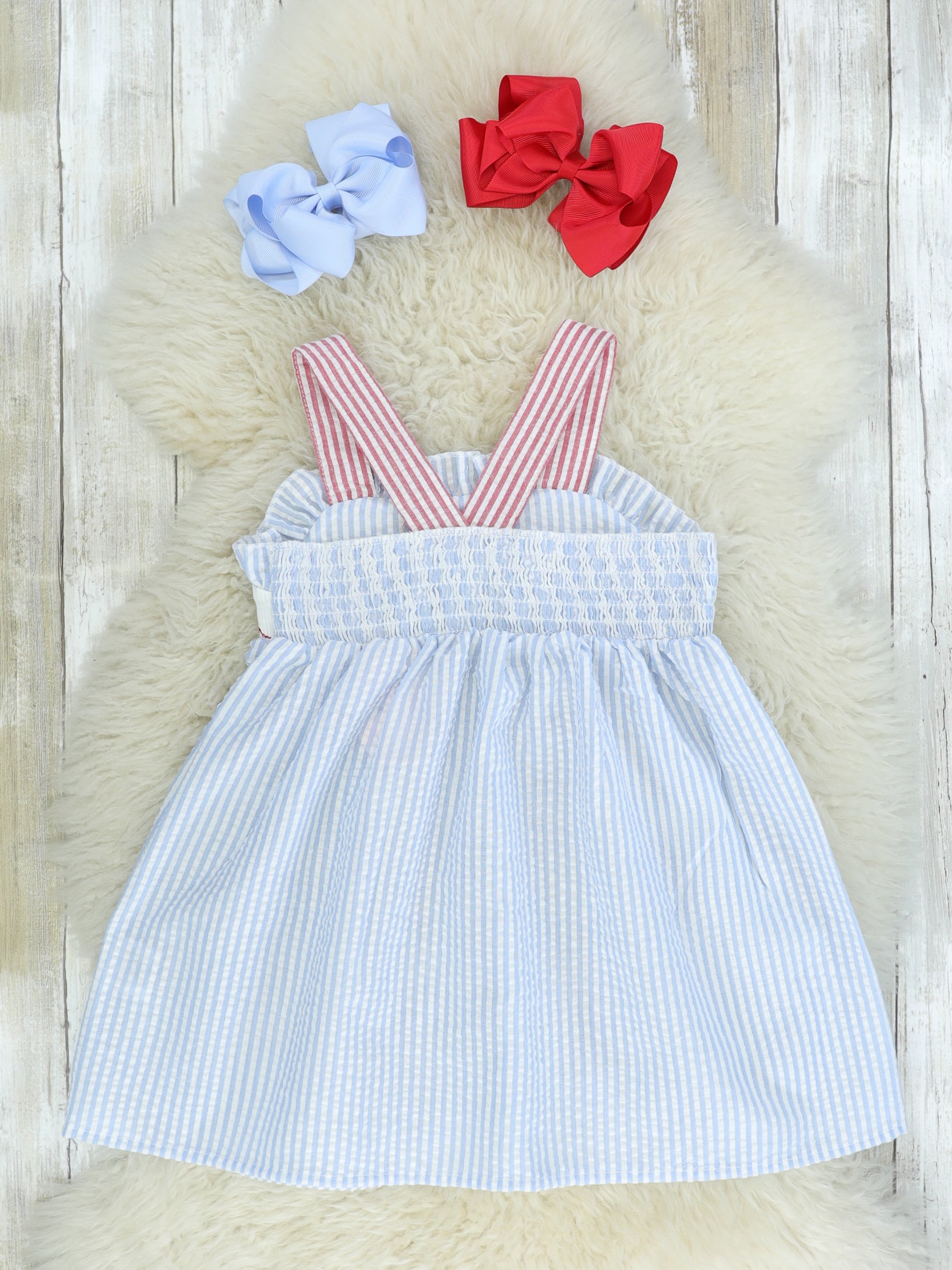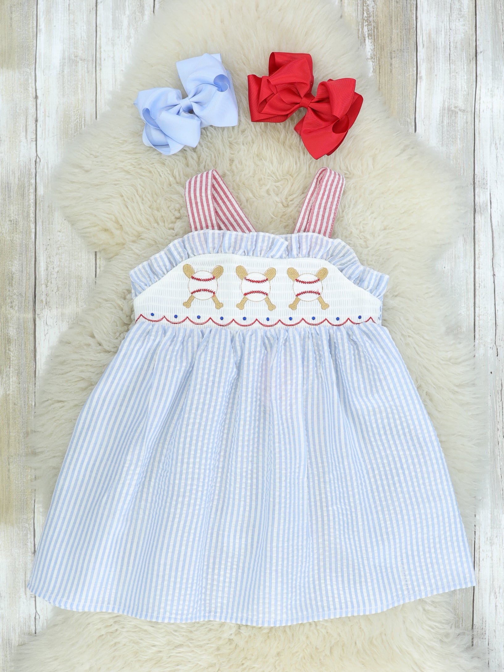 The most adorable baseball sister set for your sisters to match in while they watch their brother play baseball! We love the smocked and baseball details on this pinstriped dress!