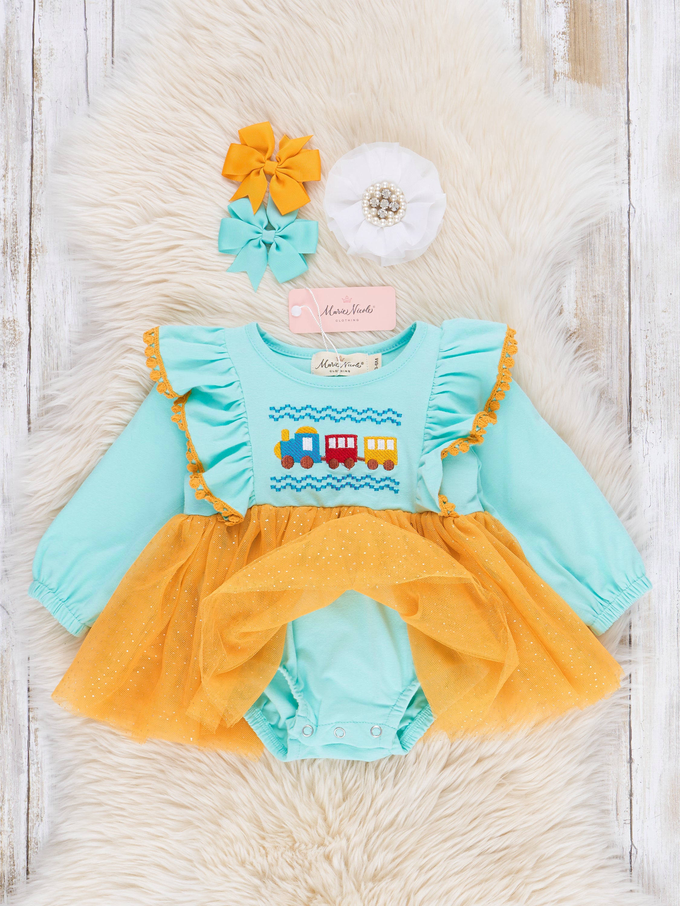 Teal & Yellow Embroidered Trains Tulle Bubble