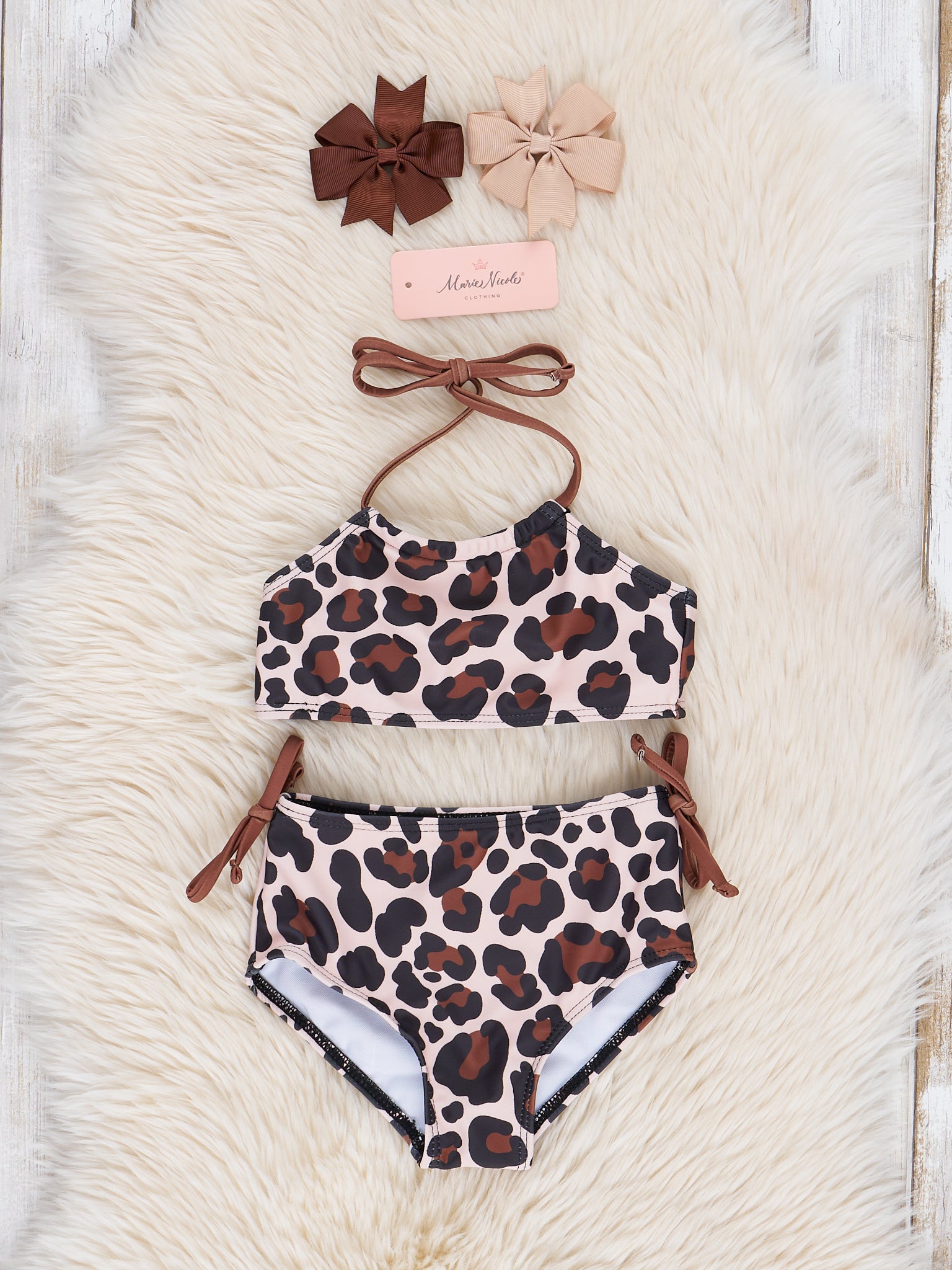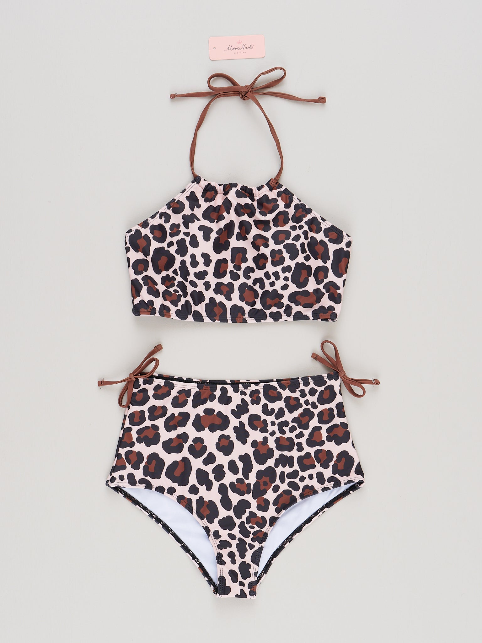 The cutest swimsuit for you & your little one! This two-piece by Marie Nicole Clothing is tan with a leopard print design, a halter neckline, & an adjustable tie.