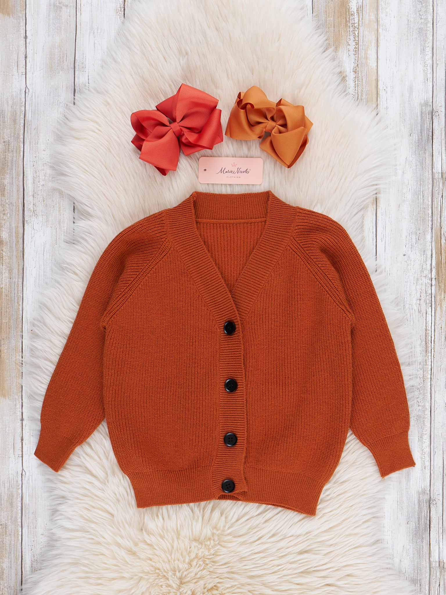 Button up and match your mini for this year's sweater weather with the Mom & Me Orange Button-Up Sweater! This orange cardigan by Marie Nicole Clothing features is absolutely cozy and so soft. In a warm orange shade, it makes for a lovely piece to layer with any outfit this fall!