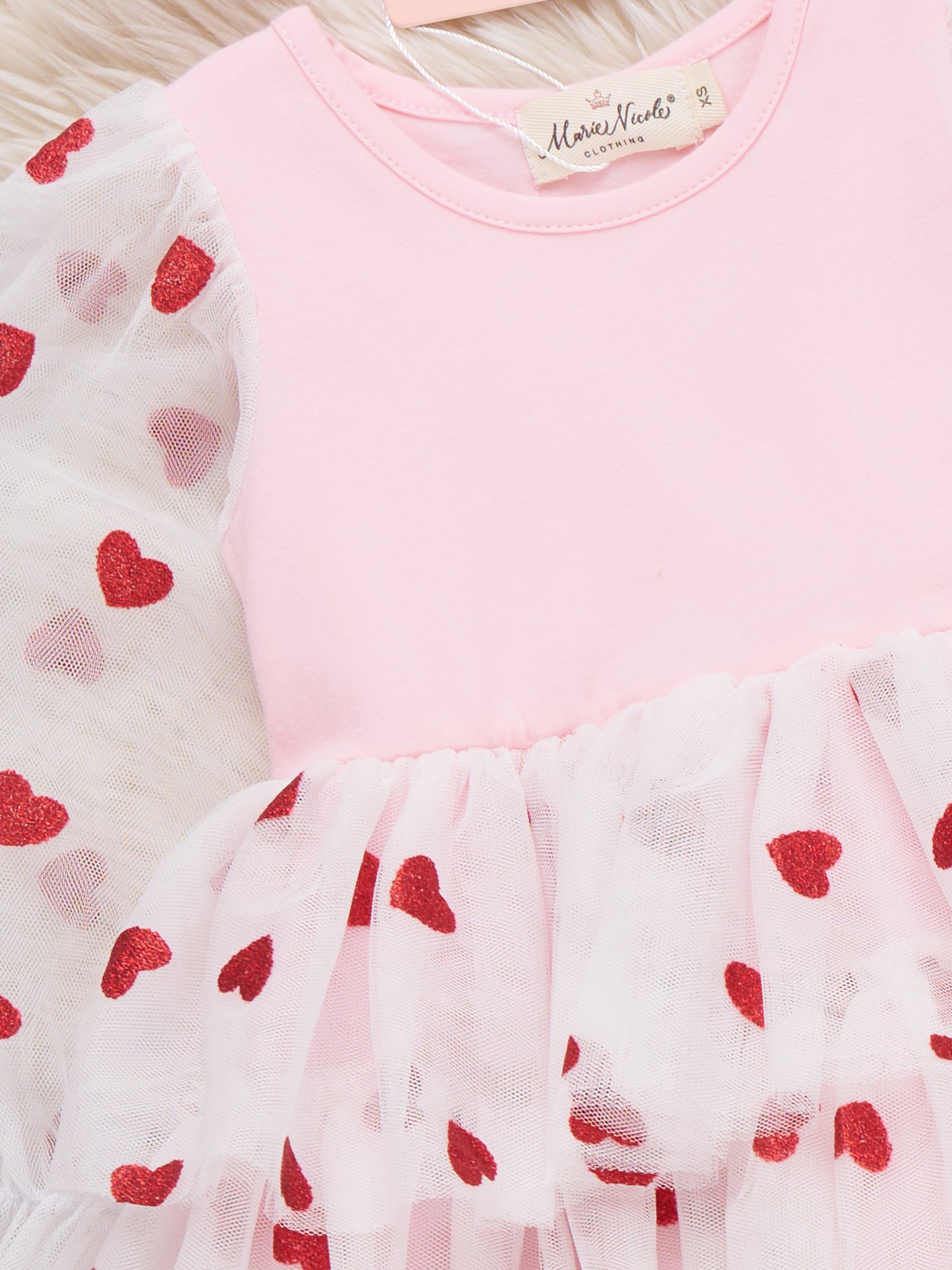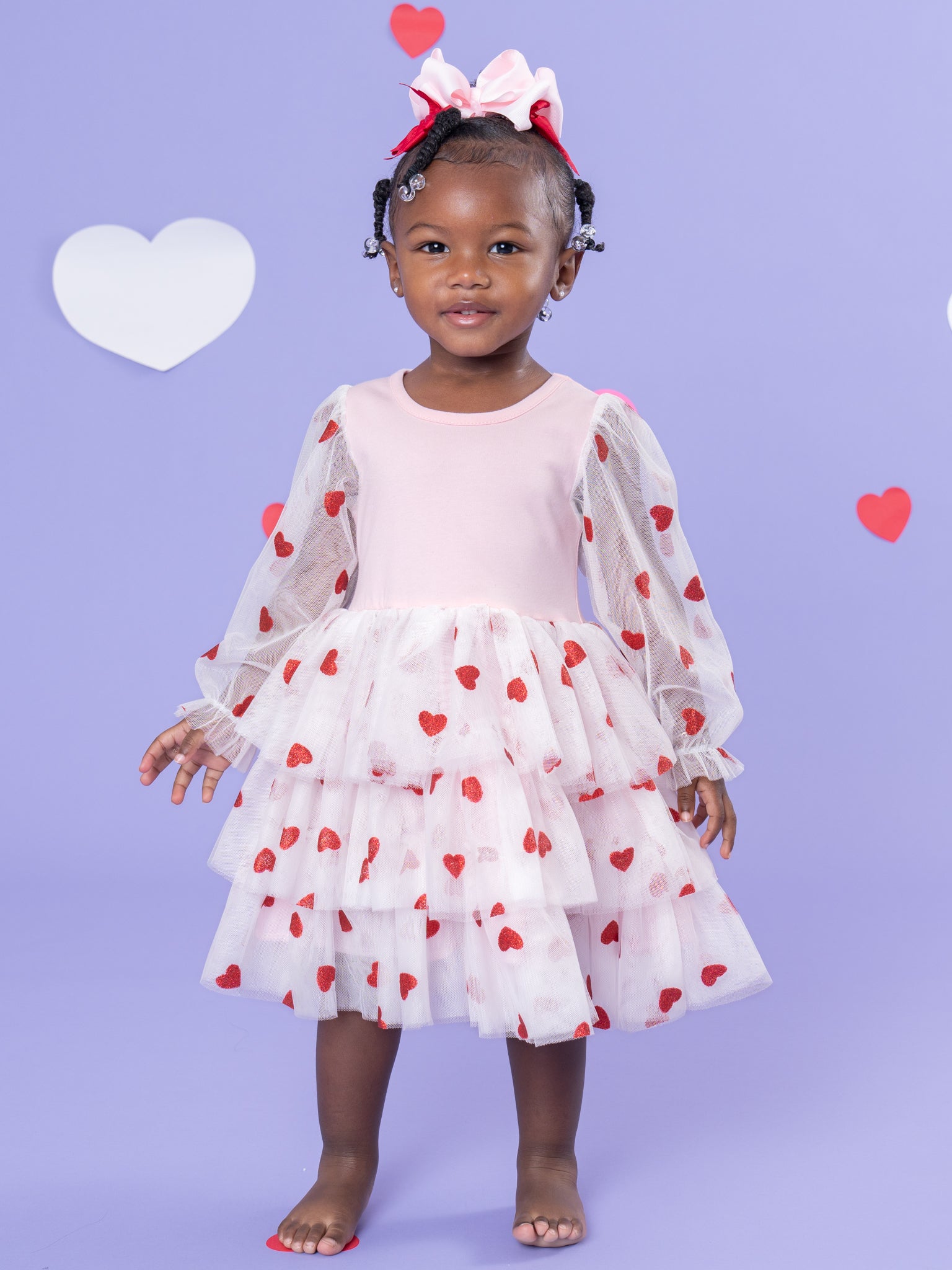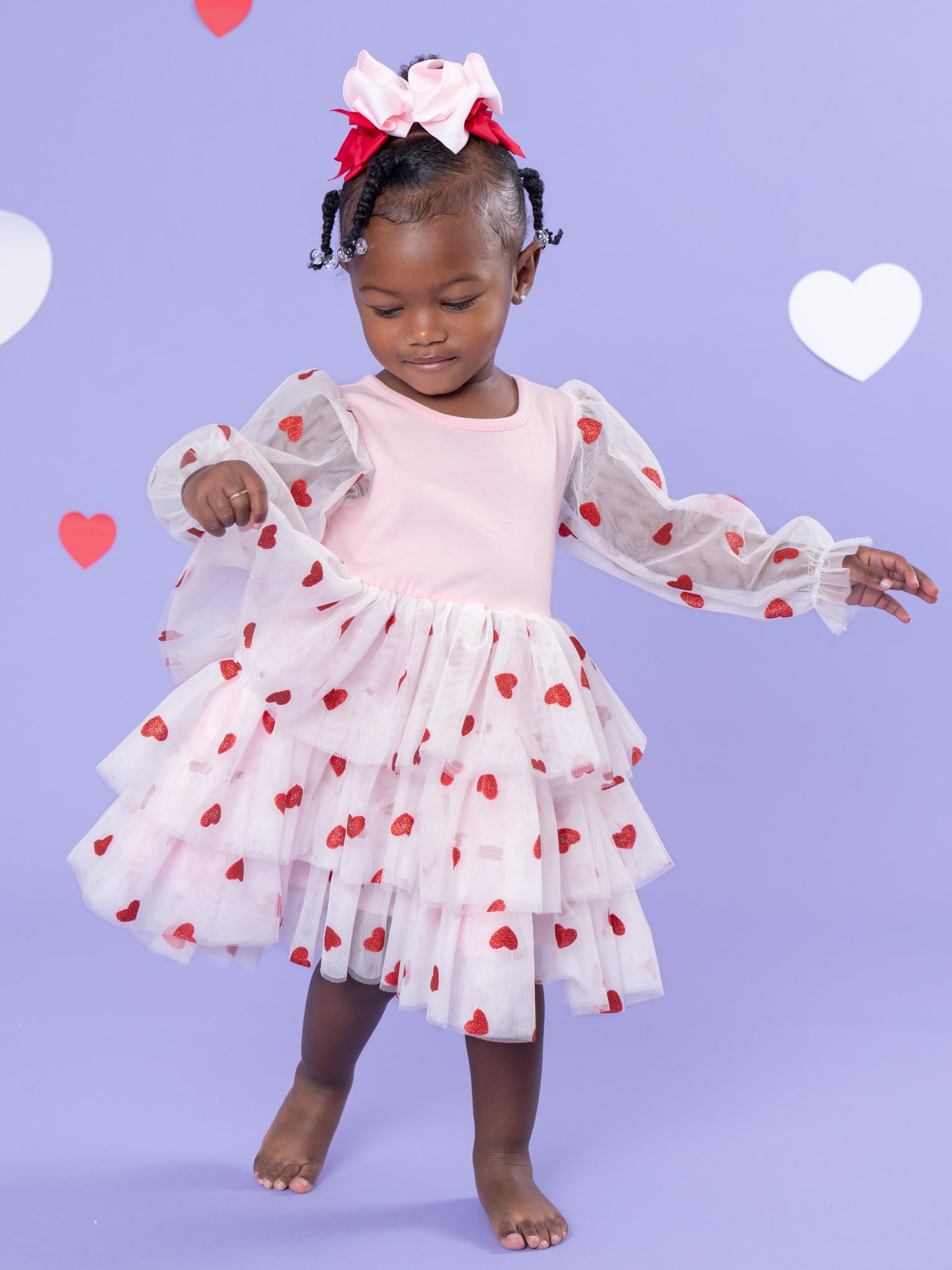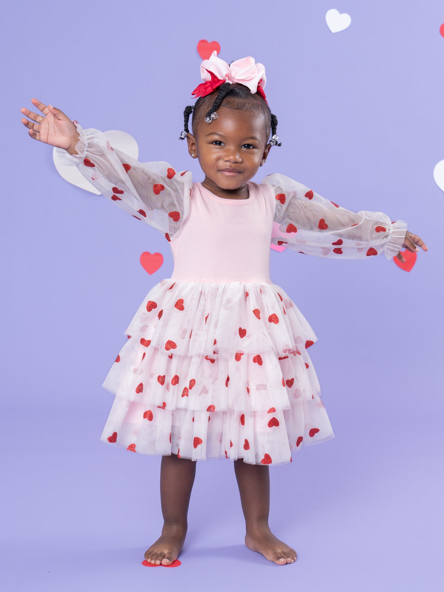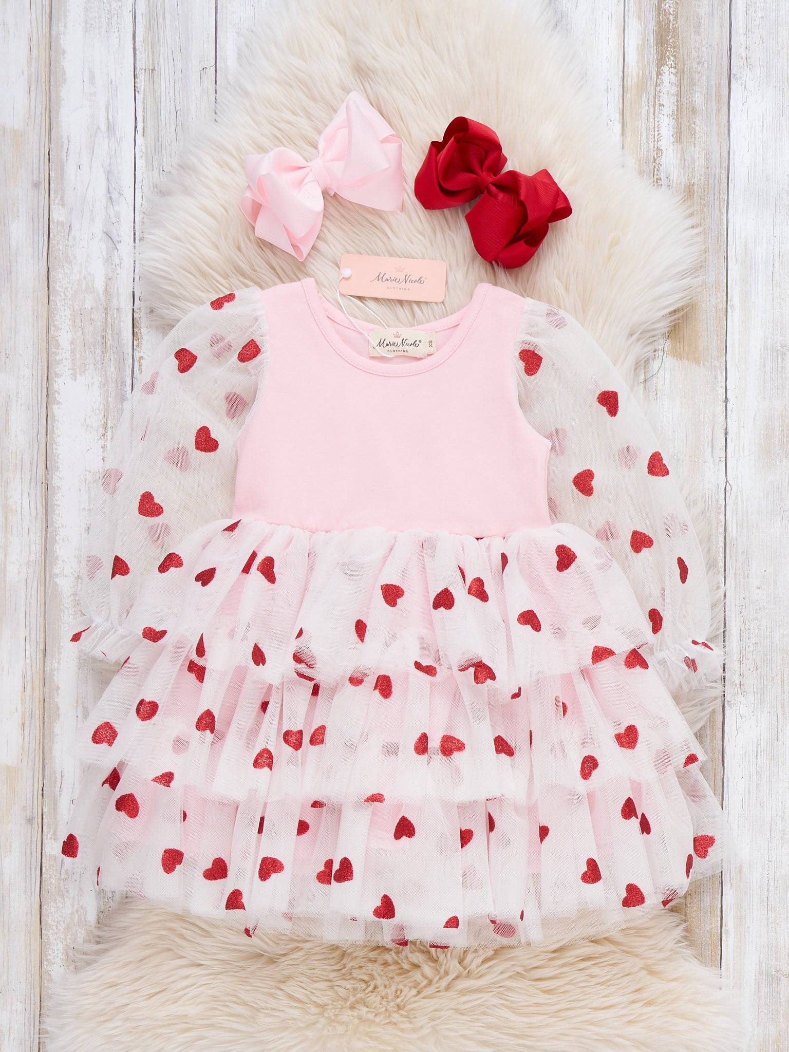 The Love Letters Puff Sleeve Dress by Marie Nicole Clothing features a full, layered tulle skirt with scattered heart details and whimsical sheer puff sleeves. Designed for twirling and joyful celebrations, this enchanting dress blends playful style with comfortable elegance. This piece is perfect for special occasions, parties, and Valentine's Day activities!