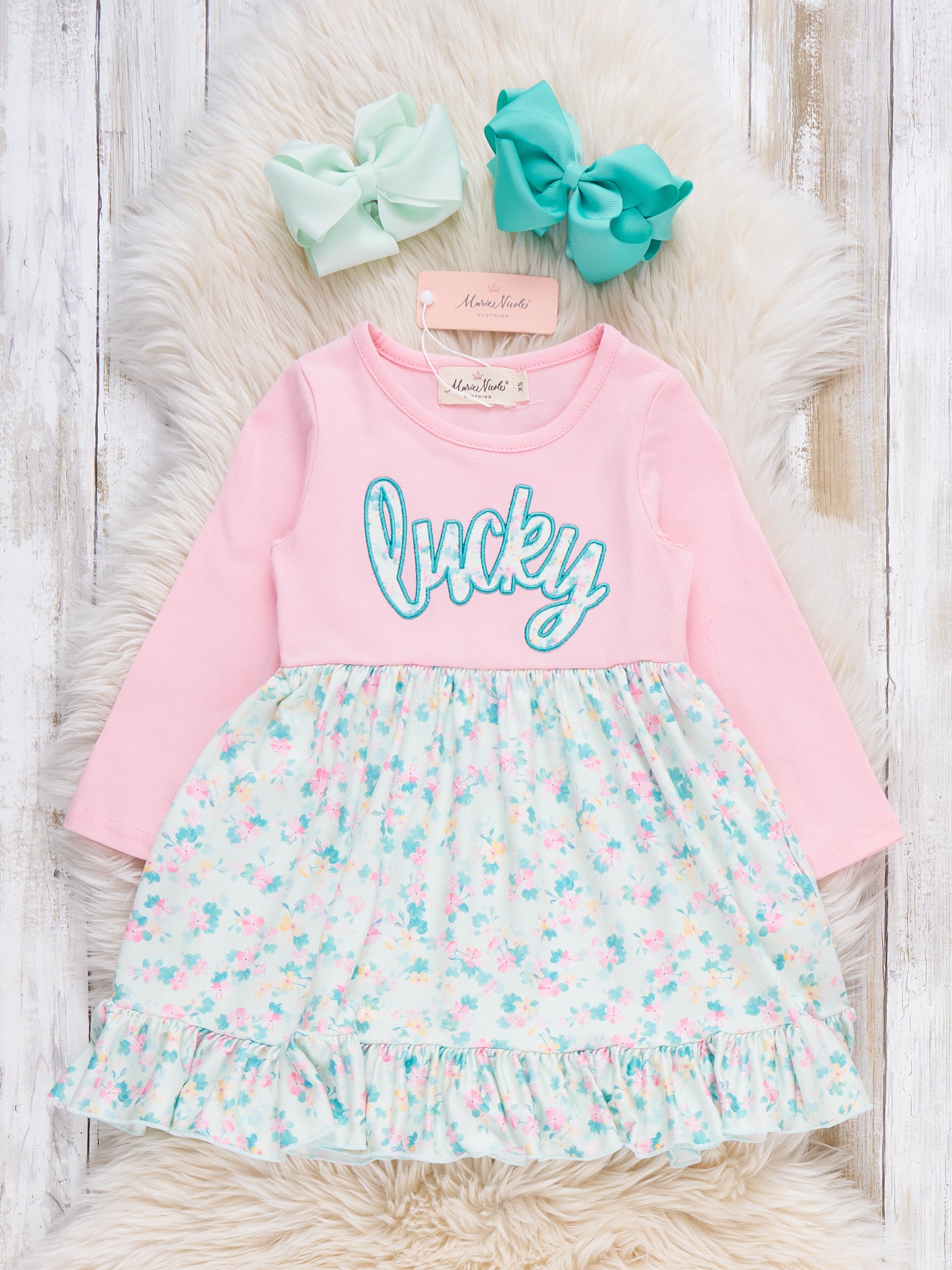 Brighten her day with the Lucky Blooms Embroidered Ruffle Dress by Marie Nicole Clothing. This sweet long sleeve dress features a beautifully stitched "Lucky" script on the bodice and a skirt adorned with a meadow-inspired floral print and charming ruffle hem. Perfect for spring occasions or St. Patrick’s celebrations, it offers comfort and cheerful style in every twirl.