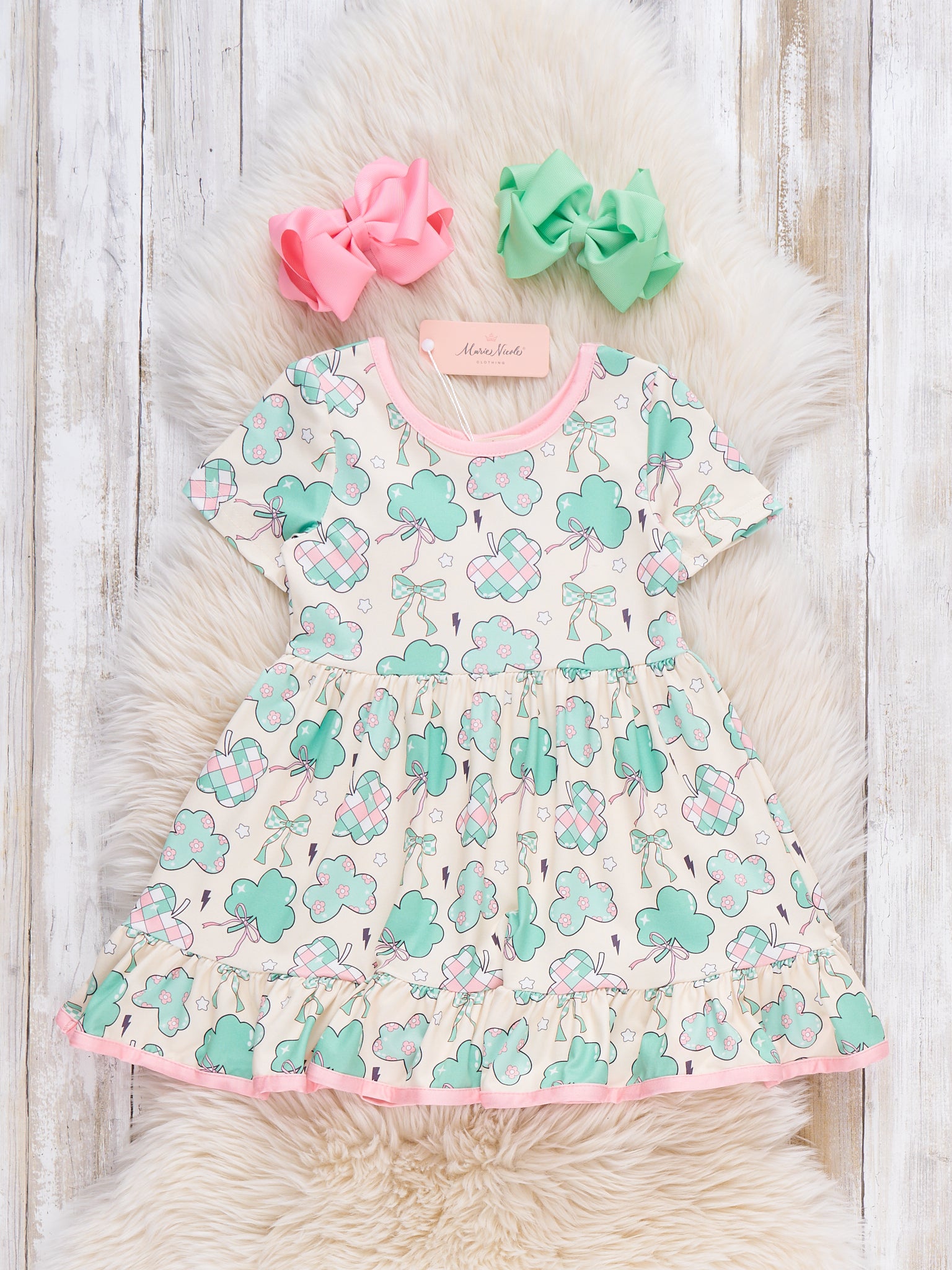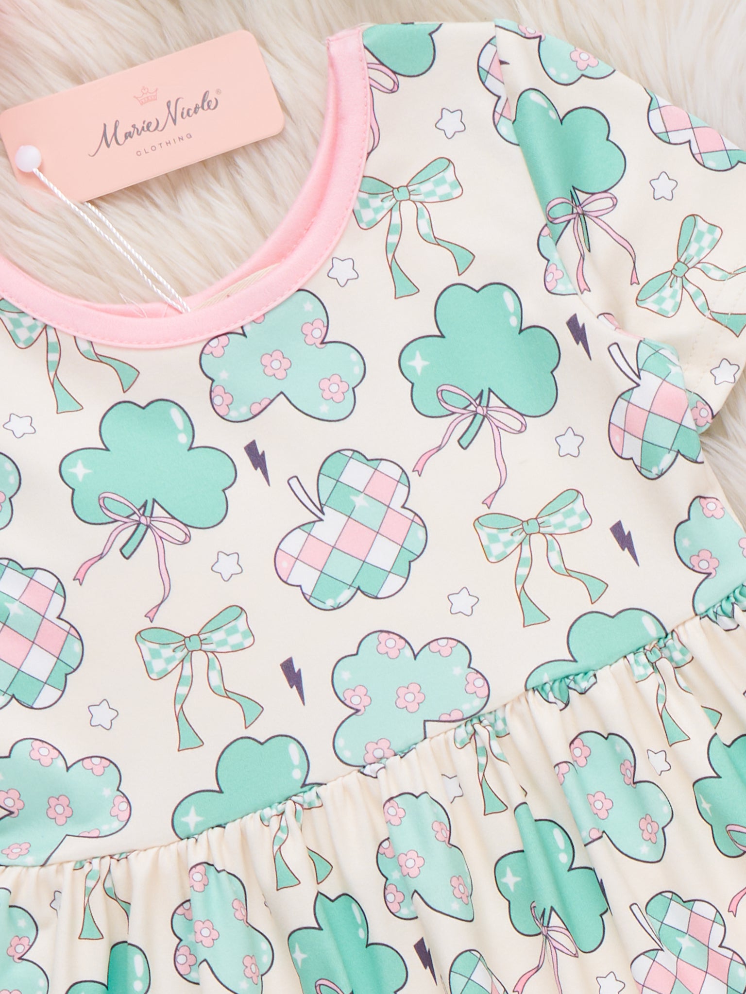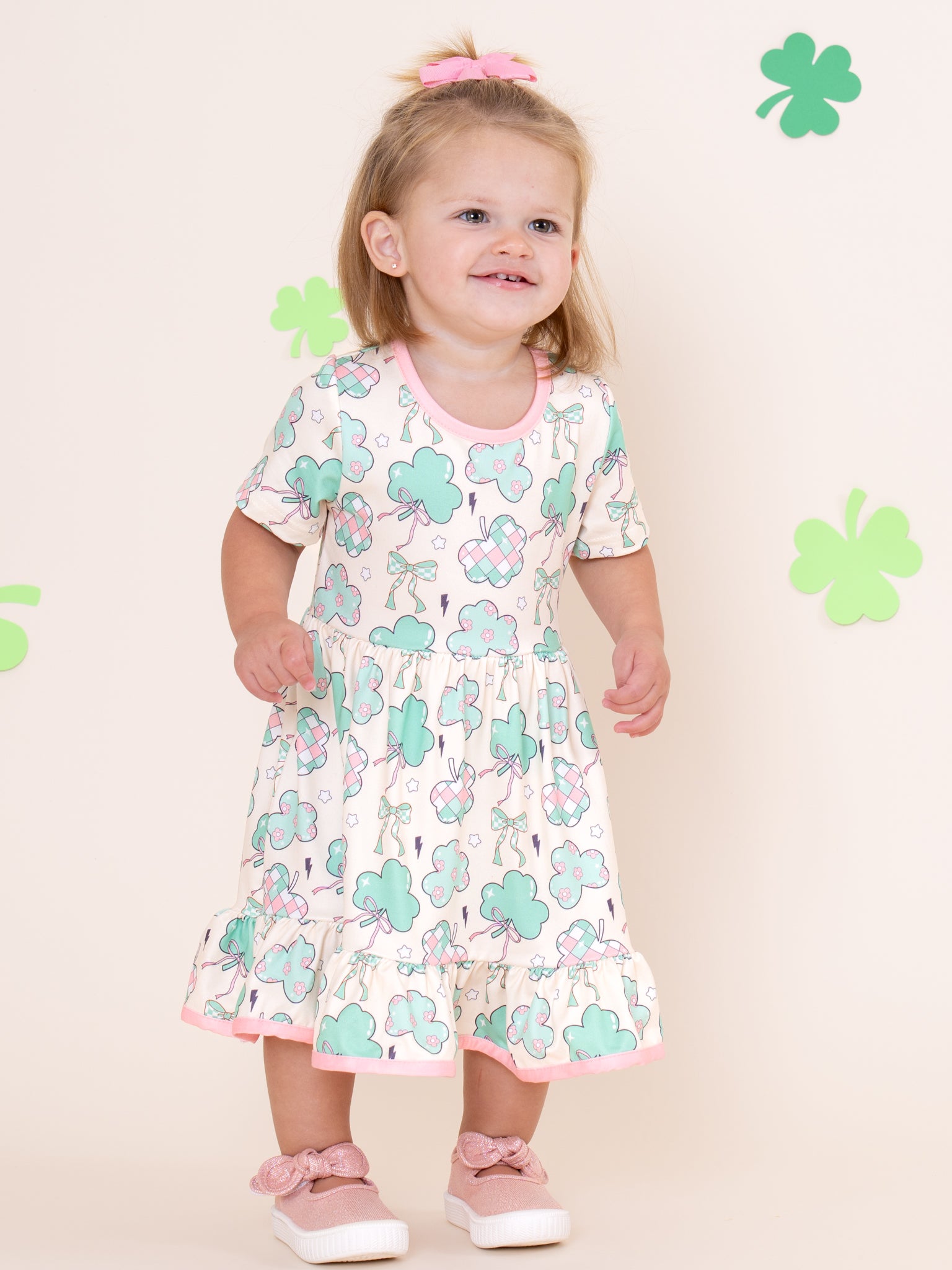 The Lucky Clover Play Dress by Marie Nicole Clothing is a sweet choice for fun outings and festive occasions. Featuring a charming all-over clover and bow print, a ruffled hem, and a soft contrasting neckline, this short sleeve dress is playful, comfortable, and perfect for twirls and creating cheerful springtime and St. Patrick's Day memories.