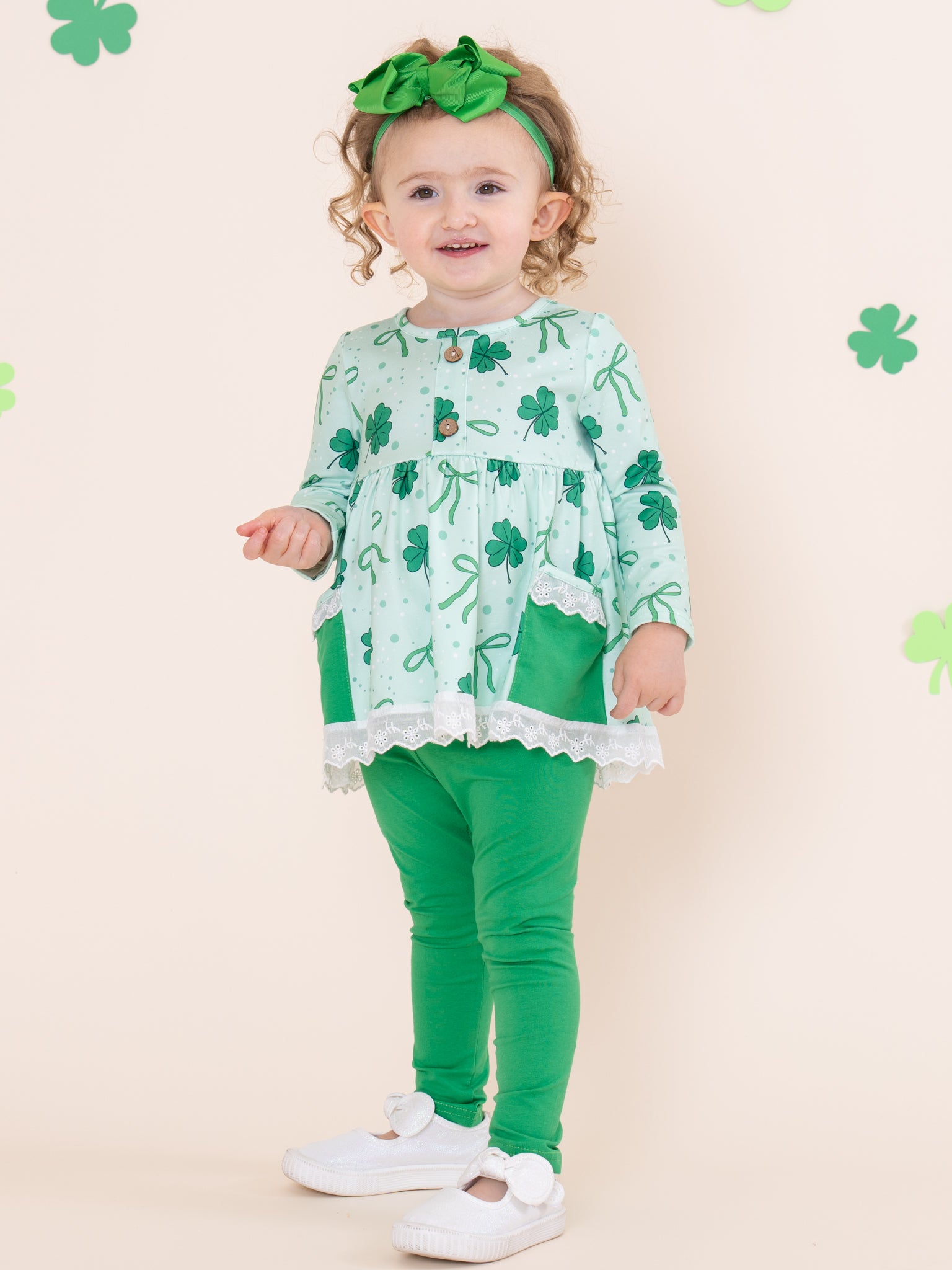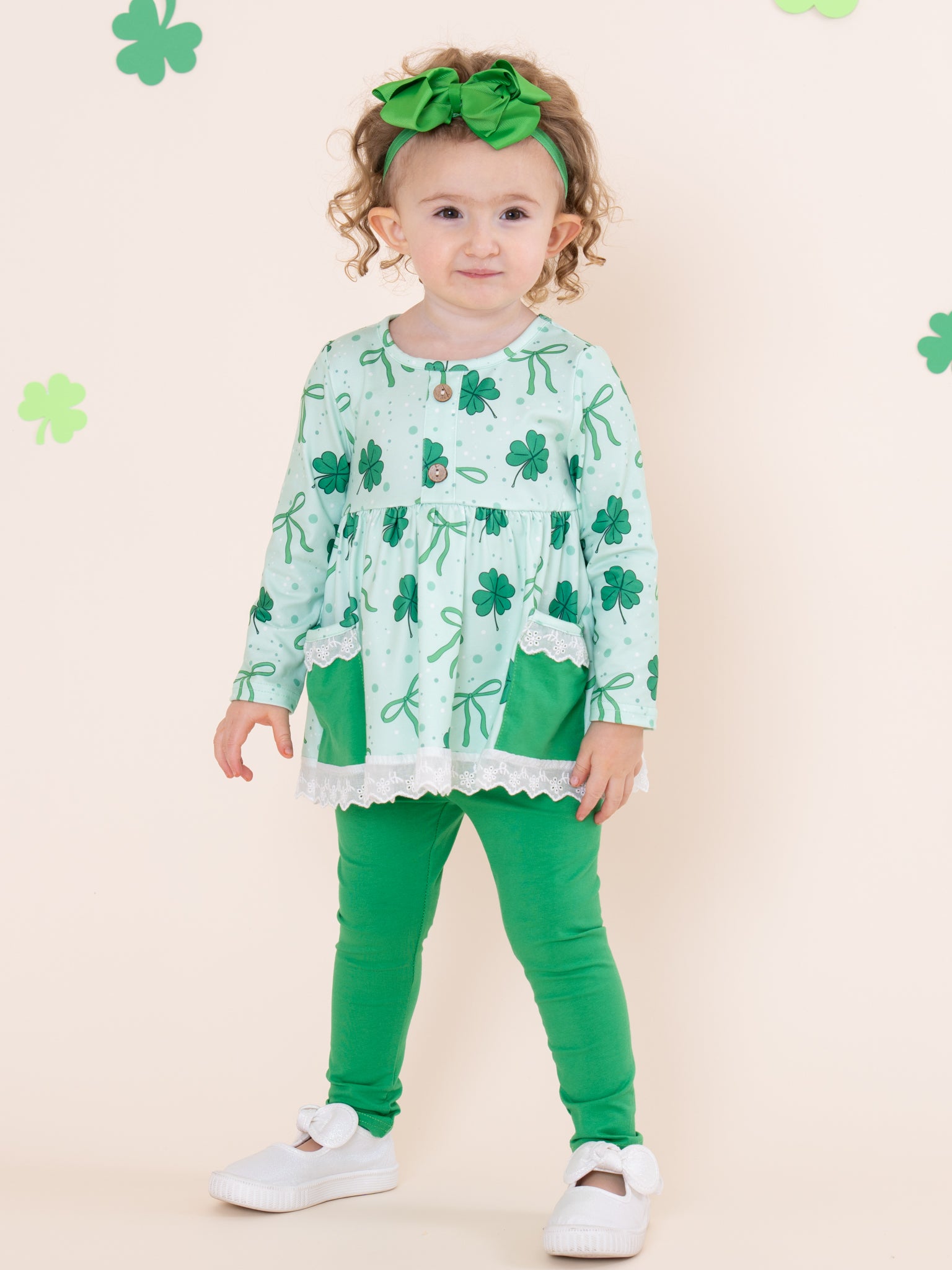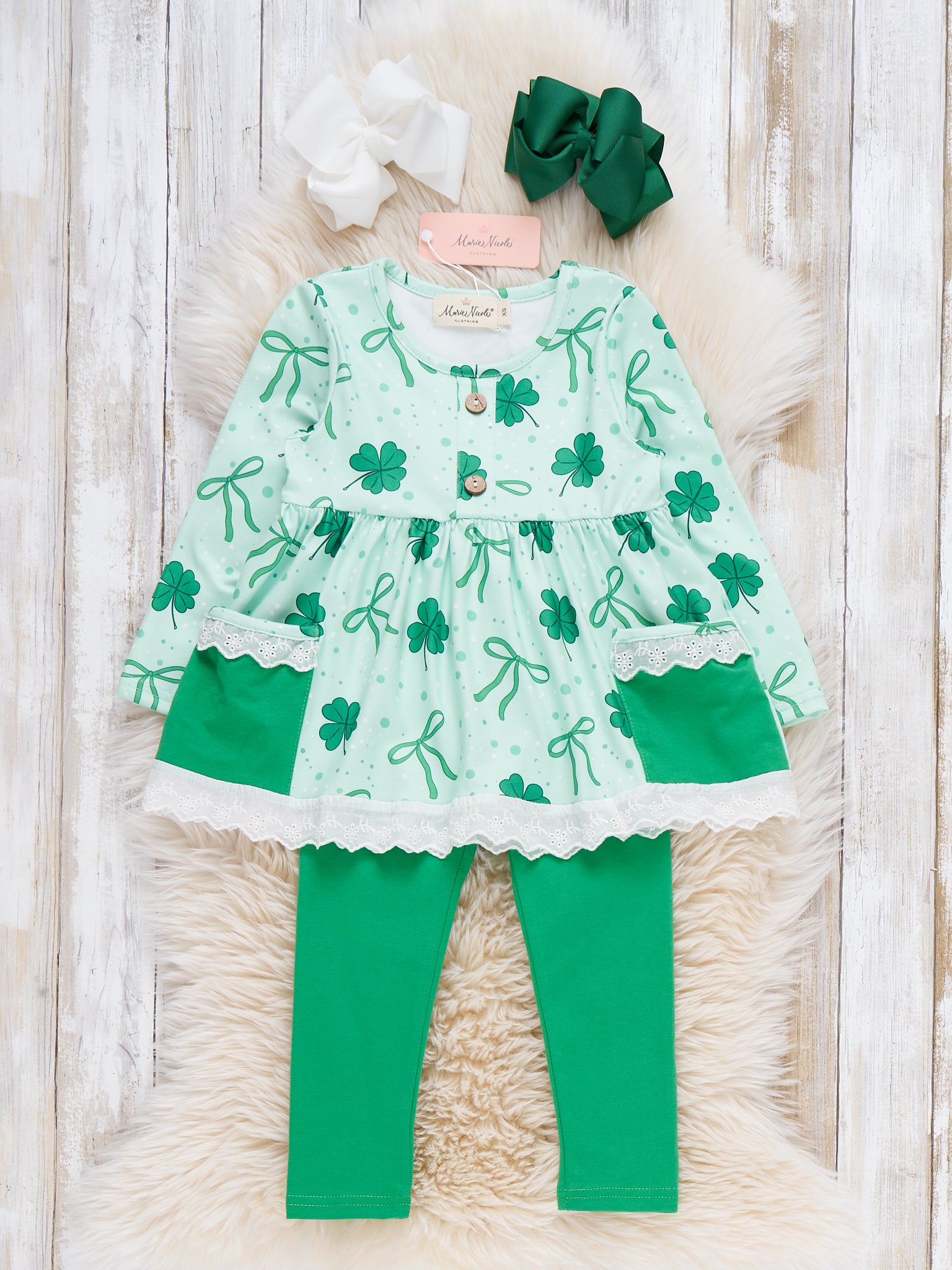 The Shamrock Bow Delight Outfit by Marie Nicole Clothing offers a playful blend of shamrock and bow patterns on the top, paired with cozy matching pants. Designed for both comfort and festive charm, this adorable ensemble is perfect for St. Patrick's Day celebrations or everyday play.