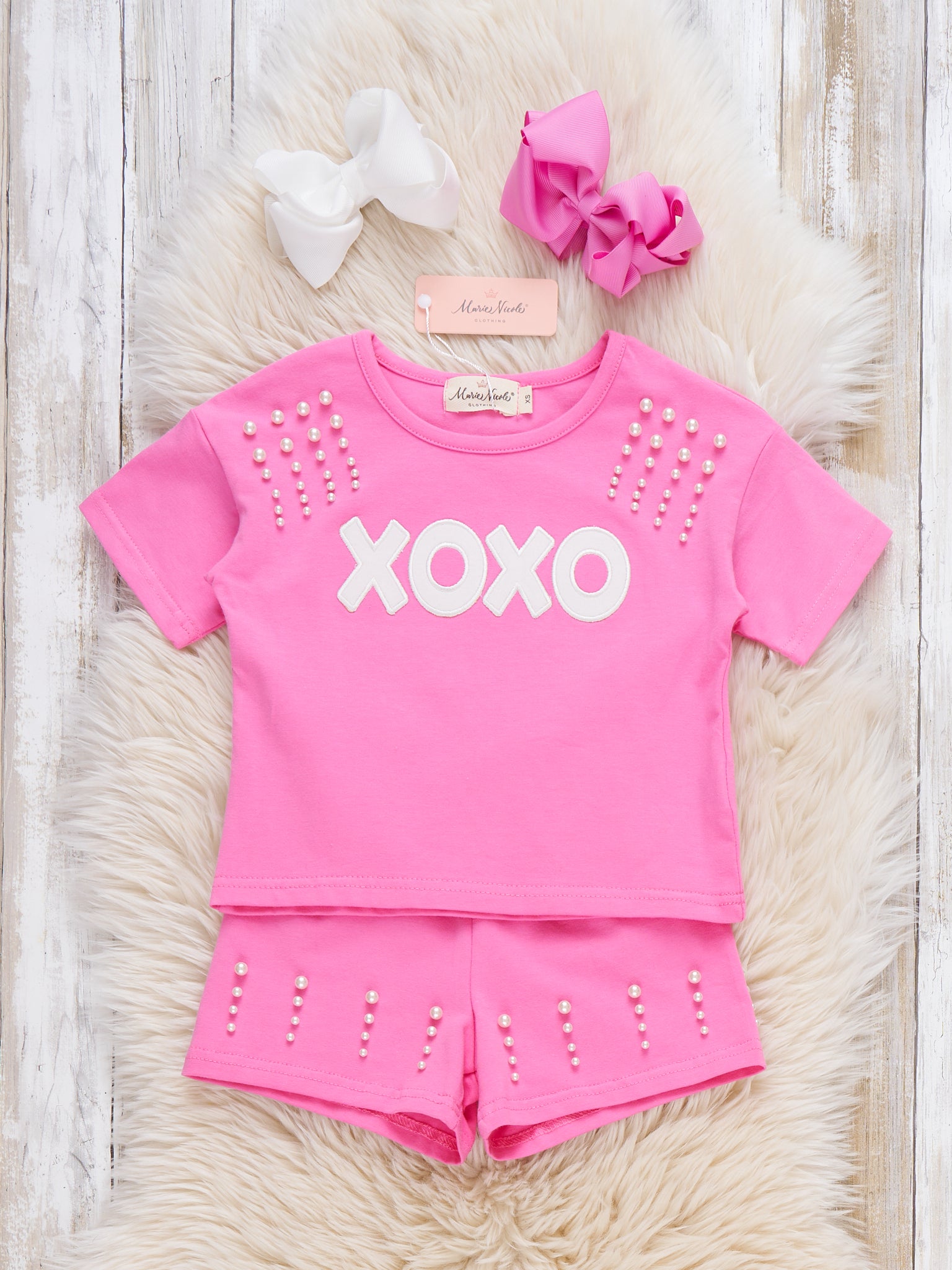 The XOXO Pearl Embroidered Outfit by Marie Nicole Clothing features a playful "XOXO" motif across the top with beautiful pearl accents on both shirt and shorts. Comfortable and cheerful, this set is perfect for family twinning moments or making everyday play extra mom & daughter matching fun.