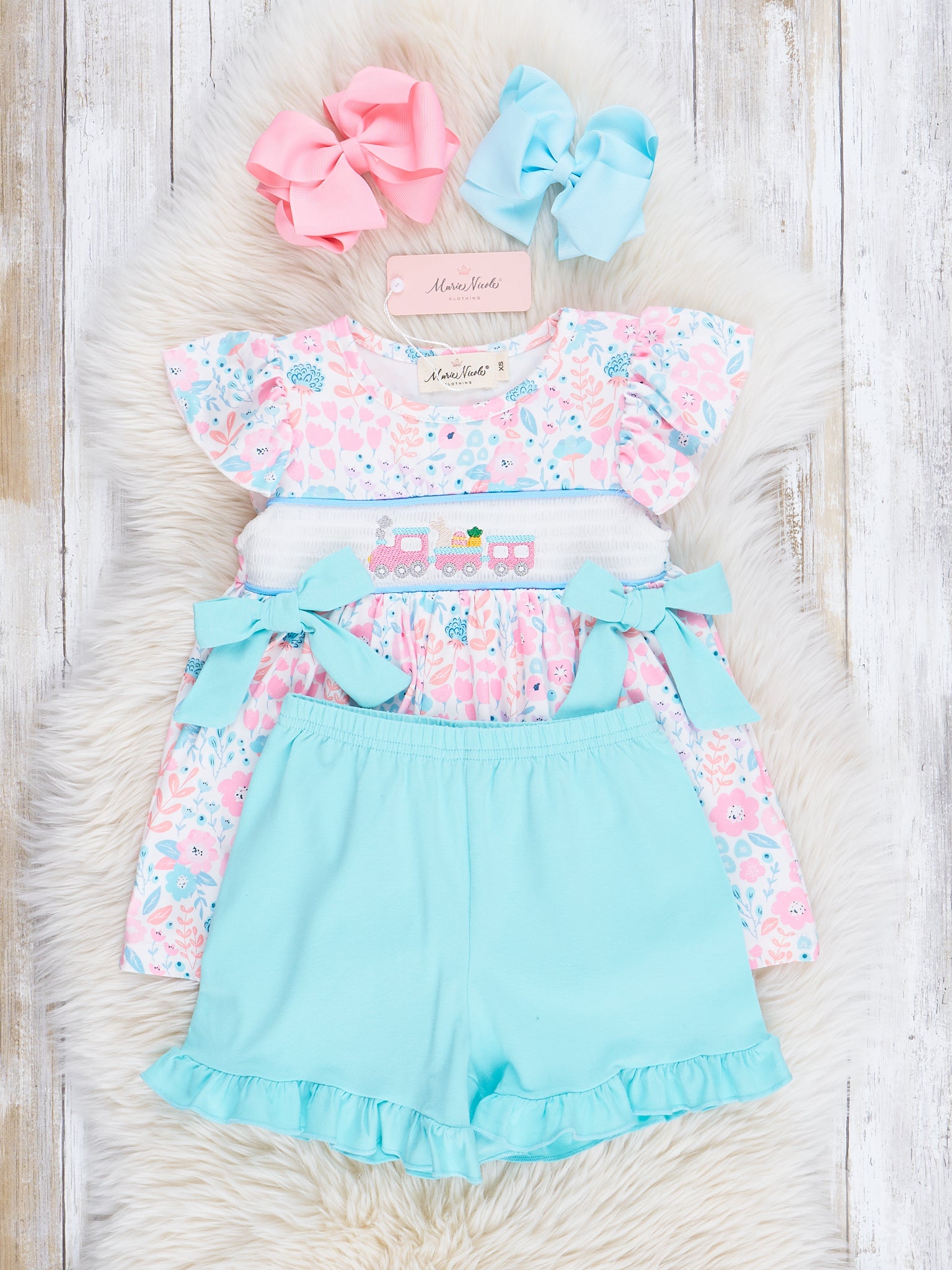Pink & Blue Smocked Easter Train Bloomers Outfit