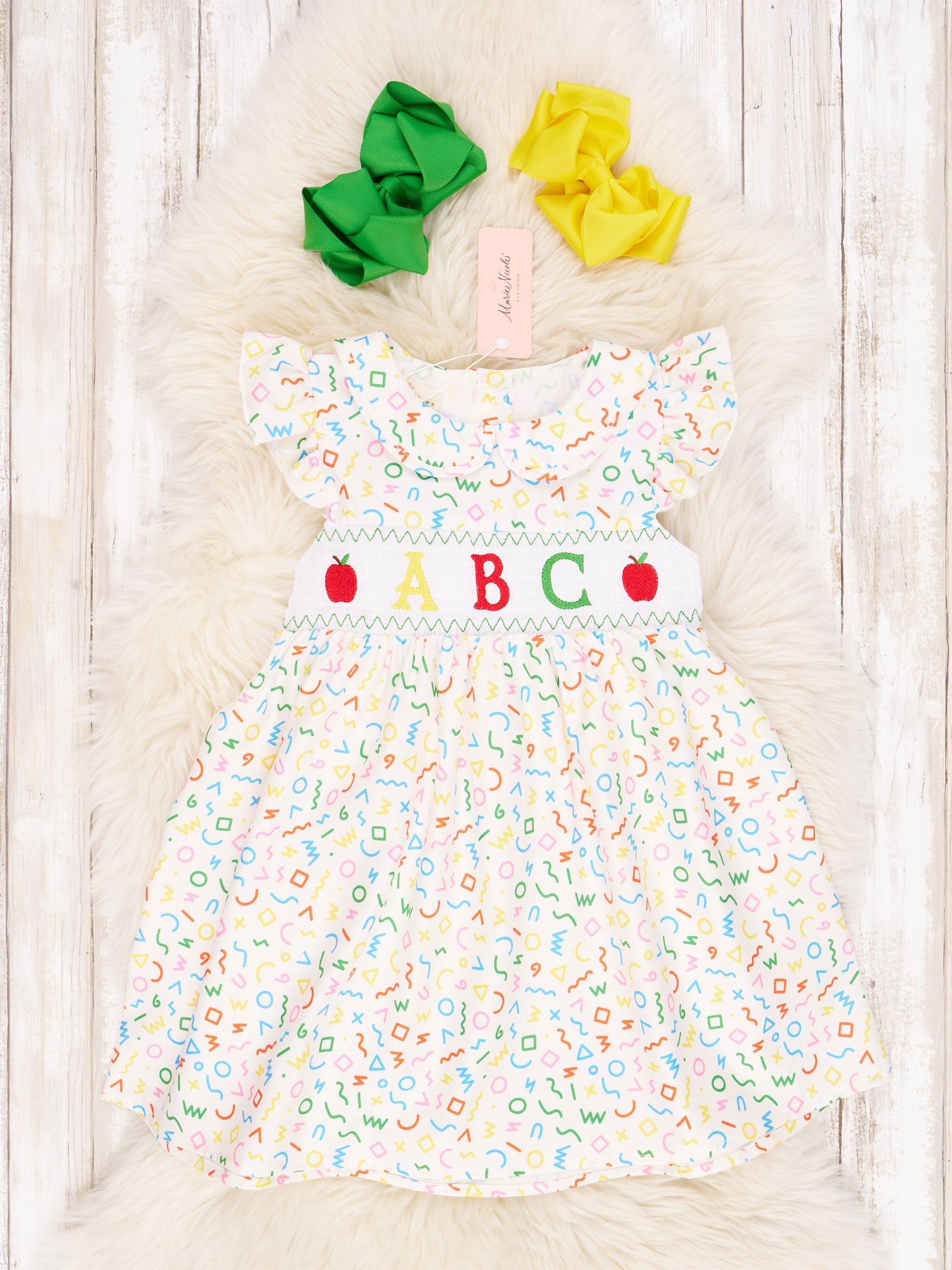Let your little ones match in style with this sister set! This dress features a classic smocking, an embroidered "ABC" with alphabet print, and a peter pan collar and ruffles for an extra dose of cuteness. With a tie at the waist, it's the perfect way to dress your kids in matching fashion!